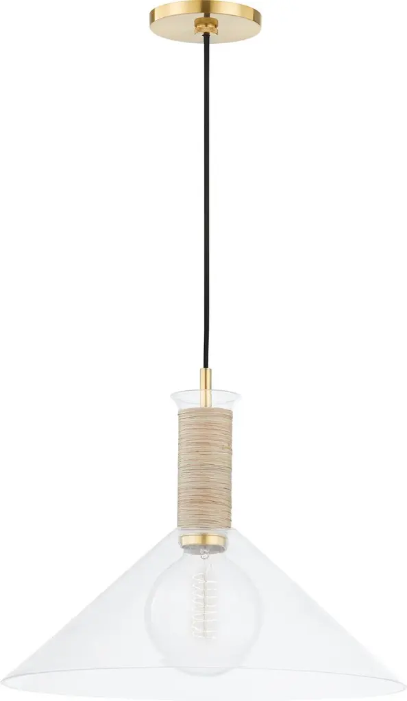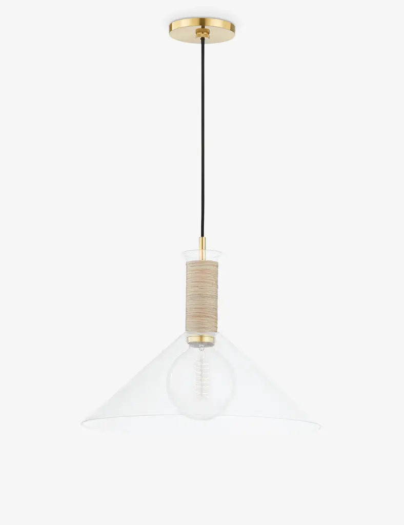 A cone-shaped shade in clean, clear glass lets brilliant, bright light shine through. The elongated neck is wrapped in raffia and the cord is made of black cloth, giving the piece little "kisses" of natural design. This pretty pendant looks casual yet feels sophisticated, making it a perfect choice for many interior styles. Features