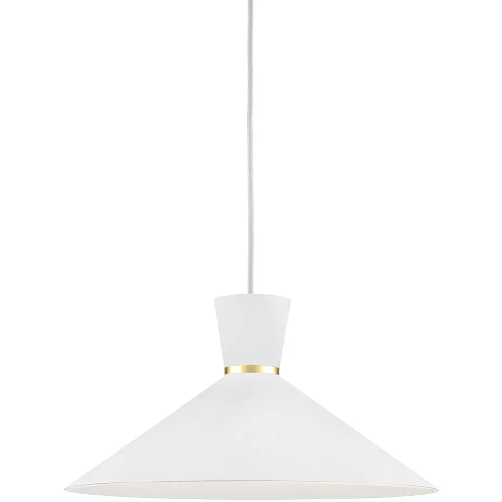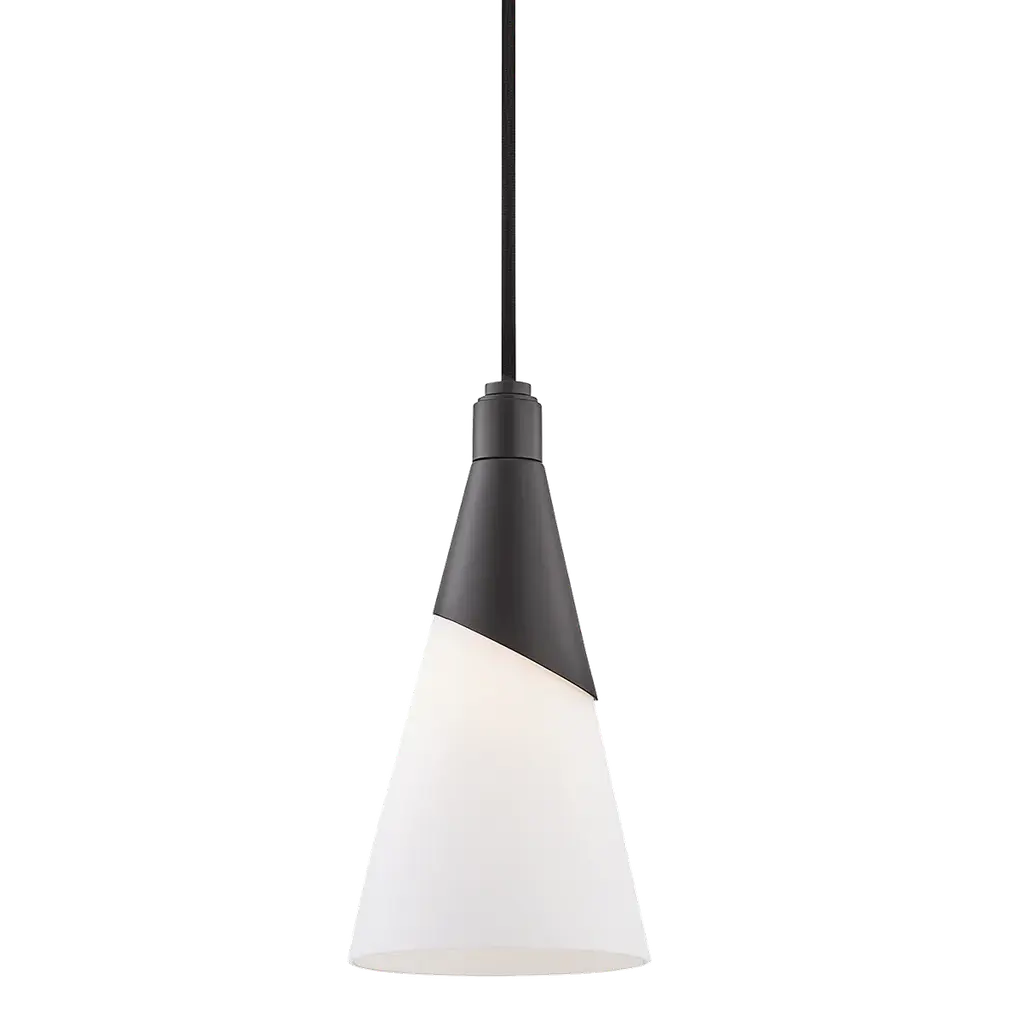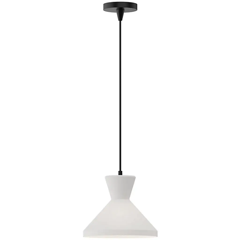 The Betty Pendant from Alora Mood presents an upbeat attitude accompanying retro-style character. Held in place by a circular steel canopy with a small cone center, it transmits a single cable to strong lamping confined by an engaging matte opal glass shade assembled from different-sized conical sections interposed into a single-piece offset hourglass. The broad lower flare of the shade cuts glare to the sides, transmitting an artful mix of reflected radiance and direct downlight below the fixture.