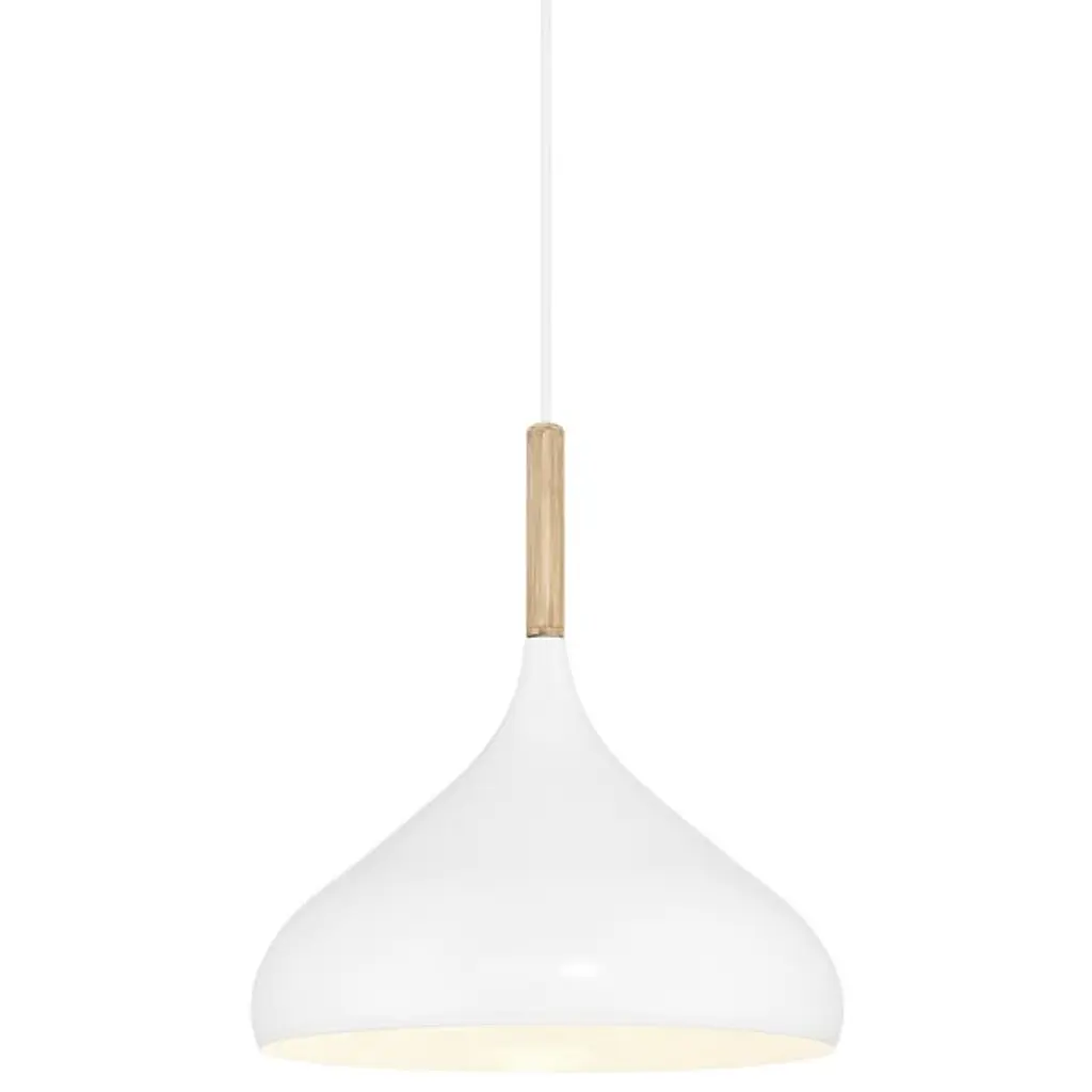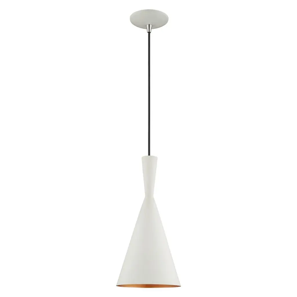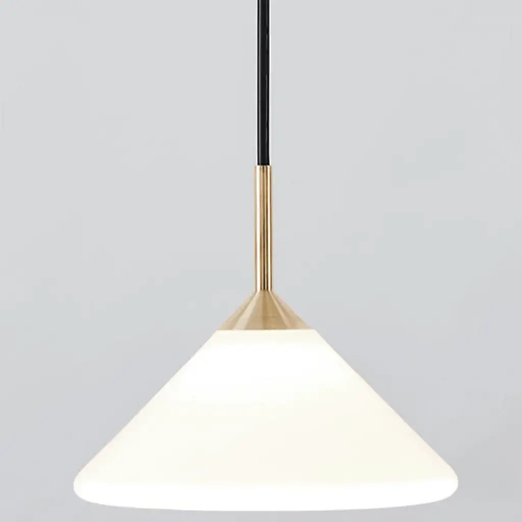 The Betty Pendant from Alora Mood presents an upbeat attitude accompanying retro-style character. Held in place by a circular steel canopy with a small cone center, it transmits a single cable to strong lamping confined by an engaging matte opal glass shade assembled from different-sized conical sections interposed into a single-piece offset hourglass. The broad lower flare of the shade cuts glare to the sides, transmitting an artful mix of reflected radiance and direct downlight below the fixture.