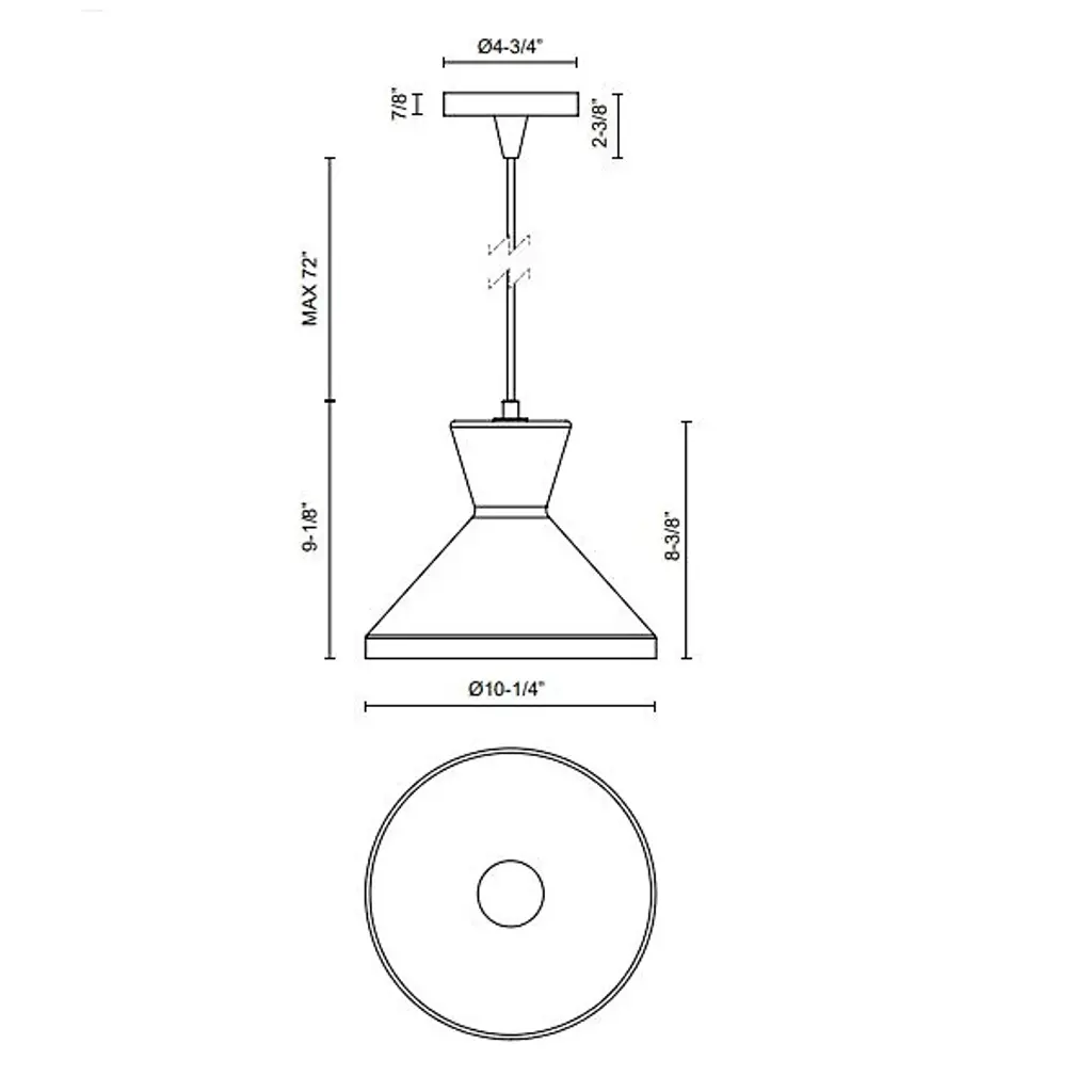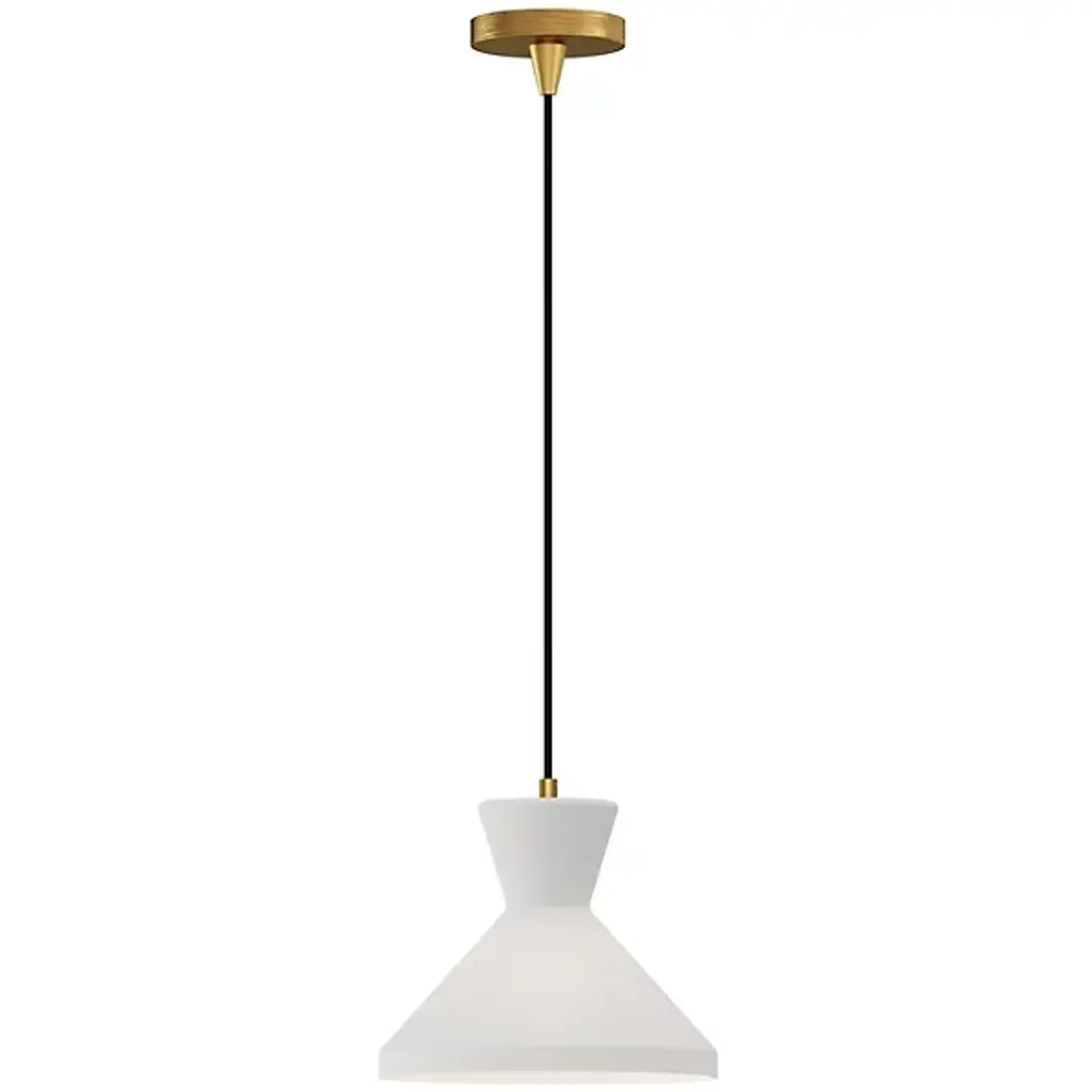 The Betty Pendant from Alora Mood presents an upbeat attitude accompanying retro-style character. Held in place by a circular steel canopy with a small cone center, it transmits a single cable to strong lamping confined by an engaging matte opal glass shade assembled from different-sized conical sections interposed into a single-piece offset hourglass. The broad lower flare of the shade cuts glare to the sides, transmitting an artful mix of reflected radiance and direct downlight below the fixture.