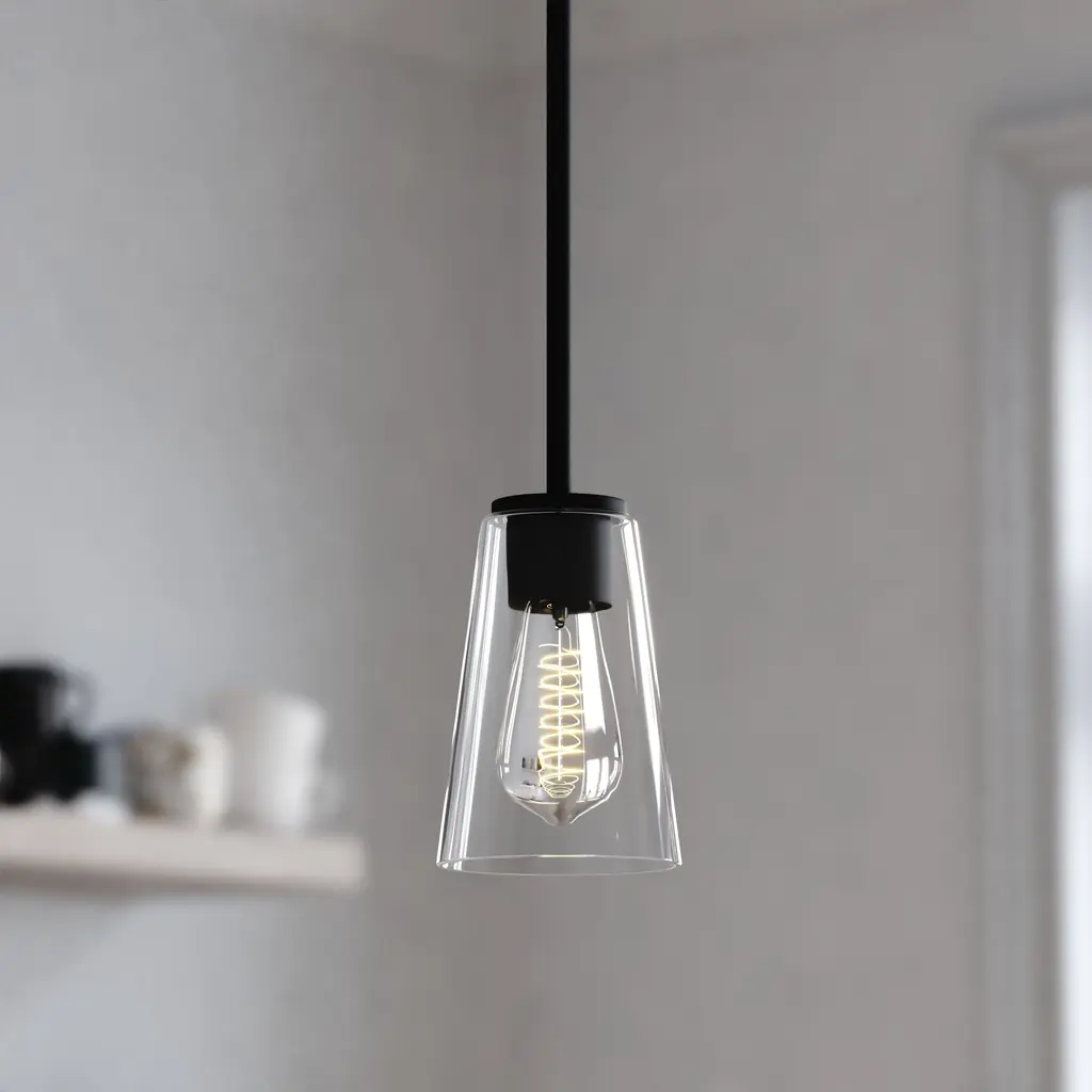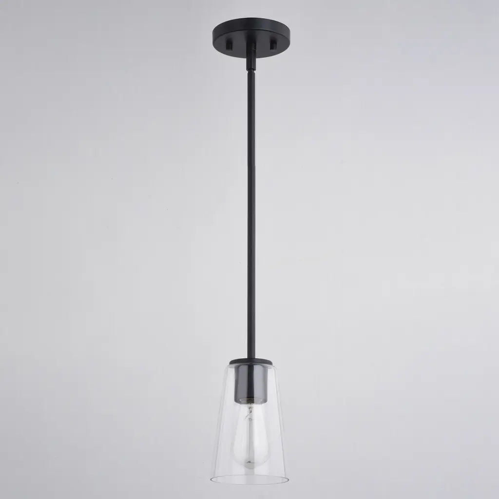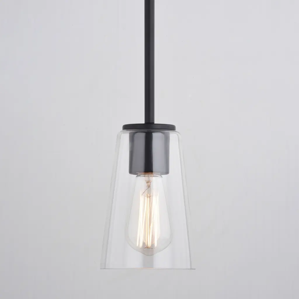 The Beverly collection provides a modern take on classic elegance. The down rod finished in matte black supports the clear tapered glass shade. Round matte black discs hold the glass creating an inviting aesthetic. Add this versatile one light pendant in groups above any kitchen island or dining area for the ultimate addition of transitional style.