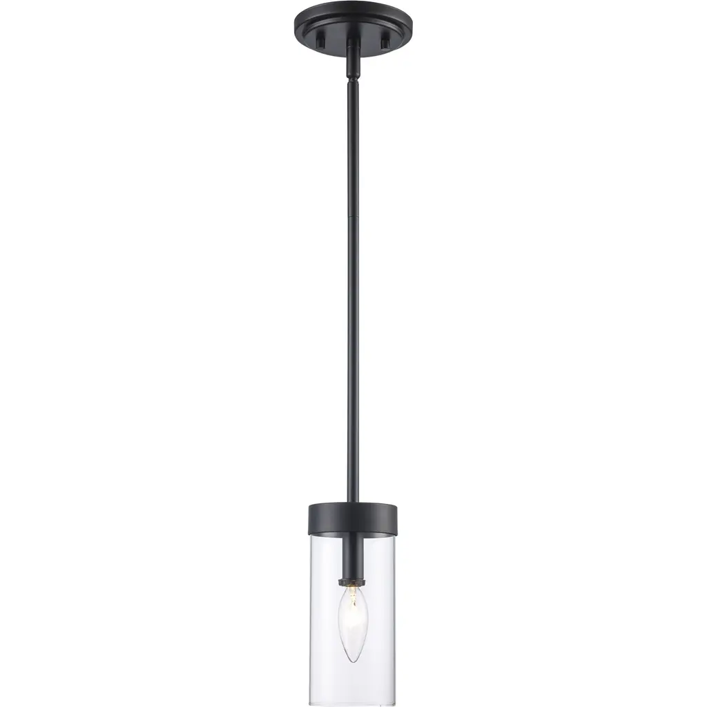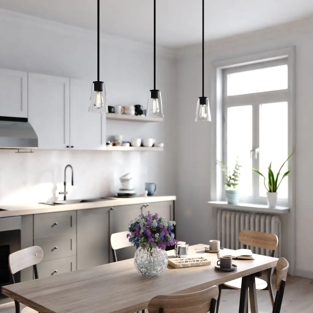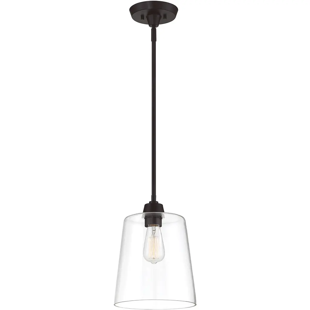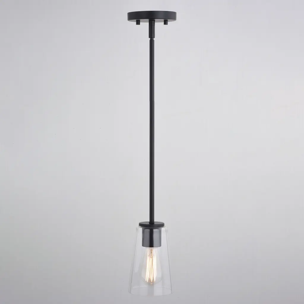 The Beverly collection provides a modern take on classic elegance. The down rod finished in matte black supports the clear tapered glass shade. Round matte black discs hold the glass creating an inviting aesthetic. Add this versatile one light pendant in groups above any kitchen island or dining area for the ultimate addition of transitional style.