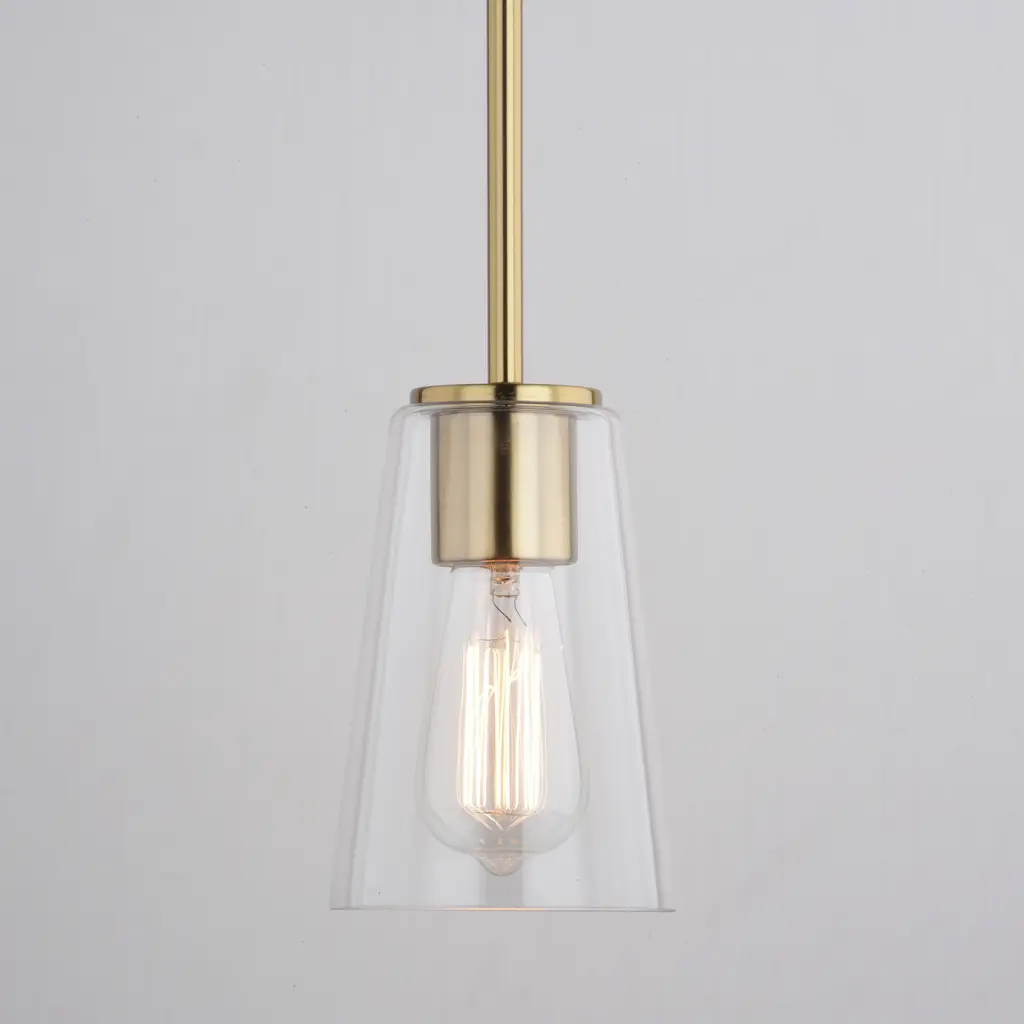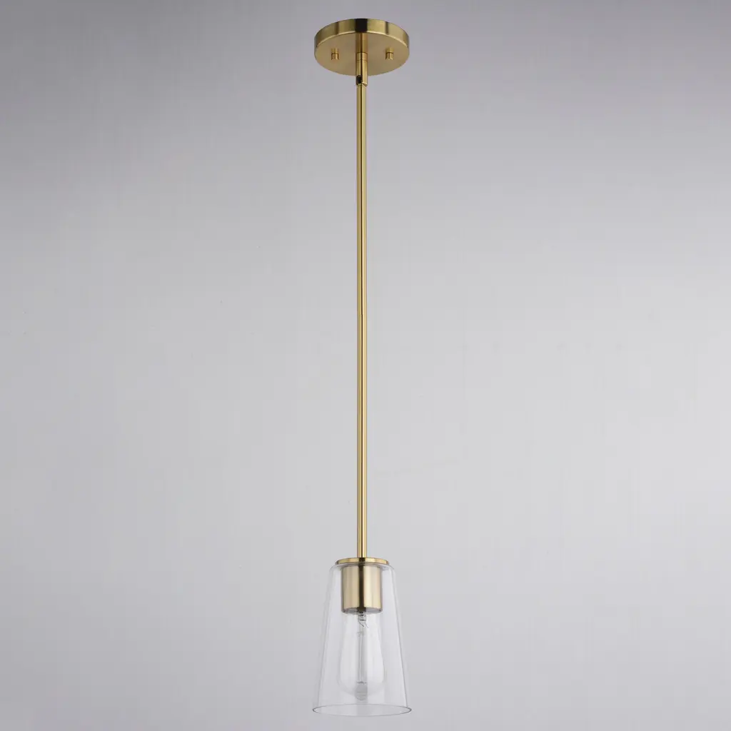 The Beverly collection provides a modern take on classic elegance. The down rod finished in muted brass supports a clear tapered glass shade. Round muted brass discs hold the glass creating an inviting aesthetic. Add this versatile one light pendant in groups above any kitchen island or dining area for the ultimate addition of transitional style.