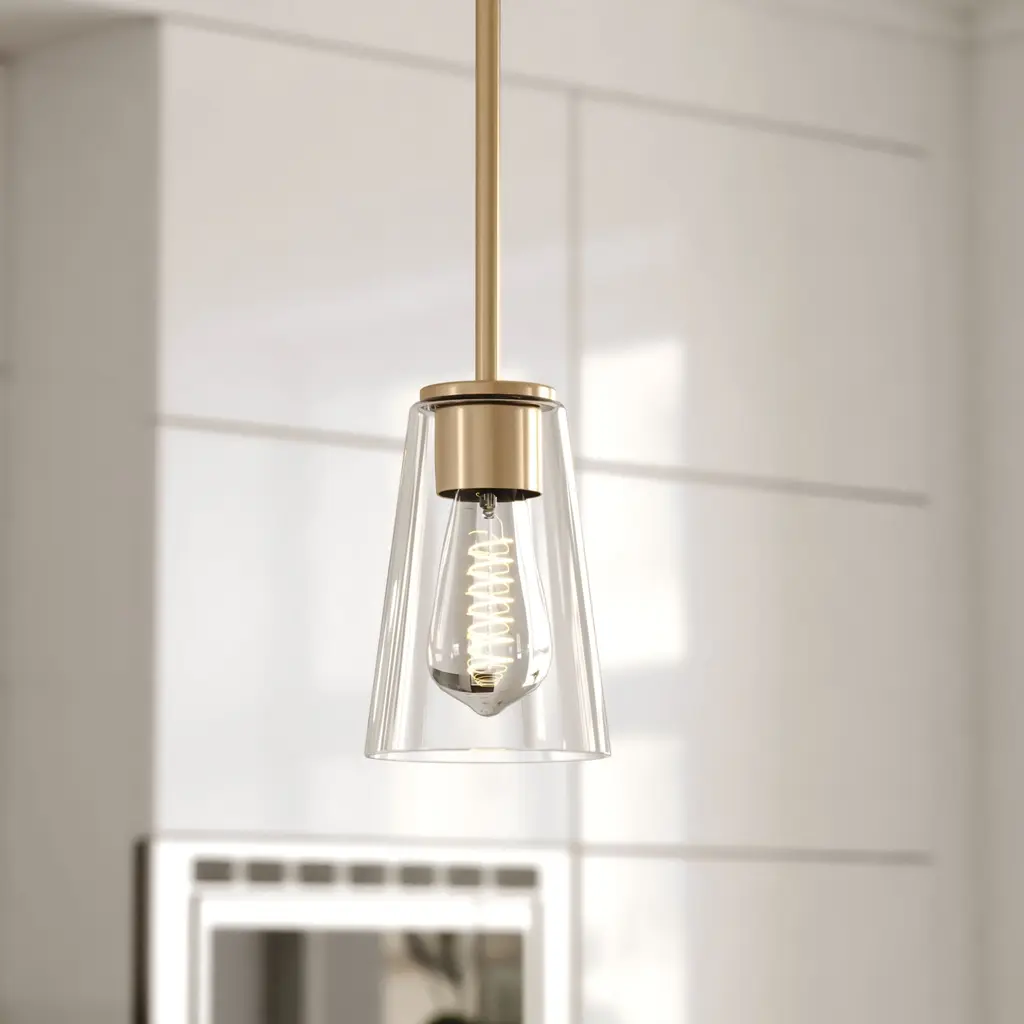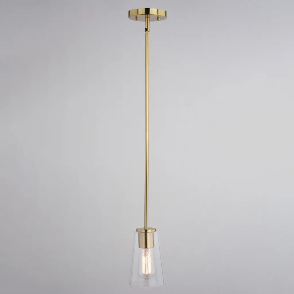 The Beverly collection provides a modern take on classic elegance. The down rod finished in muted brass supports a clear tapered glass shade. Round muted brass discs hold the glass creating an inviting aesthetic. Add this versatile one light pendant in groups above any kitchen island or dining area for the ultimate addition of transitional style.