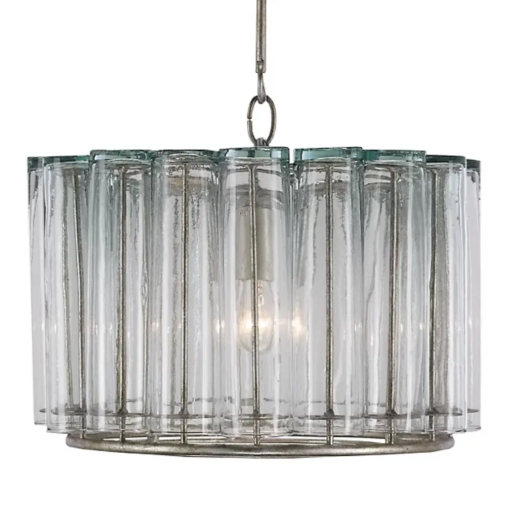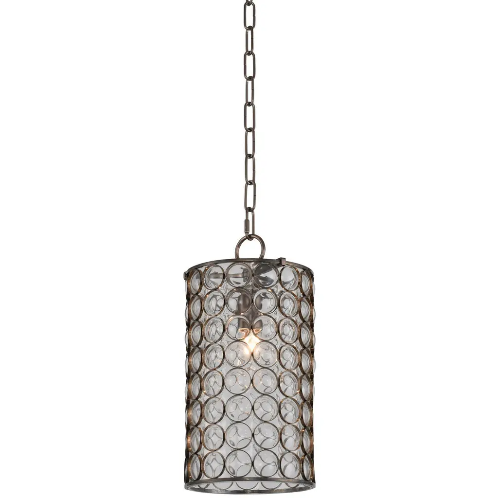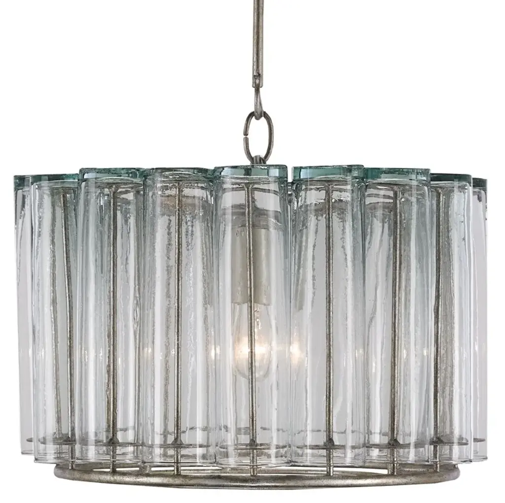 Repurposing with style. Instead of displaying flowers, the recycled bud vases making up the shade of the Bevilacqua Pendant from Currey & Company display an array of exquisite highlights. This piece is a showcase of elegant, environmentally friendly design. Hanging with a handsome down rod, a wrought iron frame creates a sharp outline that seduces in its metallic surface. Timeless bud vases circle the frame in a rhythmic set of curves. When turned on, rays of reflective light scatter across the glass and permeate through in an ambient glow.
