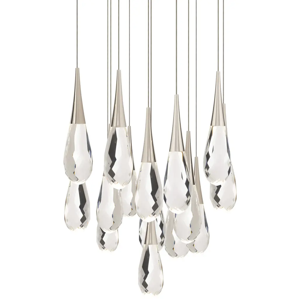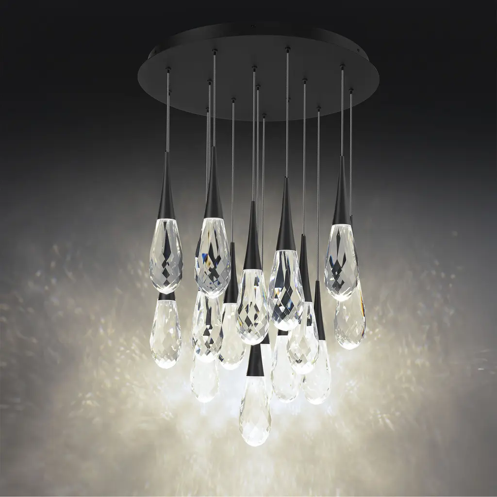 Multi Lights Multiple height-adjustable, faceted crystal teardrop elements float in mid-air. Cascading from above and perfectly designed for illuminating foyers and dining tables while making a dramatic design statement in a range of residential and hospitality environments. Mini Pendant Crystal fashion comes to light in unique forms. Delicate, graceful drops of exquisite crystal embraced by tapered metal forms that glow with a charming lustre. Matching crystal overlays are applied to the metal canopies for an additional touch of luxury.
