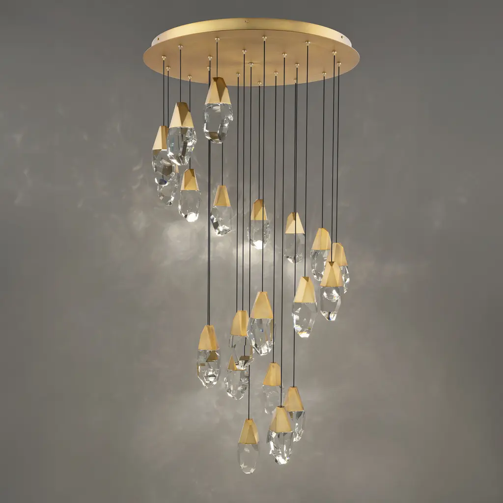 Multi Lights A shower of jewels. Suspended in mid-air, Schonbek optic or optic haze crystal elements composed of natural quartz gemstone illuminate at varying heights to entice. Cascading from above and perfectly designed for over breakfast tables or nightstands in a bedroom to make a powerful but elegant statement. Mini Pendant Suspended in mid-air, a jewel of Schonbek optic or optic haze crystal composed of natural quartz gemstone illuminates to entice. The chiseled metal fitting is congruent with the faceted crystal to confer elegance in design continuity.