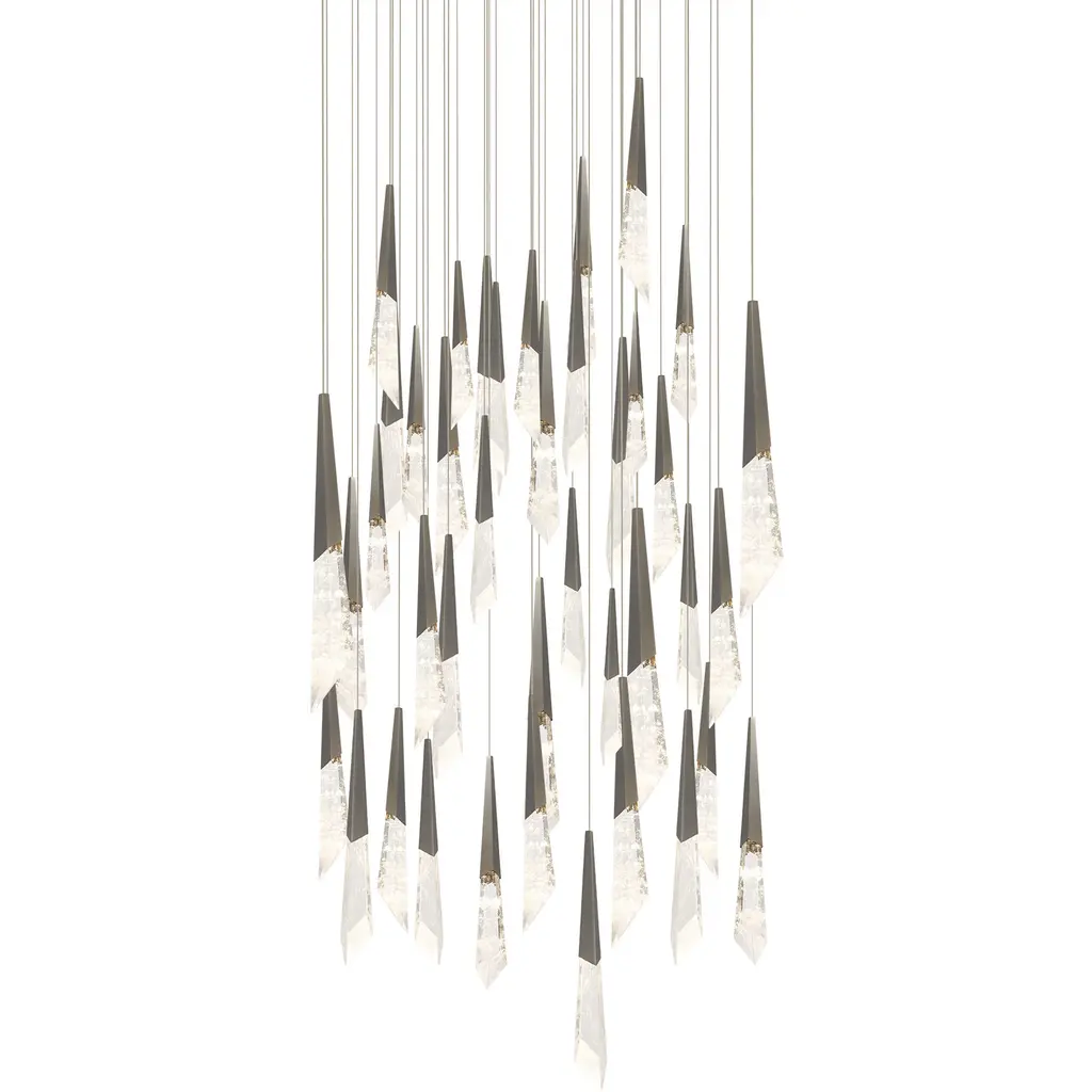 A dramatic character you can't help but fall in love with. The Solitude chandelier features Schonbek optic haze crystal composed of natural quartz gemstone that illuminates and gravitates. Crystal spears juxtapose heroically with bolts of luminous energy.