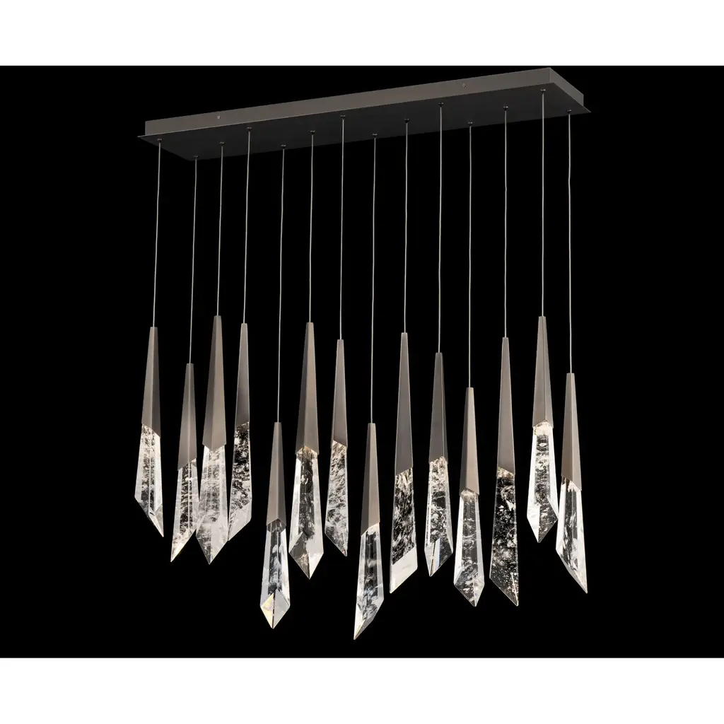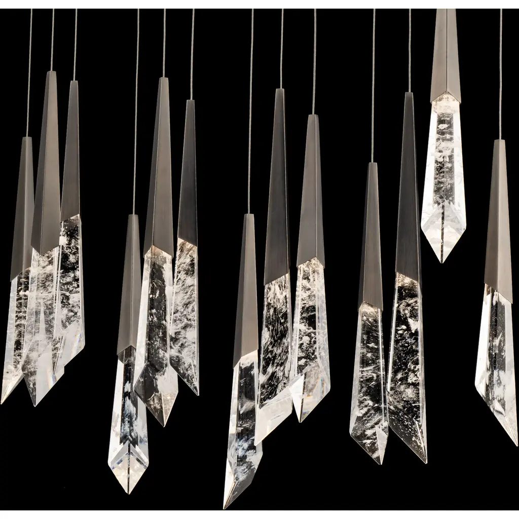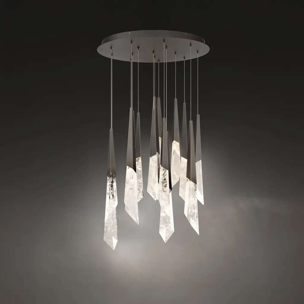 A dramatic character you can't help but fall in love with. The Solitude chandelier features Schonbek optic haze crystal composed of natural quartz gemstone that illuminates and gravitates. Crystal spears juxtapose heroically with bolts of luminous energy.