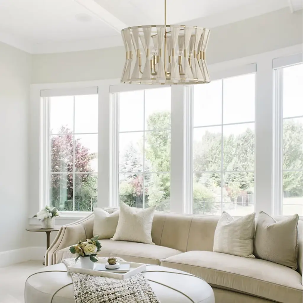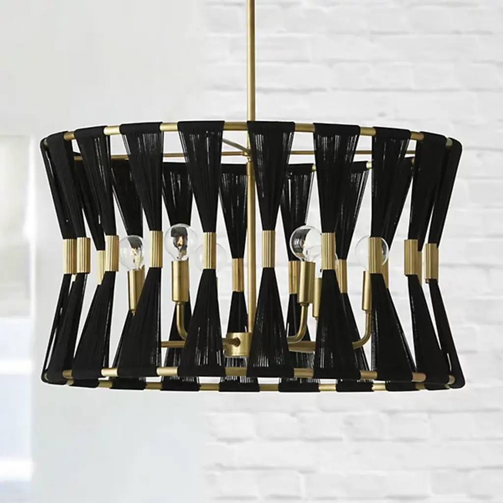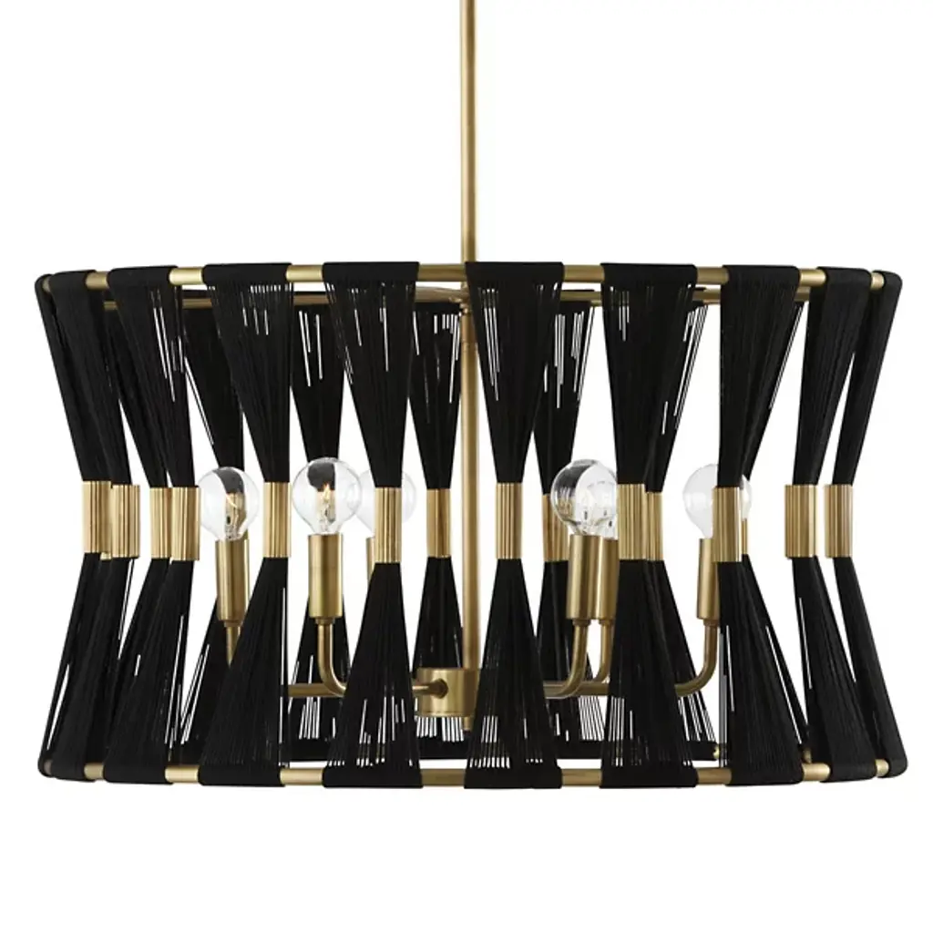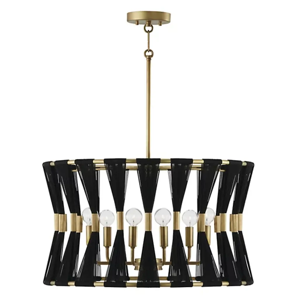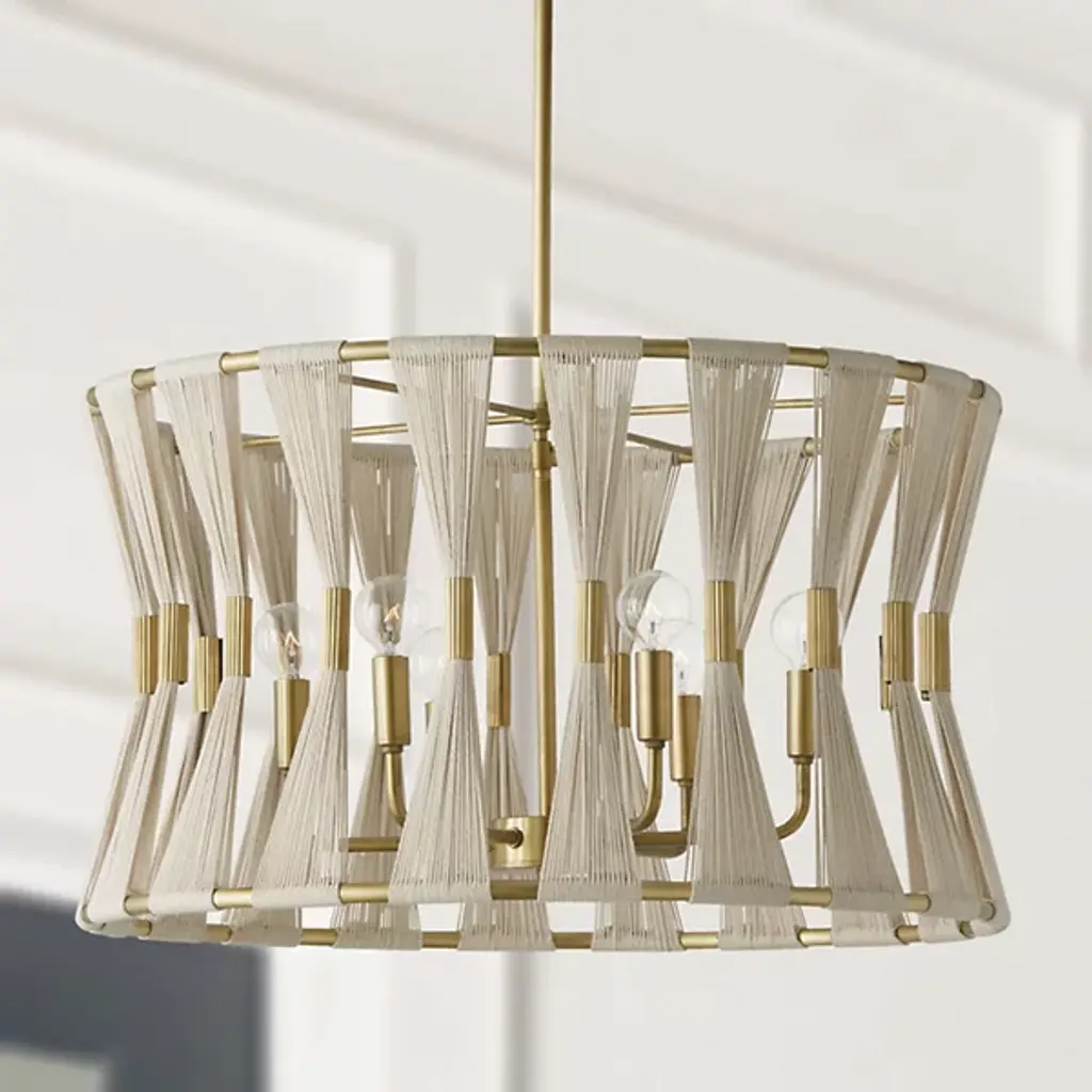 Grand, gorgeous, and glamorous. The Bianca Drum Pendant from Capital Lighting accentuates your home’s fashionable side with a form-fitting arrangement of natural rope and tubular accenting. This grand volume makes for awe-inspiring sight, whether over a foyer, dining table, or living room. Hand wrapped by artisans, natural rope strands flow from to bottom as a tight, tapered silhouette. Tube metal accents at the center accentuate the rope’s linear quality while delivering a ravishing shine. Peeking inside, an arrangement of curved arms and minimalist lamp holders present a low-key silhouette. Popping bulbs on top produce a radiant glow that beams through with a warm, crisp note.