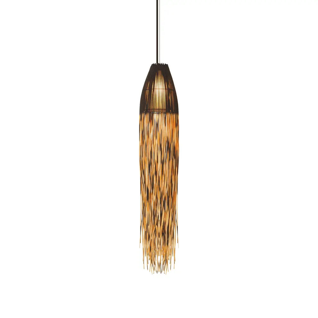 A beautiful design, inspired by nature, the Biba Pendant Light from Kenneth Cobonpue offers an exquisite combination of artistry and craftsmanship. Hand-dyed rattan is skillfully woven onto a durable steel frame, creating a captivating look that is enhanced with bold black and orange accents. Once the light is turned on, the welcoming glow creates a visual treat, casting unique shadows onto every surface within your home. Highlights