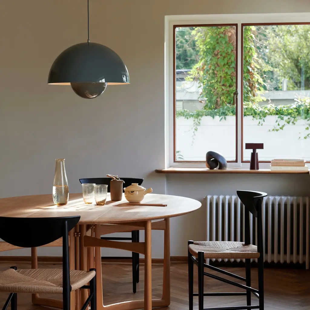 More than twice the size of the VP1, this pendant is exactly as its name states: big. Like its little sibling, the VP2 is made up of 2 semi-circular facing spheres—the upper sphere twice as large as the lower one. The late, great Verner Panton believed in the possibility of a happier, brighter future, and designed with this in mind. The visionary Dane was the first to do inflatable furniture, cardboard houses and single-form, injection-molded plastic chairs—and all with an optimistic nod. Those chairs appeared in Stanley Kubrick's 1968 masterpiece 2001: A Space Odyssey; the same year experienced revolutions in the streets of Paris, Rome and the U.S. celebrating change by a generation fueled on Flower Power and a new outlook on the world. Verner marked it all the next year with the FlowerPot collection of table and pendant lights. Spherical, bold and modern, they are as fresh looking now as they were in 1969. No wonder Copenhagen house &Tradition decided to reissue them.
