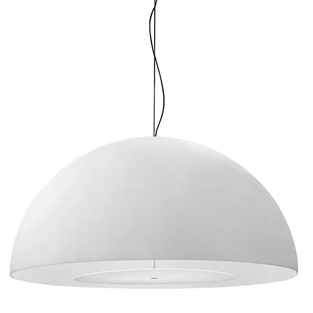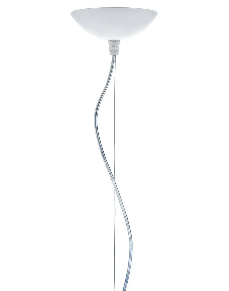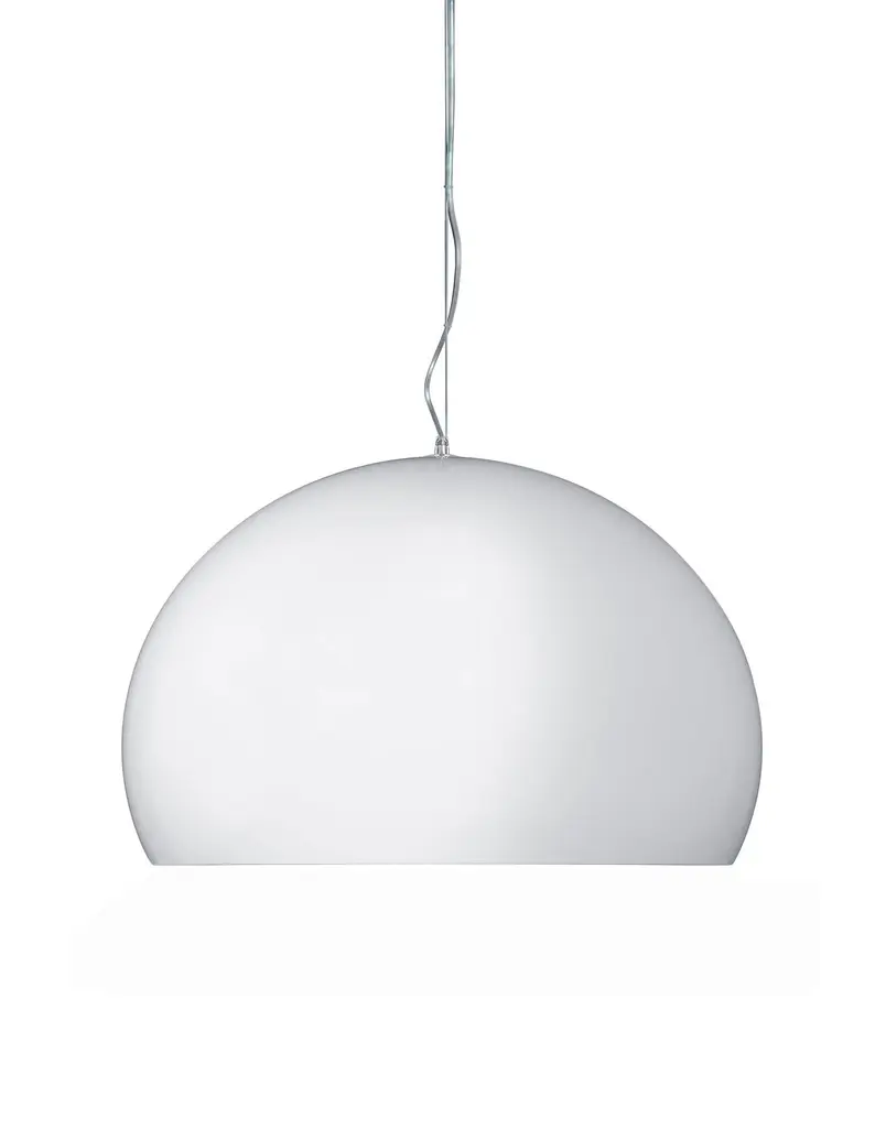 FL/Y is an essentially-styled suspension lamp. The particular transparency of the material and the sheen of the colours recreate the idea of a soap bubble, shimmering iridiscently in the light. The shade is not perfectly hemispherical, with the cut-off falling just below the level of the diameter, offering greater concentration of the light. The lamp is available in three different sizes: Fl/Y (diameter 52cm, shade depth 33cm), Small Fl/Y (diameter 38cm, shade depth 28cm) and Big Fl/Y (diameter 83cm, shade depth 55cm).