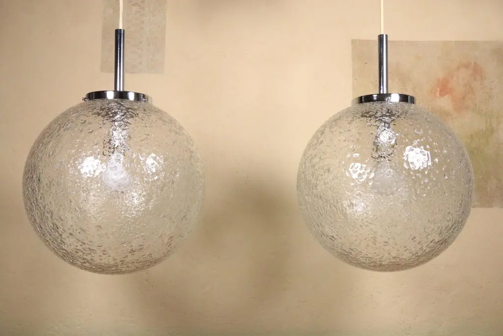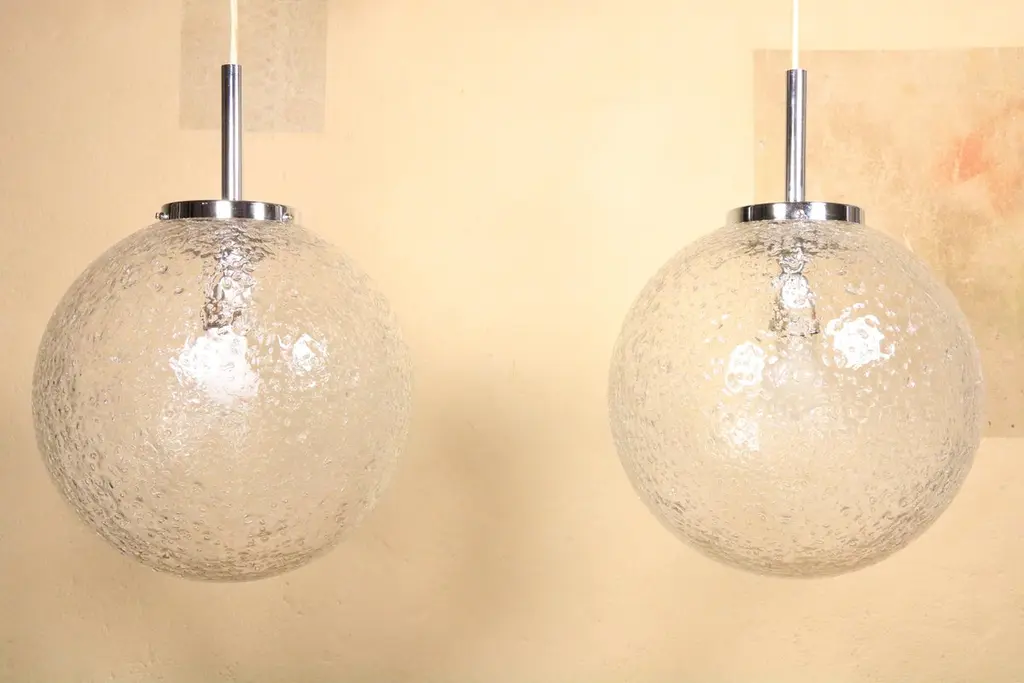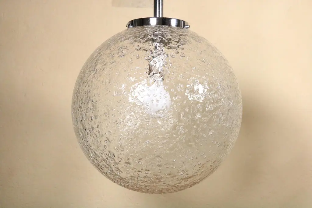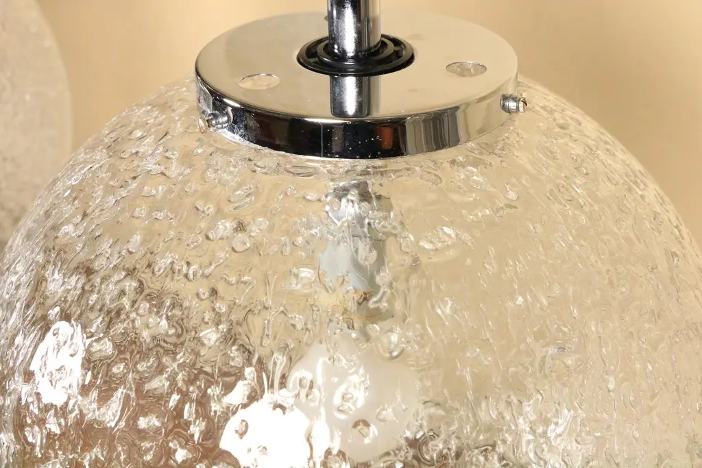 A total of three large ball lamps made of textured thick bubble glass.Beautiful chrome finish held by three screws on the neck of the ball. Manufacturer could be DORIA. Diameter: 35 cm / 13.77 inchWhite textile cable with steel cable inside will be installed according to desired length.Three lamps avaiable. Would look very attractive hanging in a row.Each 1 x E27 bulb.