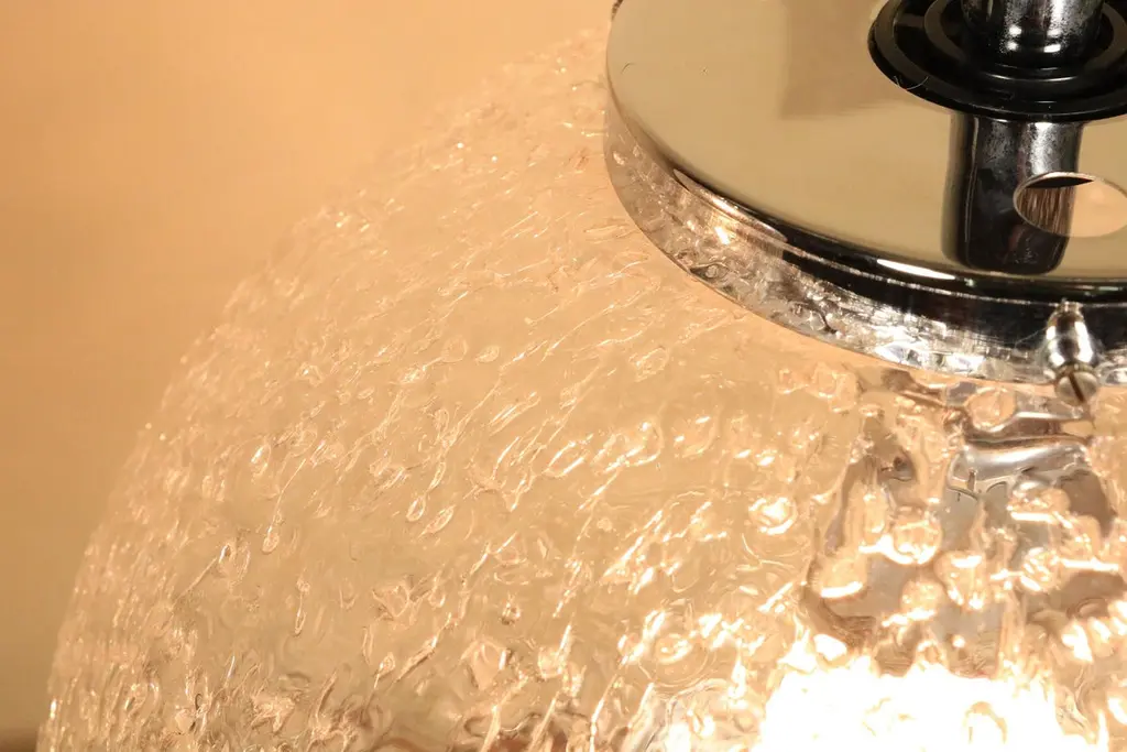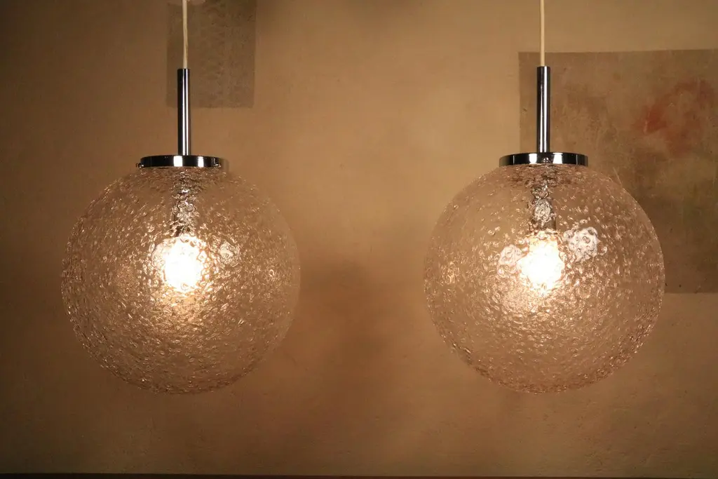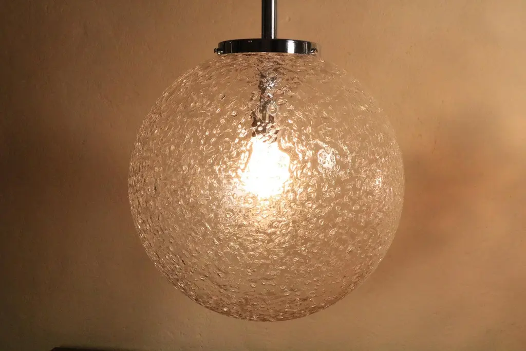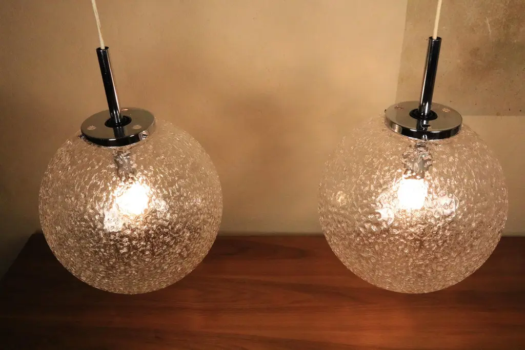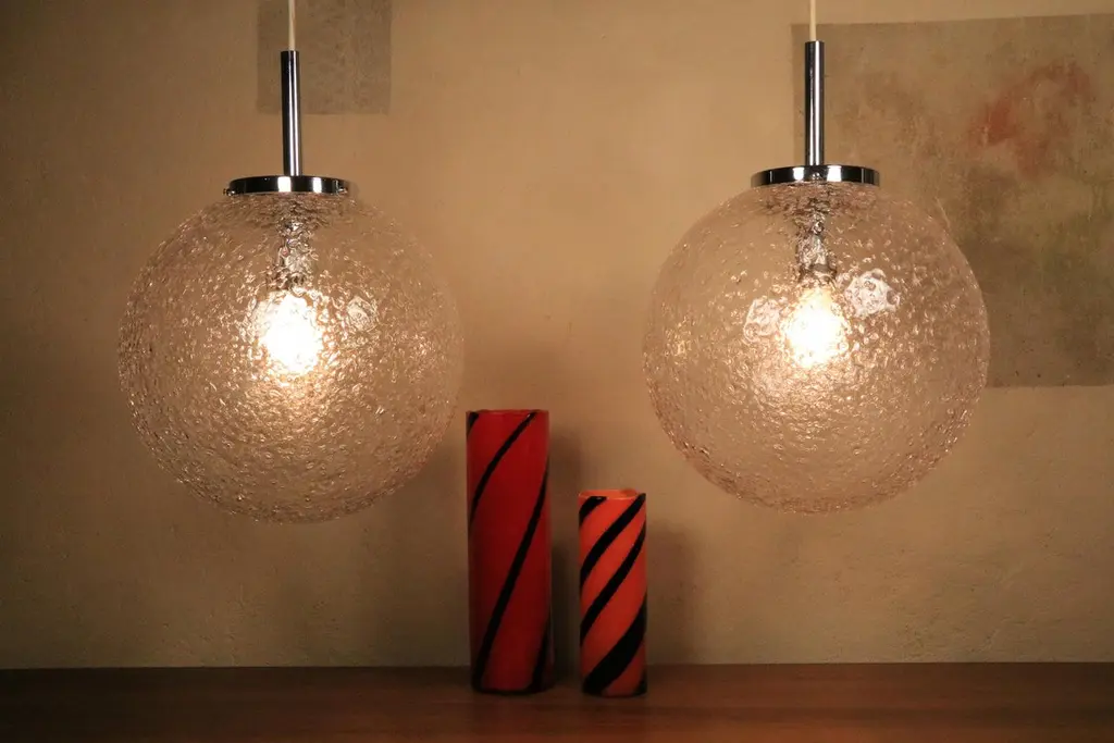 A total of three large ball lamps made of textured thick bubble glass.Beautiful chrome finish held by three screws on the neck of the ball. Manufacturer could be DORIA. Diameter: 35 cm / 13.77 inchWhite textile cable with steel cable inside will be installed according to desired length.Three lamps avaiable. Would look very attractive hanging in a row.Each 1 x E27 bulb.