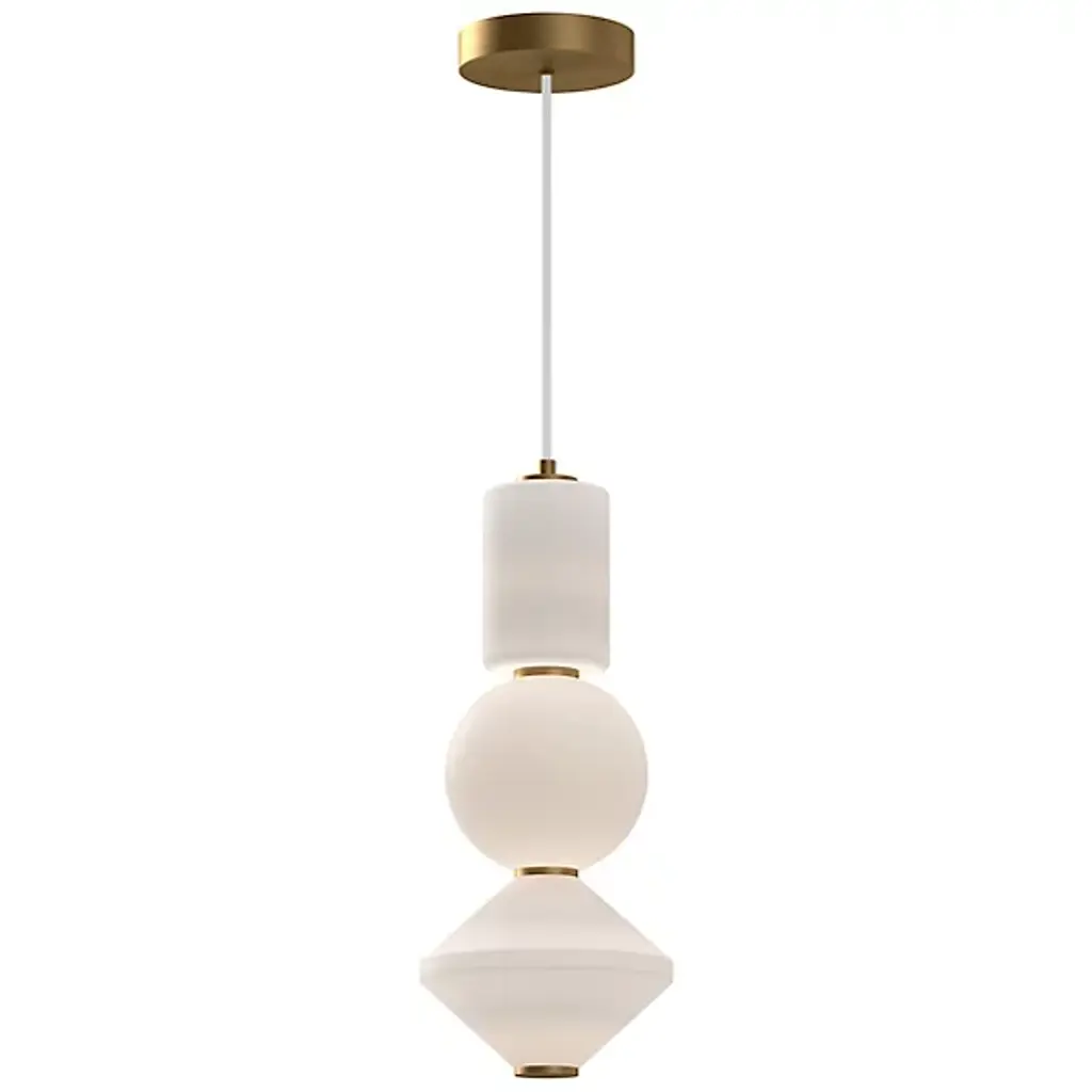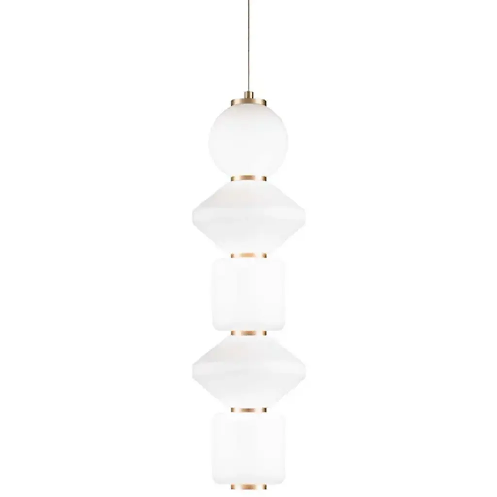 An elegant abstraction of a simple, essential design. The Bijou LED Abstract Pendant from Alora Mood. This artistic spin on the traditional Bijou pendant design adds a touch of sculptural style, starting with a clean-surfaced disc ceiling mount and stringing a strand of bead-like, matte opal glass shades around LED lamping and along a slim length of cable. The shapes transition from a cylinder to a sphere, down to a double-sided conical shape, gentling direct glare, while each one is separated from its neighbors by small metal accents that provide a welcome contrast to the translucent glass.