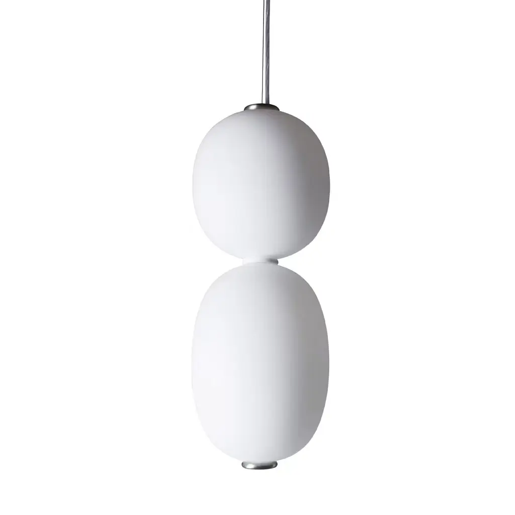 An elegant abstraction of a simple, essential design. The Bijou LED Abstract Pendant from Alora Mood. This artistic spin on the traditional Bijou pendant design adds a touch of sculptural style, starting with a clean-surfaced disc ceiling mount and stringing a strand of bead-like, matte opal glass shades around LED lamping and along a slim length of cable. The shapes transition from a cylinder to a sphere, down to a double-sided conical shape, gentling direct glare, while each one is separated from its neighbors by small metal accents that provide a welcome contrast to the translucent glass.