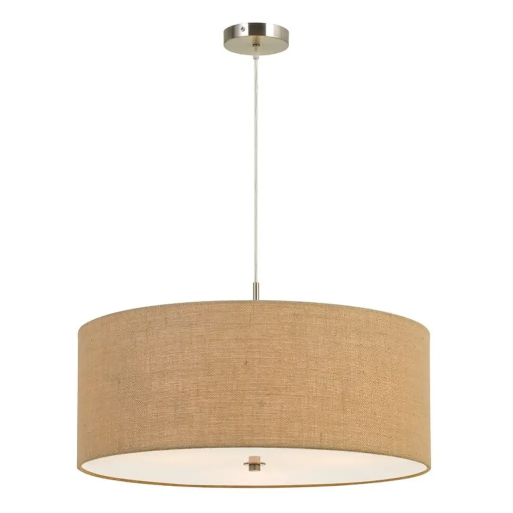 Featuring a large natural burlap drum shade with a shiny metallic fixture, this three-light pendant lamp illuminates the living or dining room with a rustic glow. A diffuser is included to soften the light, protecting the eyes of anyone who passes beneath it.
