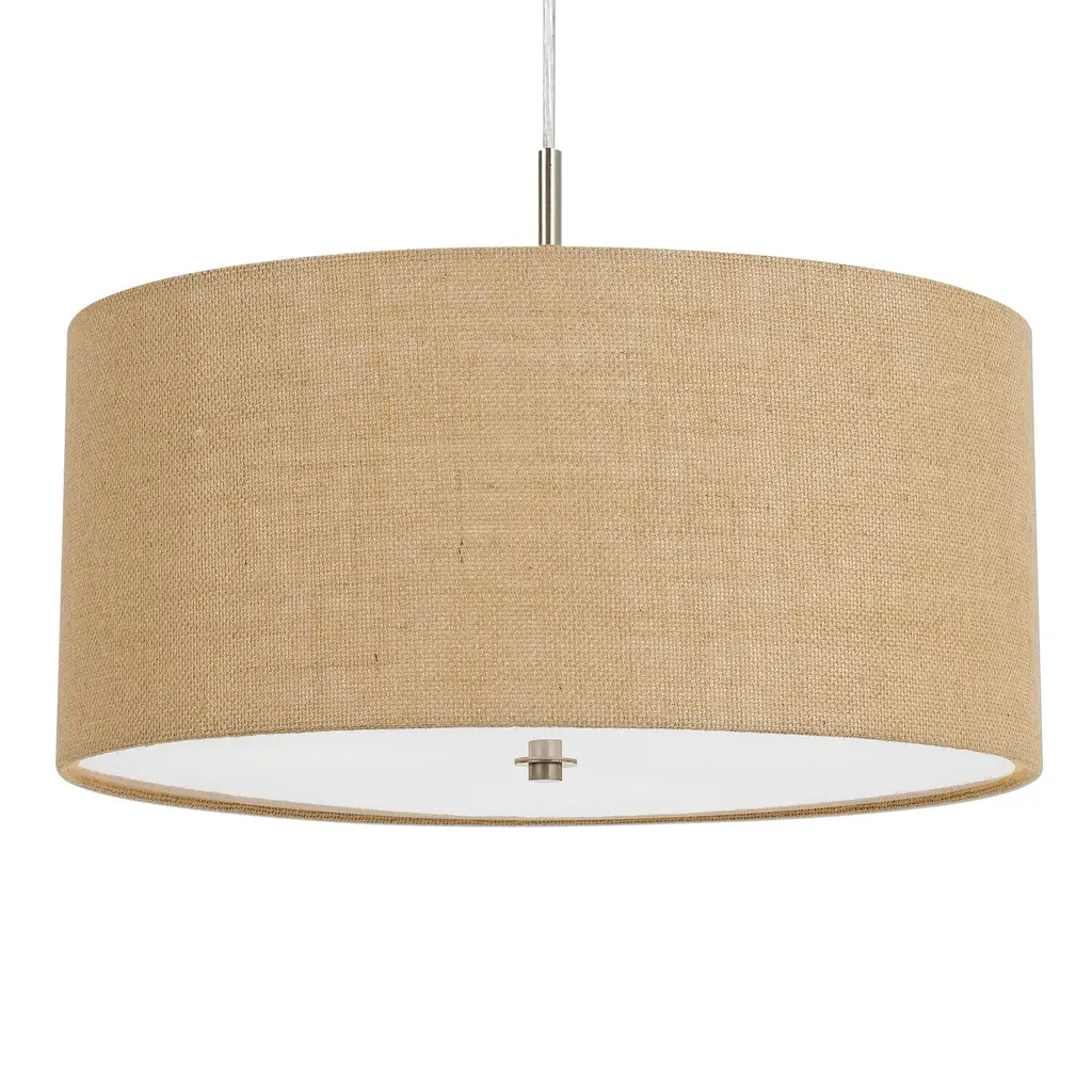 Featuring a natural burlap drum shade with a shiny metallic frame and a white cord, this small three-light pendant lamp illuminates the kitchen or bedroom with a rustic glow. A diffuser is included to soften the light, protecting the eyes of anyone who passes beneath it.