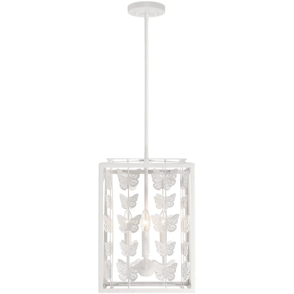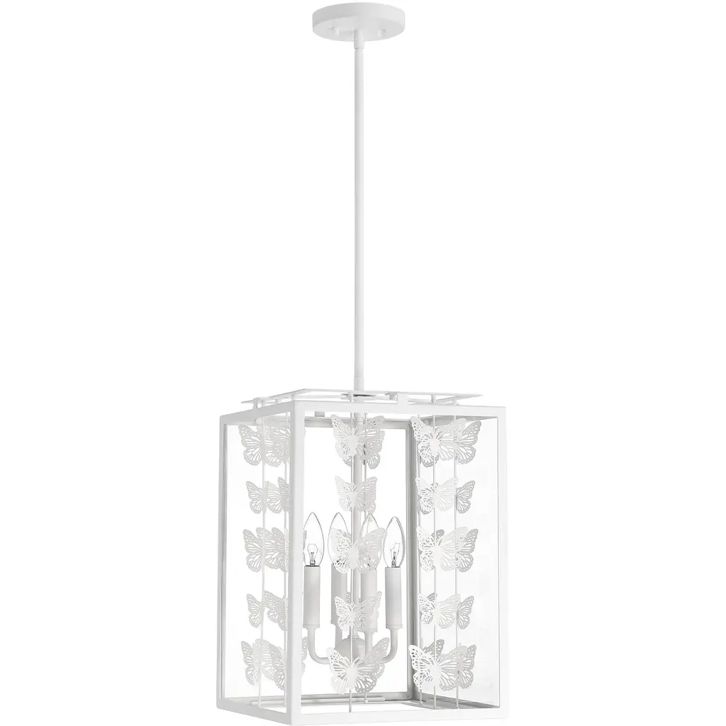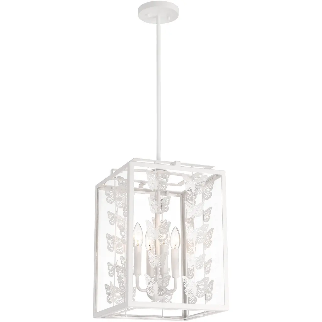 Add a little magic to any room with the whimsical Savoy House Birch 4-light pendant, which features a geometric structure adorned with rows of lovely metal butterflies finished in Bisque White. Clear glass panes frame everything beautifully. Birch is 12" in width and has an adjustable height ranging from 17" to 71". Comes with four 12" downrods and one 6" downrod. Uses four candelabra size bulbs of up to 60 watts per bulb. Bulbs are not included.