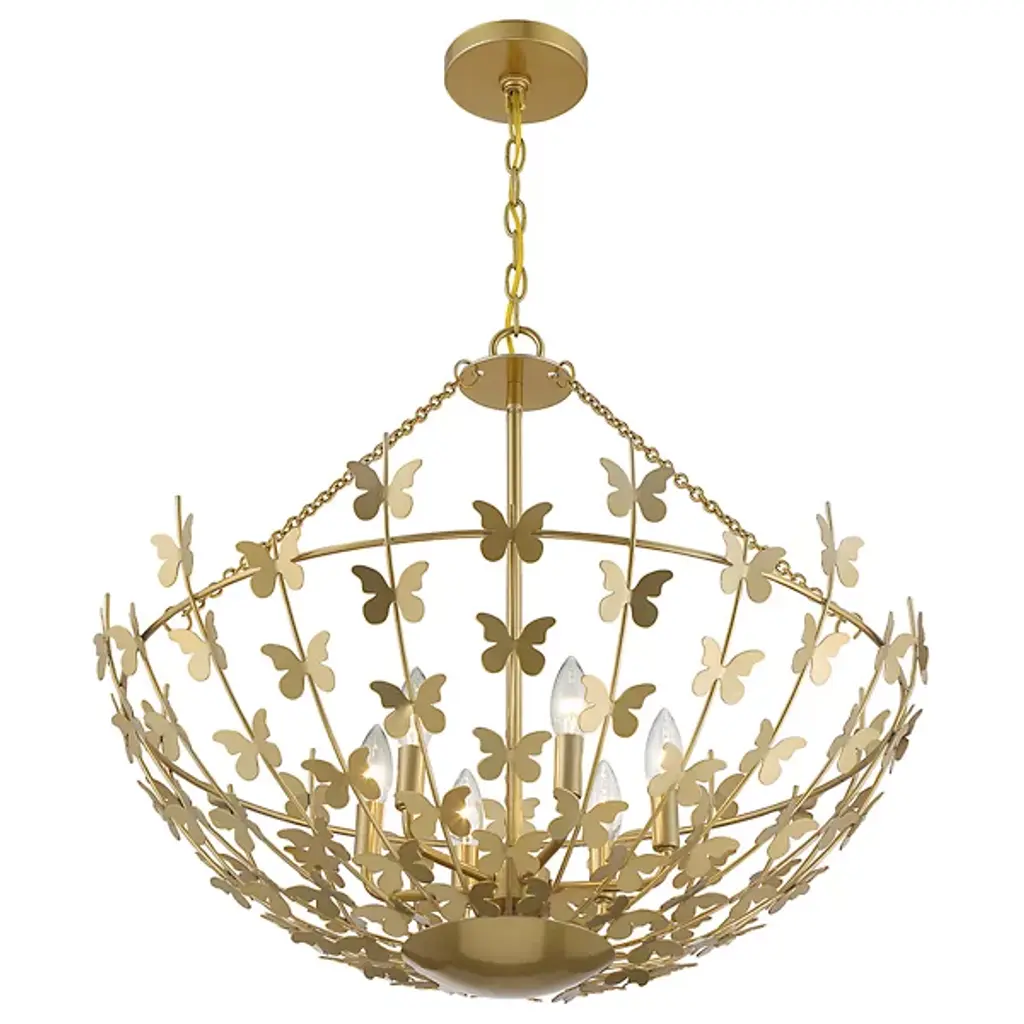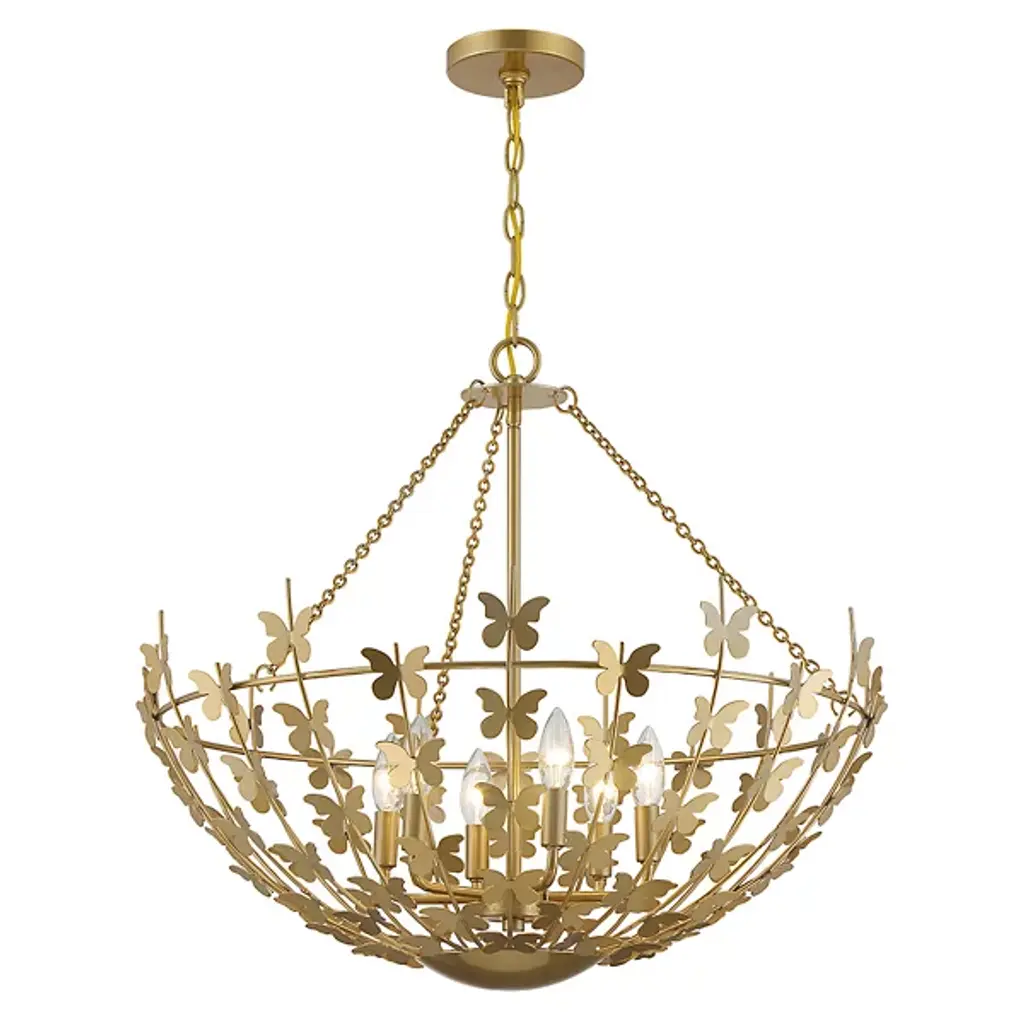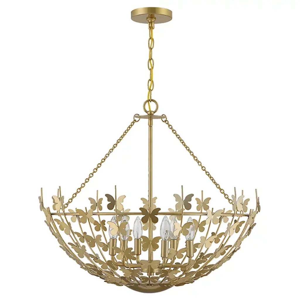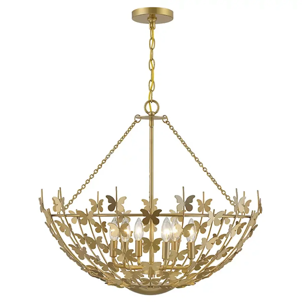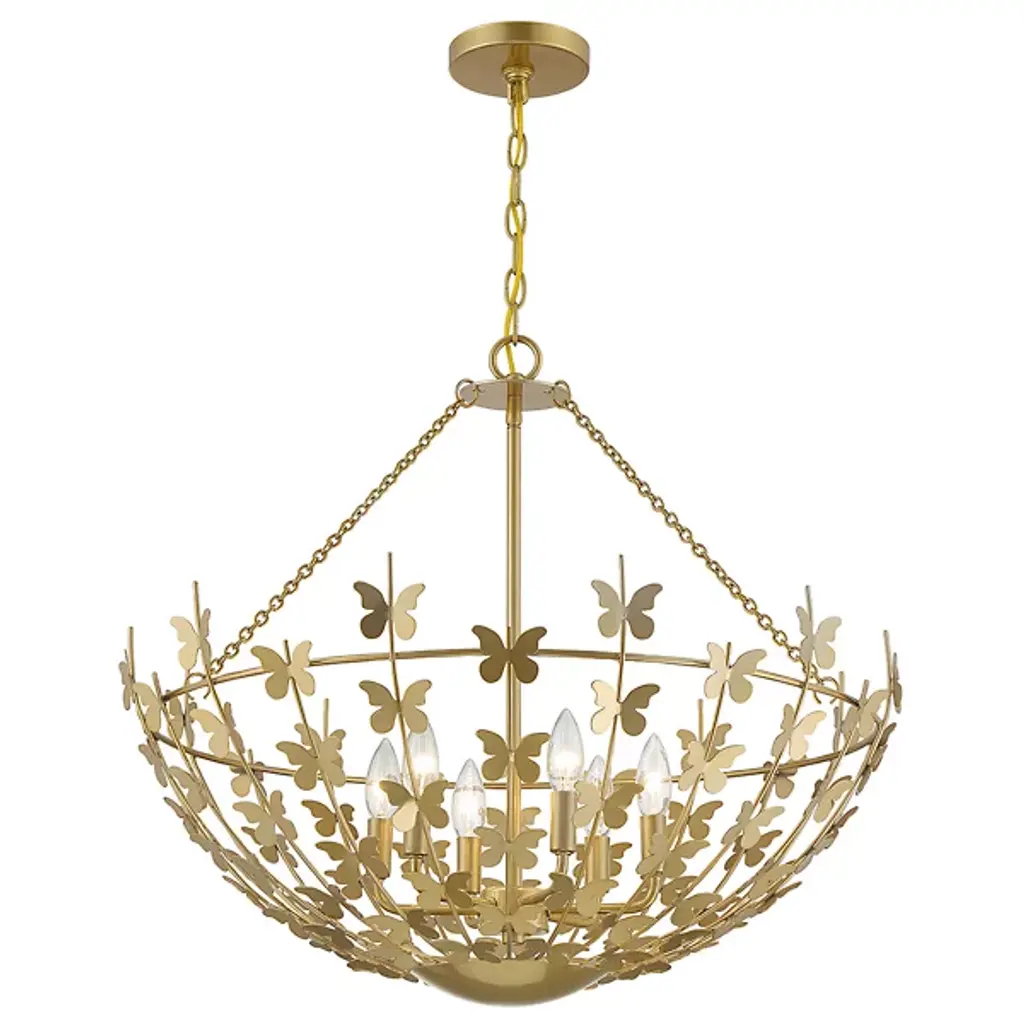 Let your décor take wing with the whimsical and visually intriguing Birch Pendant from Savoy House. An open metal bowl adorned with charming rows of burnished butterflies surrounds candelabra lamping suspended from a central stem and accented by three fine linked chains. The whimsical butterfly accents lend an artistic touch, creating a sense of movement while allowing light to filter through the airy design, ideal for vintage or boho spaces.