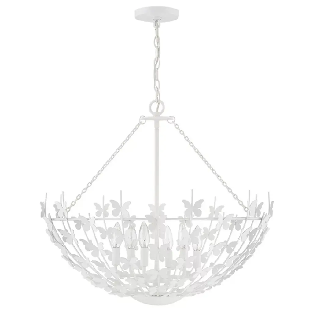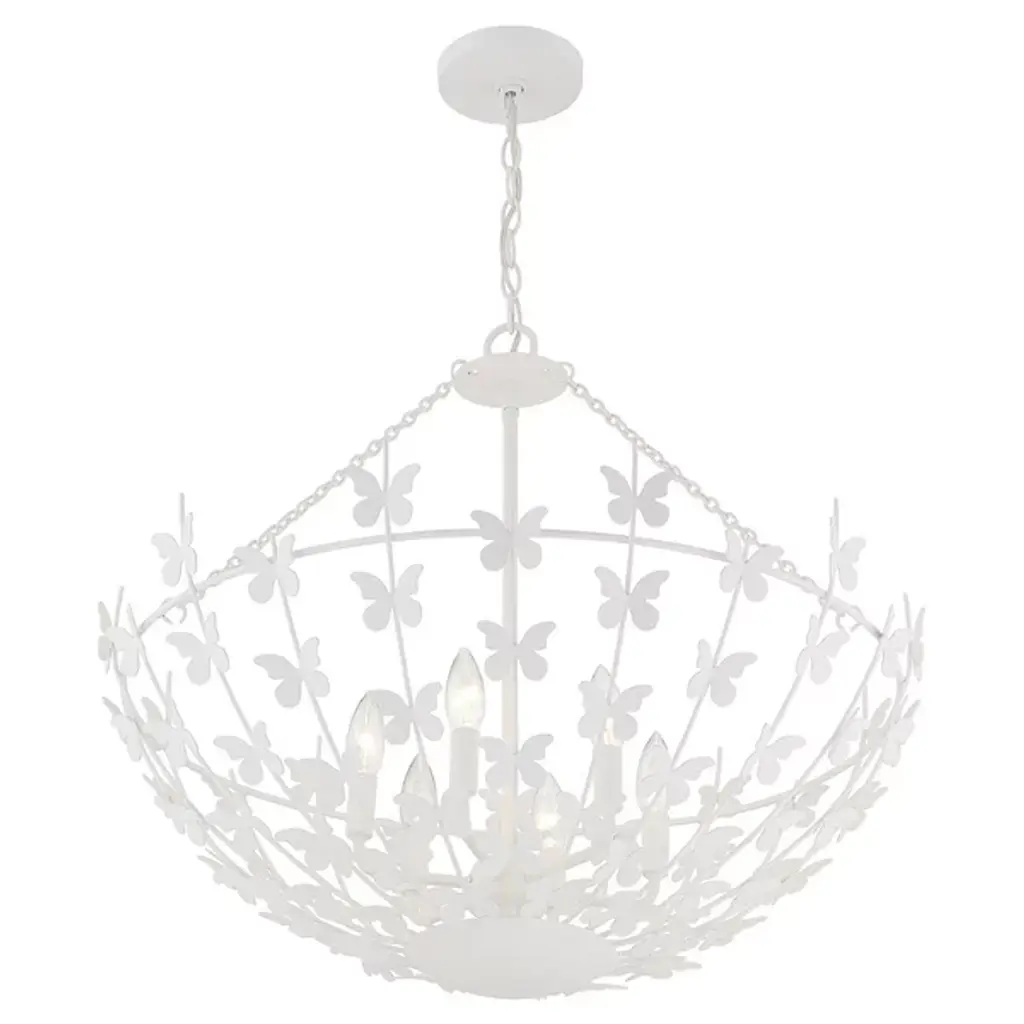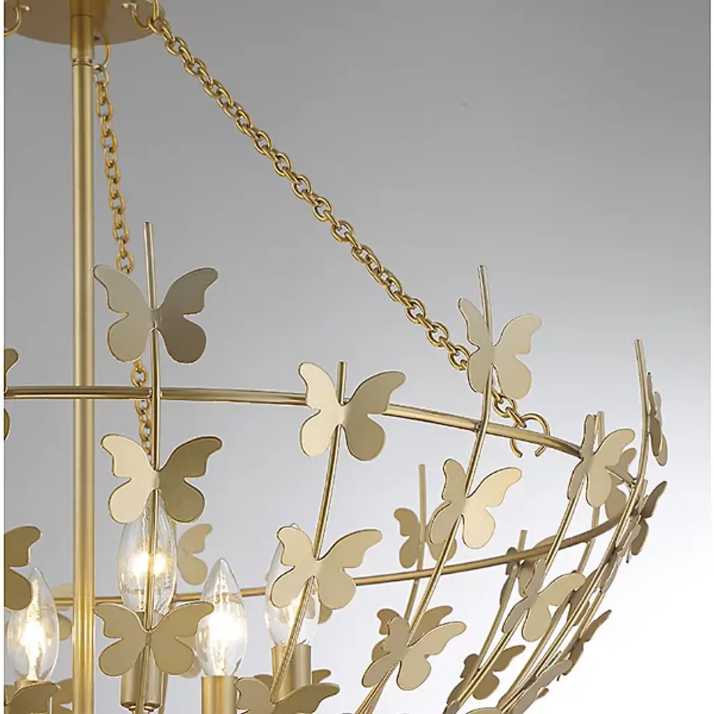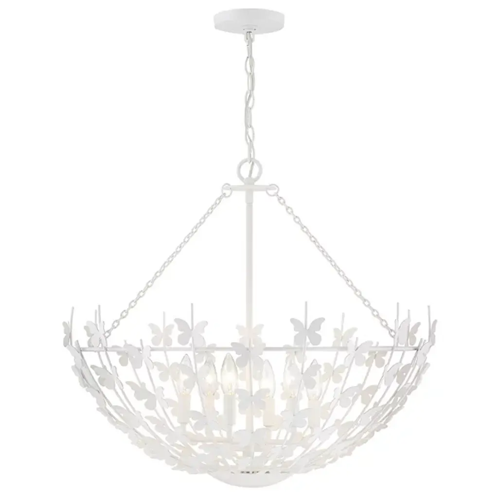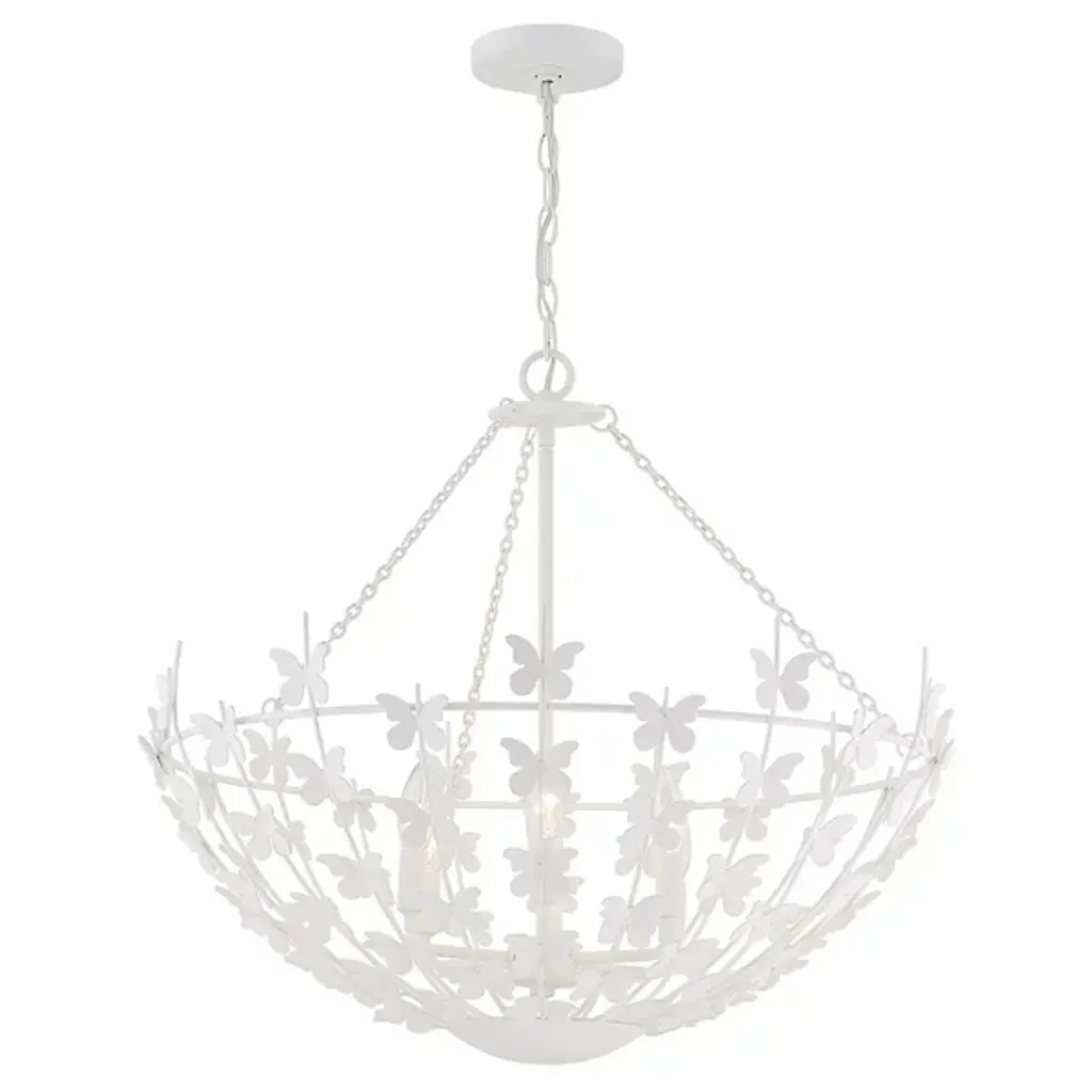 Let your décor take wing with the whimsical and visually intriguing Birch Pendant from Savoy House. An open metal bowl adorned with charming rows of burnished butterflies surrounds candelabra lamping suspended from a central stem and accented by three fine linked chains. The whimsical butterfly accents lend an artistic touch, creating a sense of movement while allowing light to filter through the airy design, ideal for vintage or boho spaces.