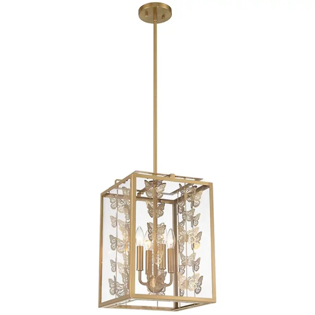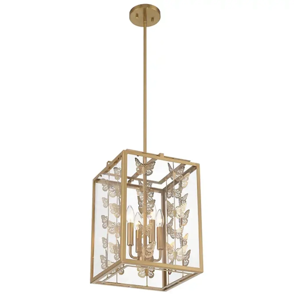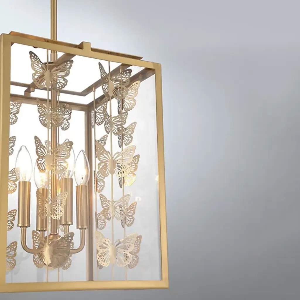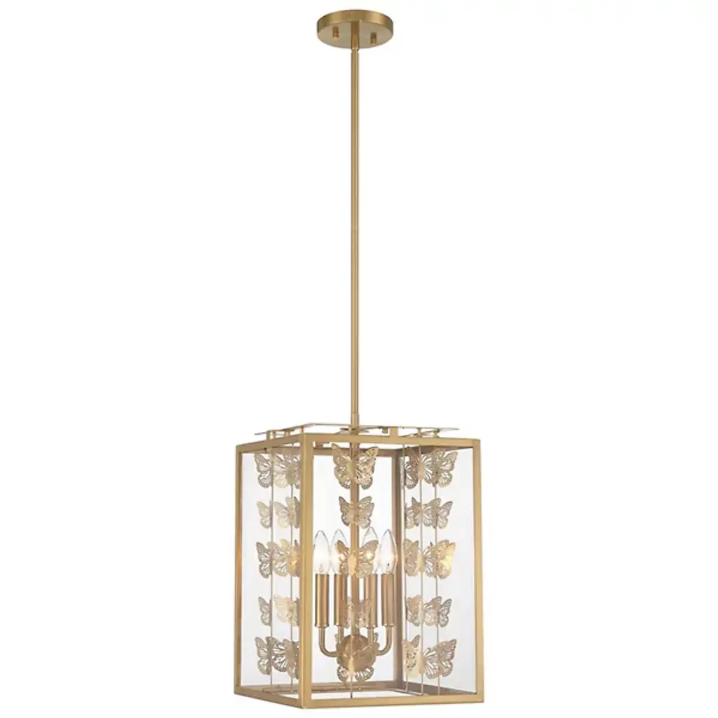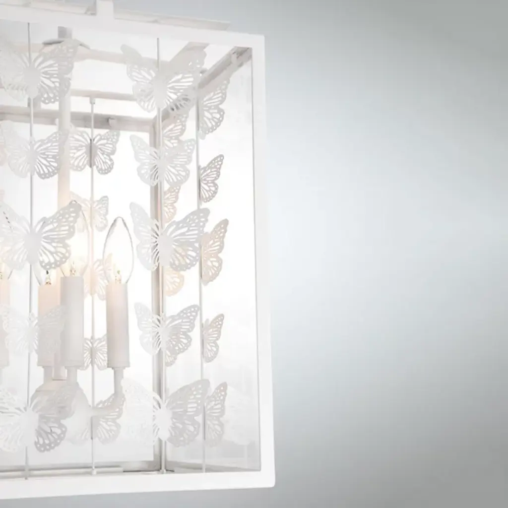 The Birch Pendant from Savoy House infuses interiors with whimsical vintage charm. Featuring a retro, lantern-style design, it showcases rows of burnished butterflies gracefully ascending around candelabra lights suspended from a central stem within a rectangular frame. The artistic butterfly silhouettes outside the clear glass panes create a sense of movement, allowing light to filter through the open design. Perfect for vintage or bohemian spaces, it casts larger butterfly shadows amid even ambiance, adding a distinctive and enchanting character to any room.