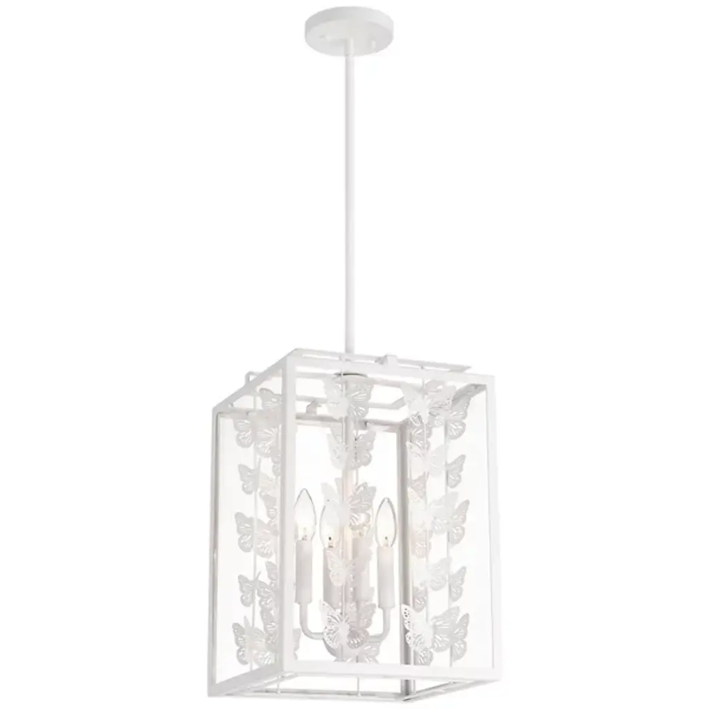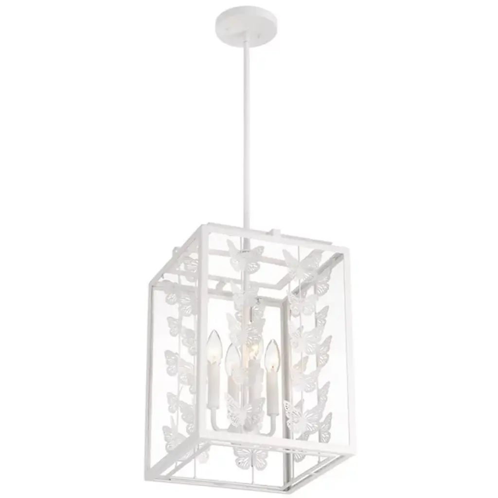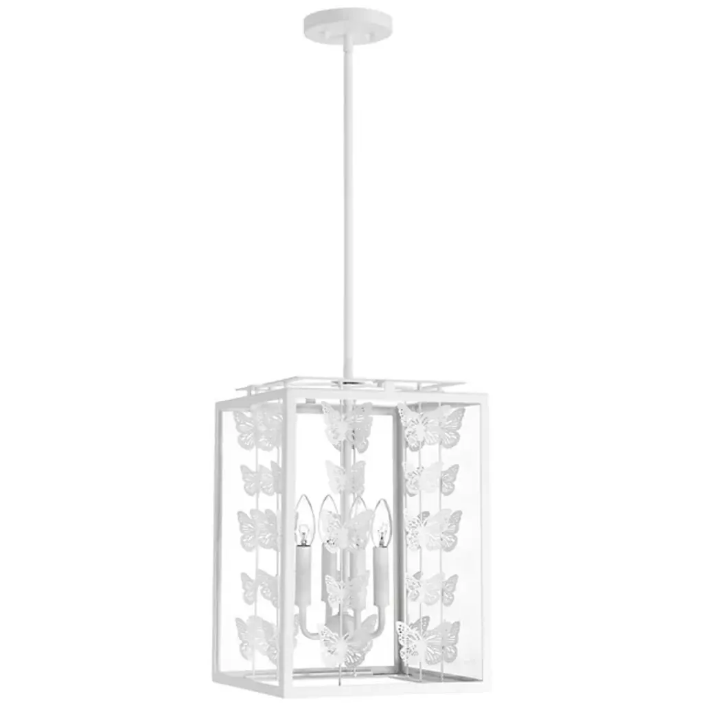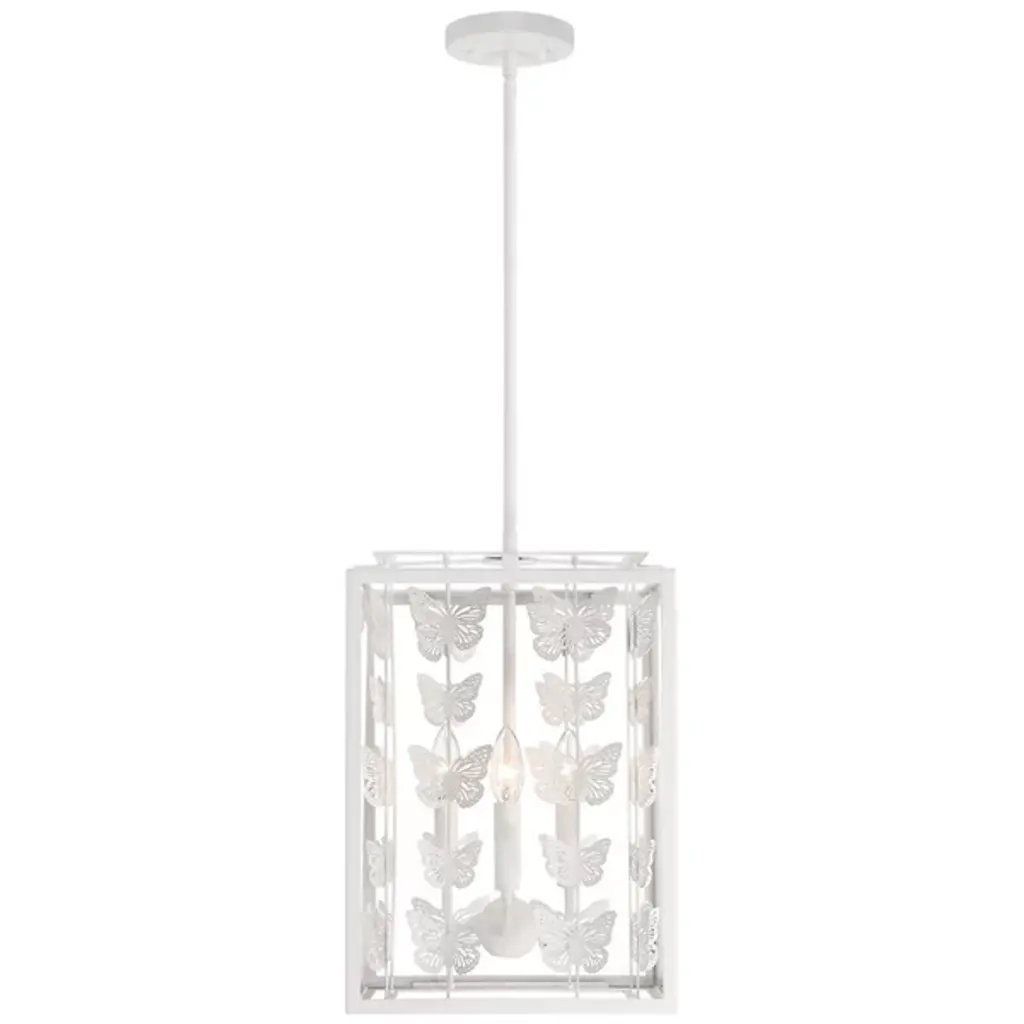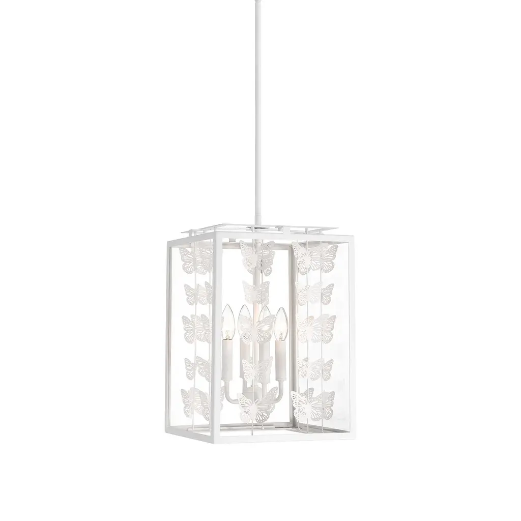The Birch Pendant from Savoy House infuses interiors with whimsical vintage charm. Featuring a retro, lantern-style design, it showcases rows of burnished butterflies gracefully ascending around candelabra lights suspended from a central stem within a rectangular frame. The artistic butterfly silhouettes outside the clear glass panes create a sense of movement, allowing light to filter through the open design. Perfect for vintage or bohemian spaces, it casts larger butterfly shadows amid even ambiance, adding a distinctive and enchanting character to any room.