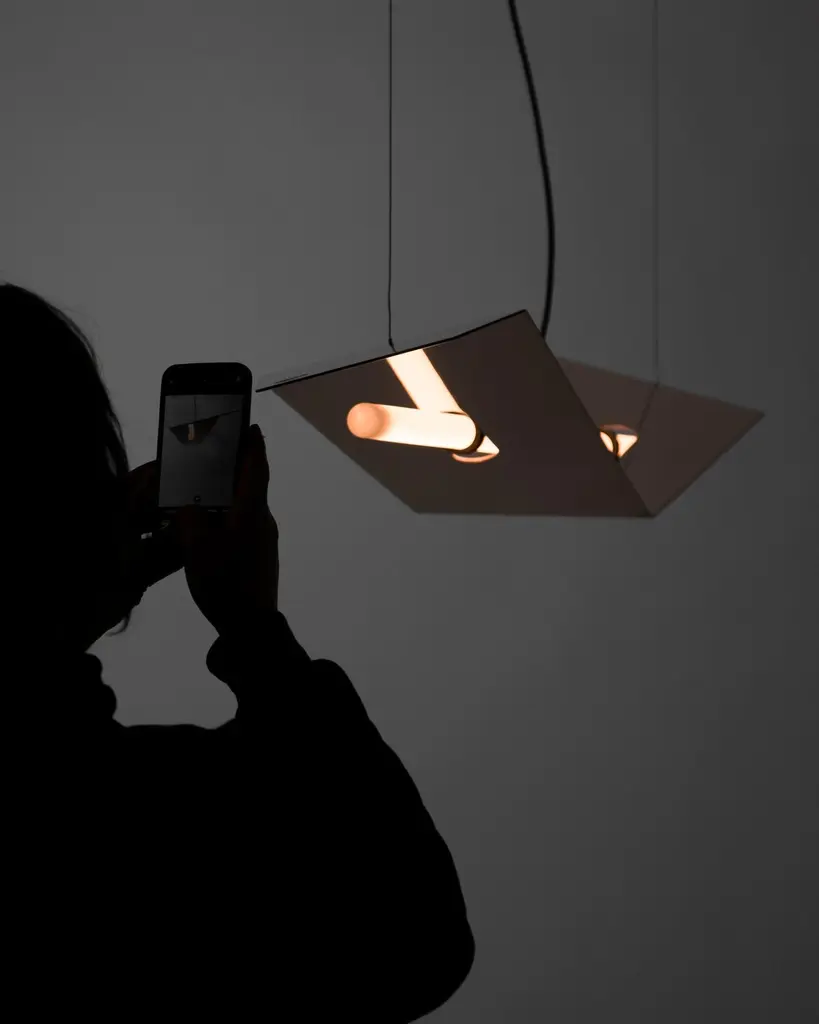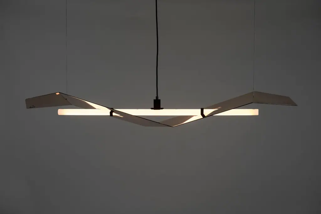 Bird of prey pendant by Atelier Haute Cuisine.Dimensions: 135 x 25.5 x 18 cmMaterials: BronzeA pendant light formed out of a bronze plate that suggests the simplified shape of a predatory bird. The light that runs right through the bird-shaped plate shines a warm glow on the bronze, accentuating the form and material and giving it a sunset feeling.