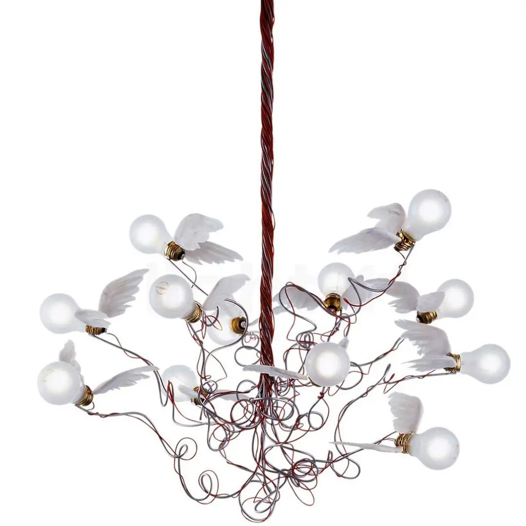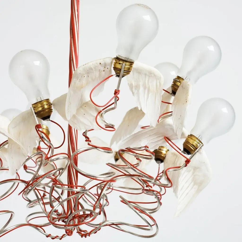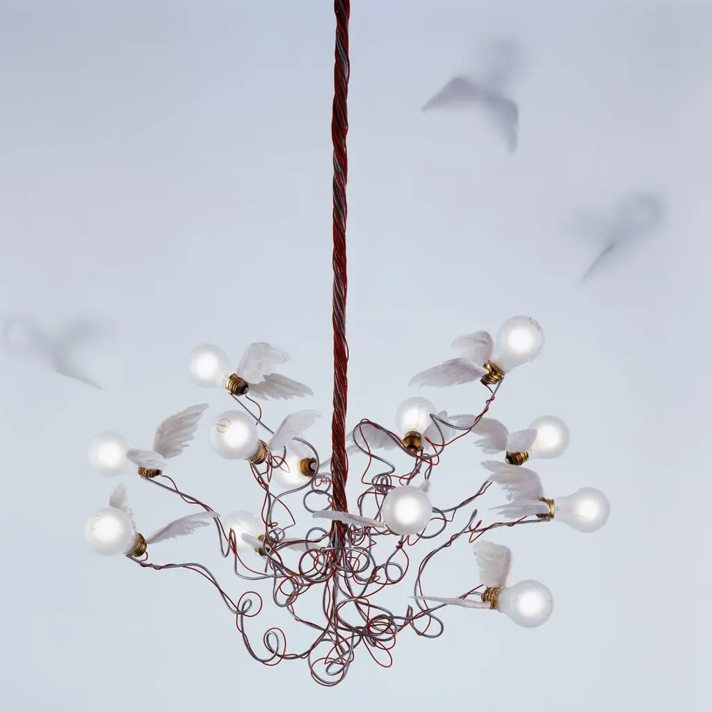 'Birdie' pendant lamp in red and goose feather wings for Ingo MaurerDesigned and produced by Ingo Maurer, one of the most celebrated German lighting icons since 1966. With imagination, creativity and technical prowess, Maurer’s lamps have been explicitly designed to “stimulate the imagination and excite the emotions.” Today his Munich workshop continues to craft celebrated creations true to the one of a kind spirit of the firm’s founder.The 'Birdie' pendant creatively features goose wing feathers allowing this lamp's light to 'give flight' around the swirling and adjustable wire structure. Unique feather-shaped shadows are the result of this Maurer masterpiece.. Executed in tinned copper wire and goose feather wings with thoughtful attention to detail, use of high quality materials and incomparable craftsmanship. Price per item. Available in to order in unlimited quantities with either red or transparent wiring. This listing is for the 'Birdie' with red wiring, please see our separate listing for the 'Birdie' with transparent wiring.In stock lead time 1-2 weeks. Out of stock can add an additional 8 weeks or more. Please note that inventory availability subject to change without notice. For time sensitive orders please contact us for current lead times prior to purchasing. Illuminated via 12 low voltage LED bulbs (bulbs included) each providing 1.5 watts, creating 1200 lumens at 2600k color with CRI >95. Dimmable according to switch (switch not included). Standard length of fixture is 39" but can be customized to a longer length for an additional cost. Canopy houses low voltage transformer. Not UL listed, but recommended UL listing possible from an authorized 3rd party vendor for an additional fee. Contact us to facilitate.Made to order. All sales are final.