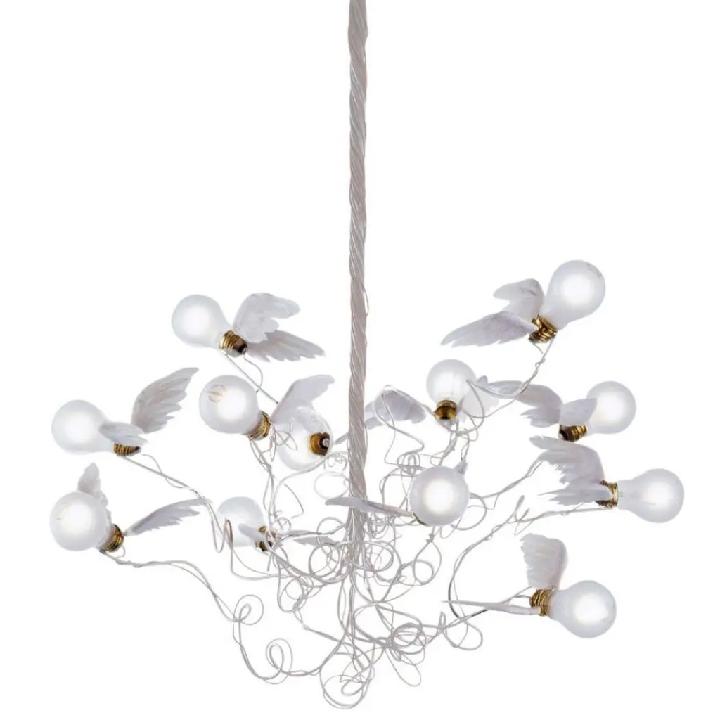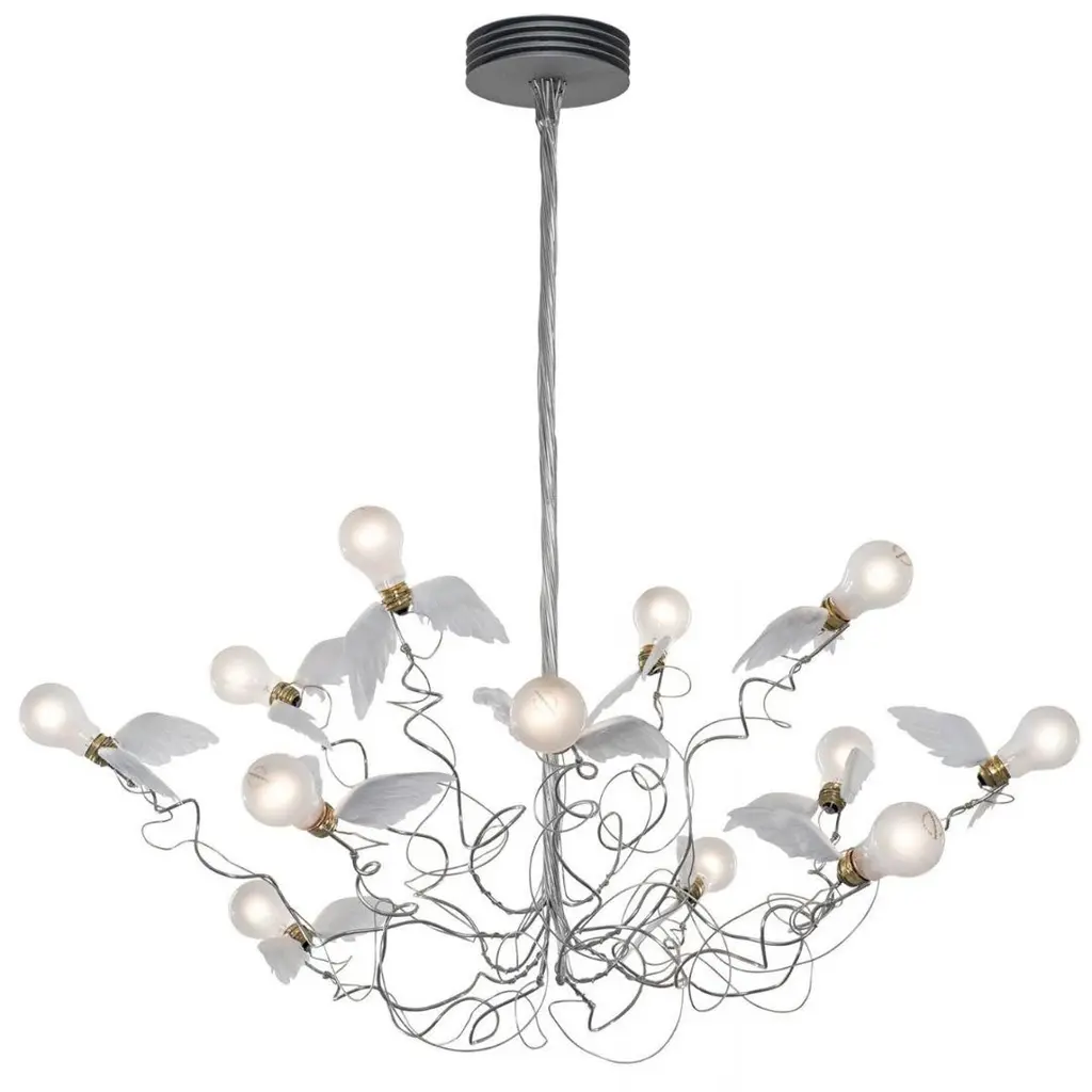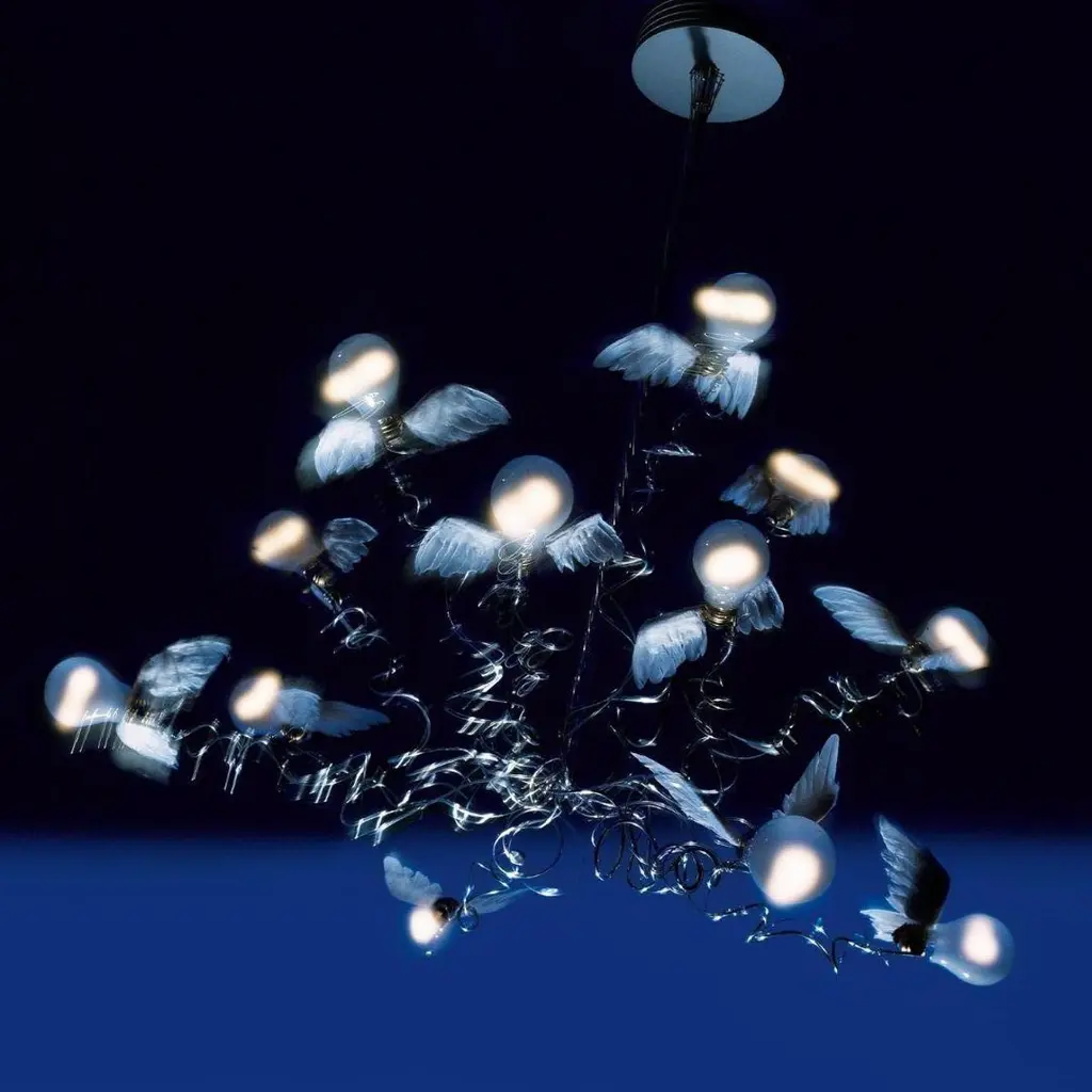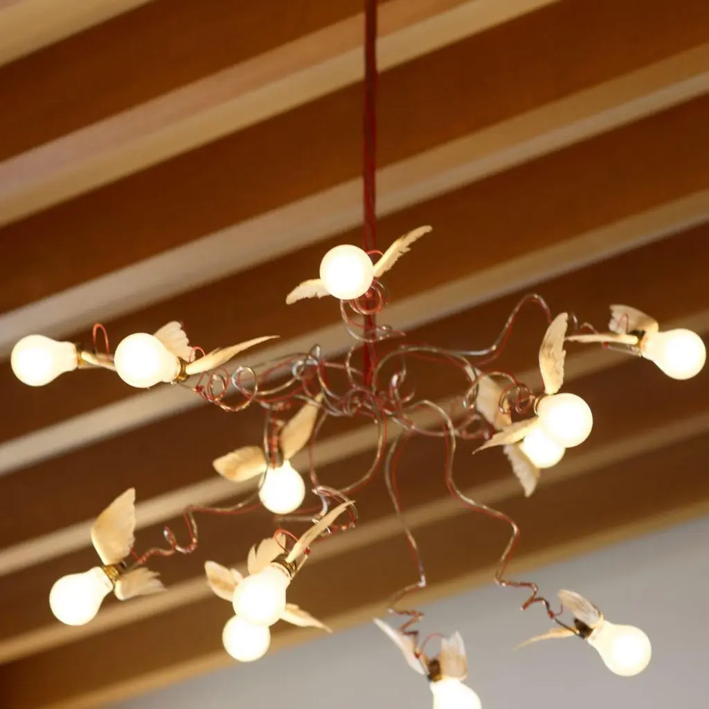 'Birdie' pendant lamp in red and goose feather wings for Ingo MaurerDesigned and produced by Ingo Maurer, one of the most celebrated German lighting icons since 1966. With imagination, creativity and technical prowess, Maurer’s lamps have been explicitly designed to “stimulate the imagination and excite the emotions.” Today his Munich workshop continues to craft celebrated creations true to the one of a kind spirit of the firm’s founder.The 'Birdie' pendant creatively features goose wing feathers allowing this lamp's light to 'give flight' around the swirling and adjustable wire structure. Unique feather-shaped shadows are the result of this Maurer masterpiece.. Executed in tinned copper wire and goose feather wings with thoughtful attention to detail, use of high quality materials and incomparable craftsmanship. Price per item. Available in to order in unlimited quantities with either red or transparent wiring. This listing is for the 'Birdie' with red wiring, please see our separate listing for the 'Birdie' with transparent wiring.In stock lead time 1-2 weeks. Out of stock can add an additional 8 weeks or more. Please note that inventory availability subject to change without notice. For time sensitive orders please contact us for current lead times prior to purchasing. Illuminated via 12 low voltage LED bulbs (bulbs included) each providing 1.5 watts, creating 1200 lumens at 2600k color with CRI >95. Dimmable according to switch (switch not included). Standard length of fixture is 39" but can be customized to a longer length for an additional cost. Canopy houses low voltage transformer. Not UL listed, but recommended UL listing possible from an authorized 3rd party vendor for an additional fee. Contact us to facilitate.Made to order. All sales are final.