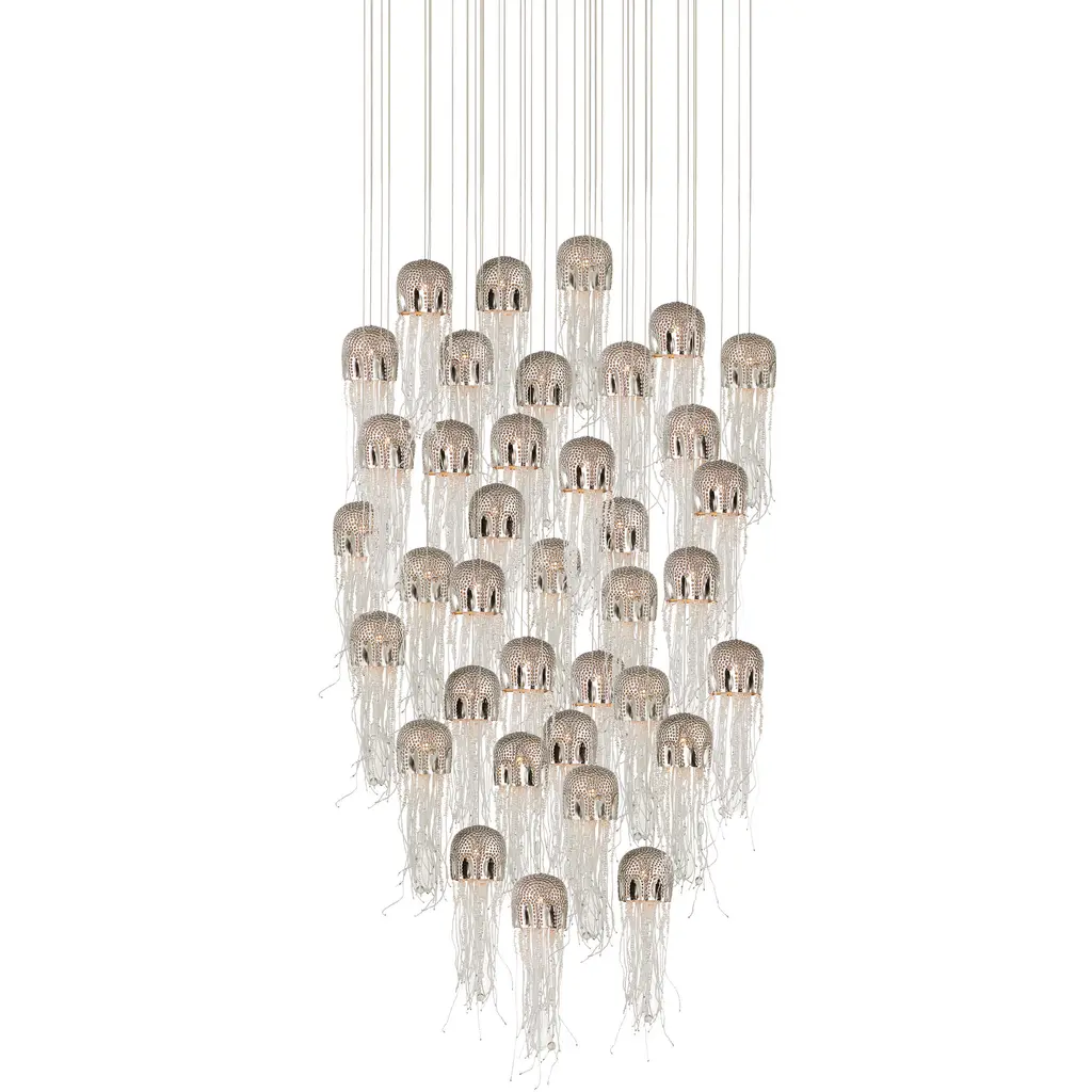 The Birds Nest 36-Light Multi-Drop Pendant is an effervescent beaded pendant that looks like luminous nests. Rather than twigs, the shades are made up of whorls of clear beads strung along pieces of wire. It takes many hours for our artisans to create these shades that look so whimsical. This fixture is among Currey & Company’s introduction of cluster lights, which includes 1-light up to 36-light configurations.