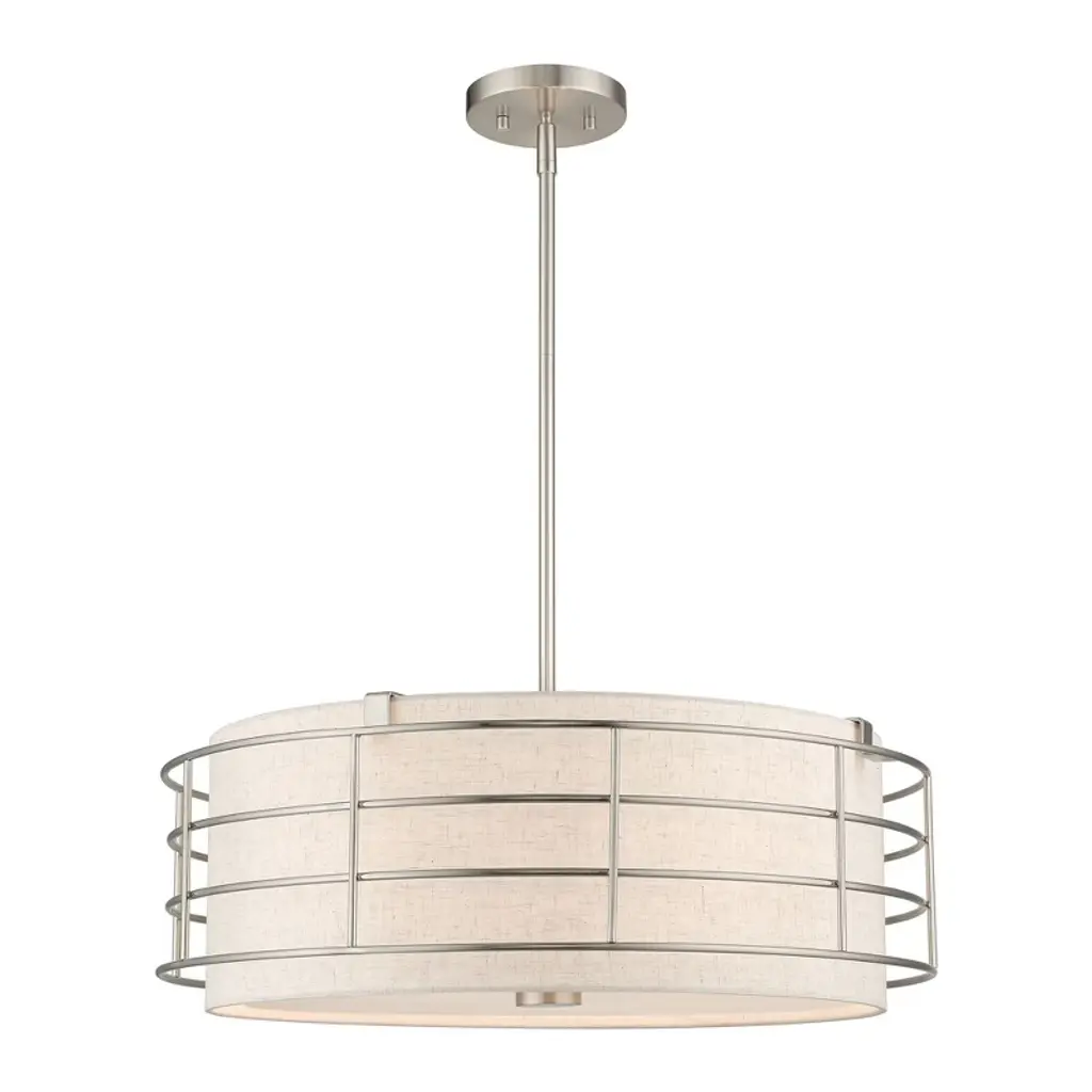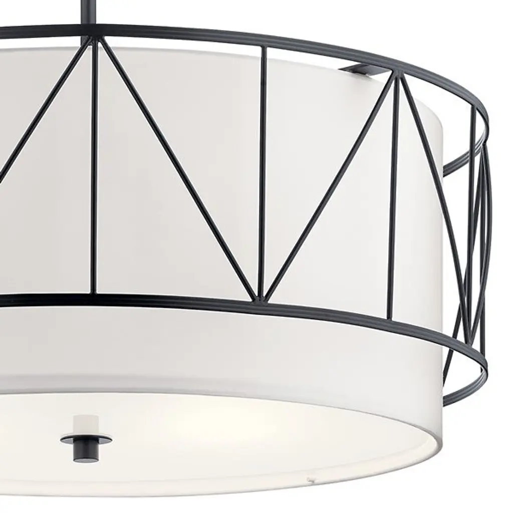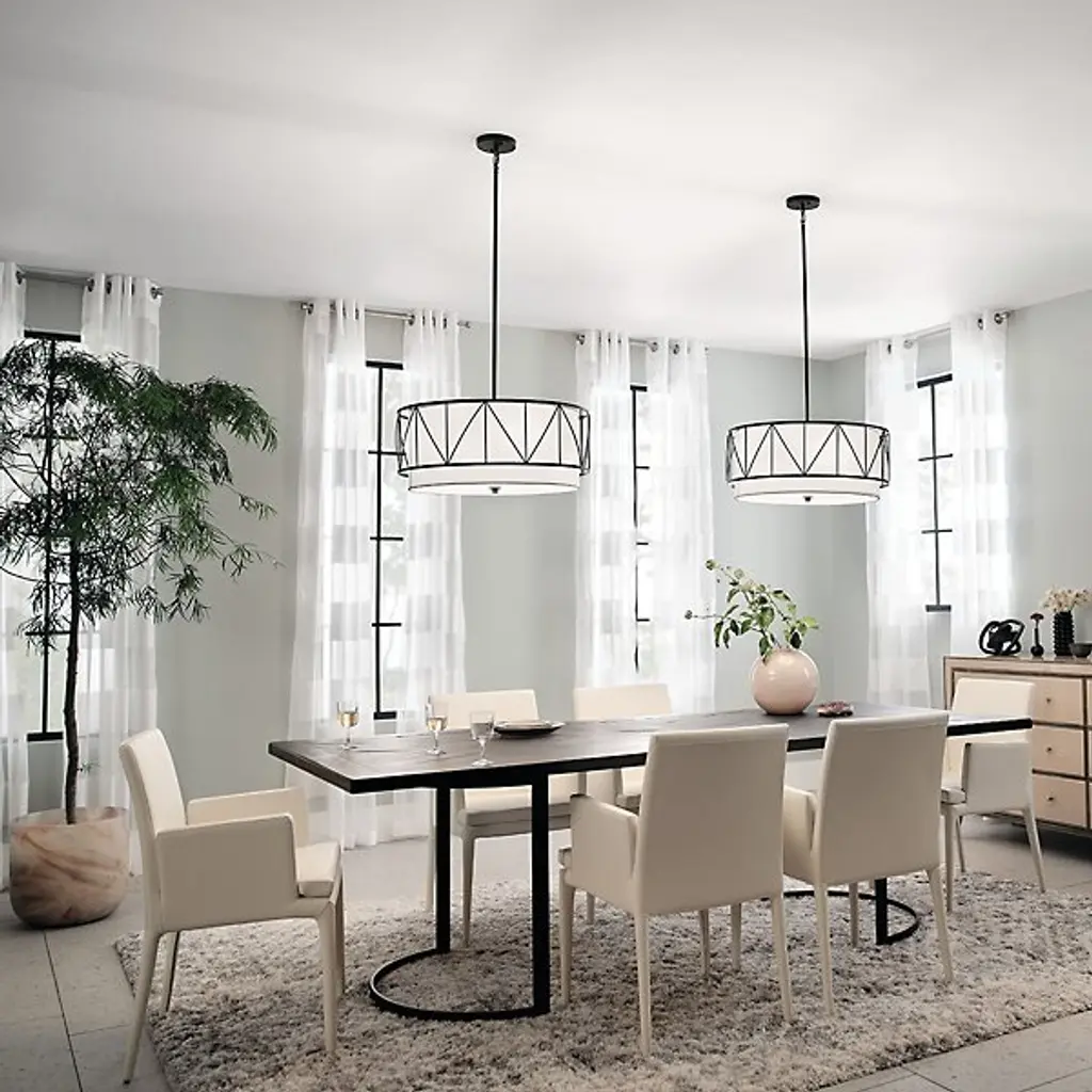 Fill your dining room with light and enhance its elegant personality with the clean geometry of the Birkleigh Drum Pendant from Kichler. On its own or in sequence, this piece invites a gathering around its presence. It seduces you with a clean metal frame highlighted by an eye-pleasing composition of triangular shapes. The soft surface and the creamy white hue of its linen shade heightens the dazzling movement of the frame. Its light filters through the linen shade and an etched glass plate in a bountiful feast of glare-free light.