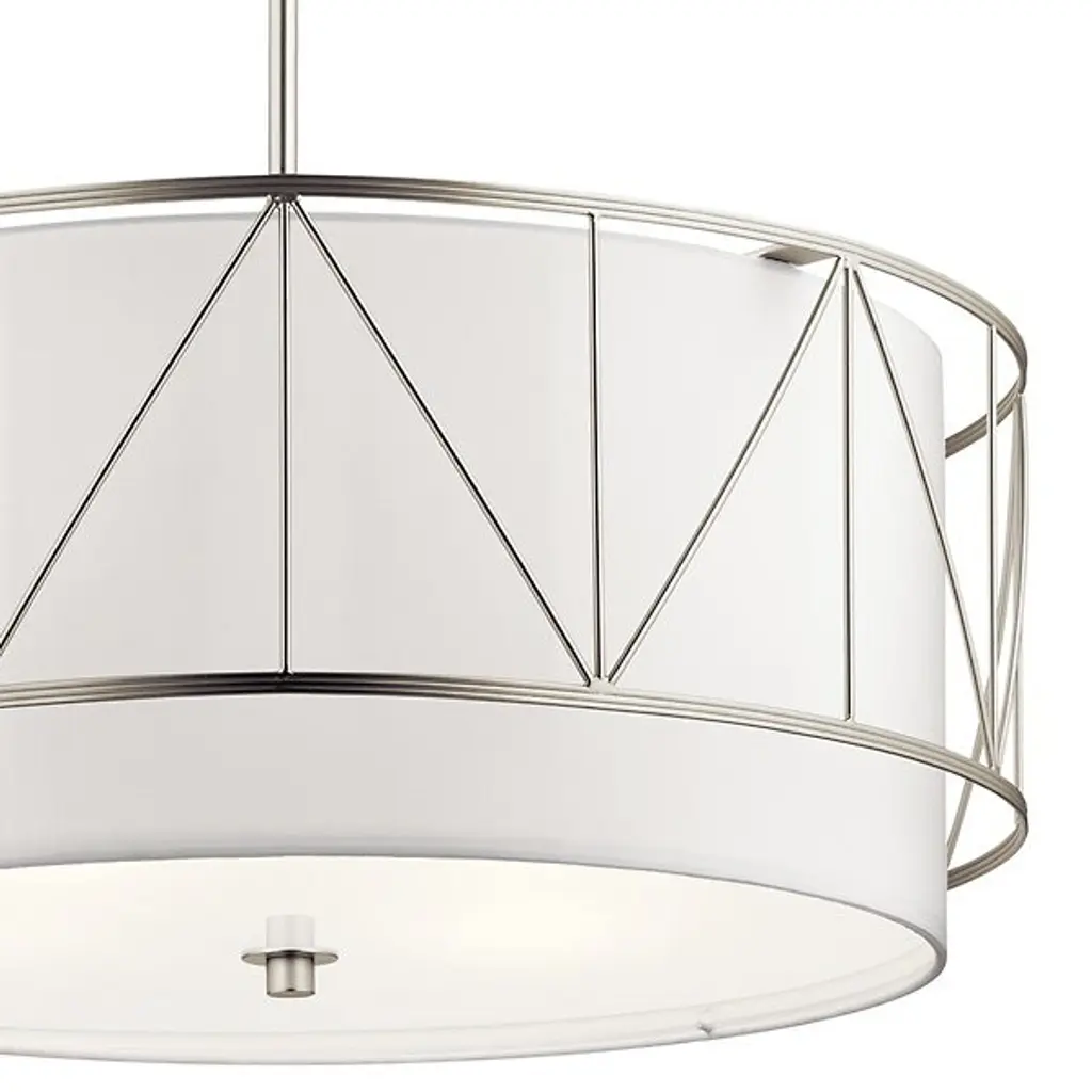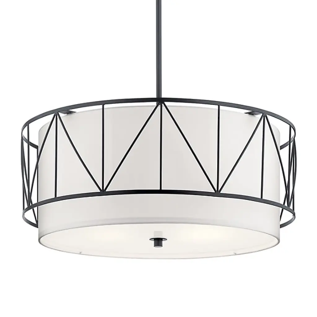 Fill your dining room with light and enhance its elegant personality with the clean geometry of the Birkleigh Drum Pendant from Kichler. On its own or in sequence, this piece invites a gathering around its presence. It seduces you with a clean metal frame highlighted by an eye-pleasing composition of triangular shapes. The soft surface and the creamy white hue of its linen shade heightens the dazzling movement of the frame. Its light filters through the linen shade and an etched glass plate in a bountiful feast of glare-free light.