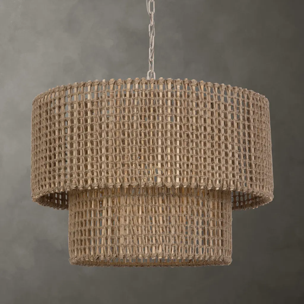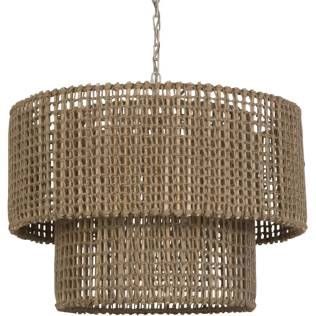 Natural Woven Jute Rope Makes Up The Two Tier Shade Construction Of This Breezy Pendant Accented With Antique Brass Adding A Dressed Up Feel To The Look. 1-100 Watt Max, Edison Socket. Bulb Not Included. Supplied With 15' Wire, 7' Chain For Adjustable Installation.