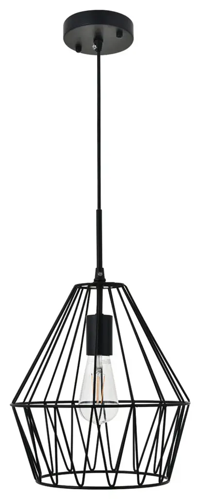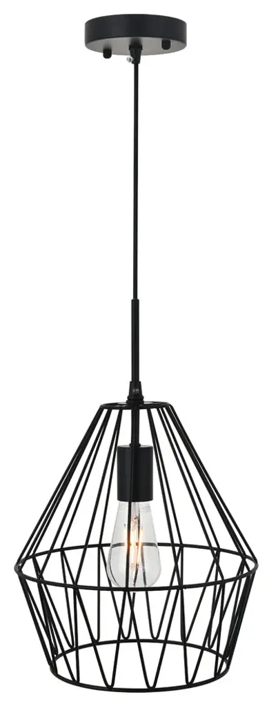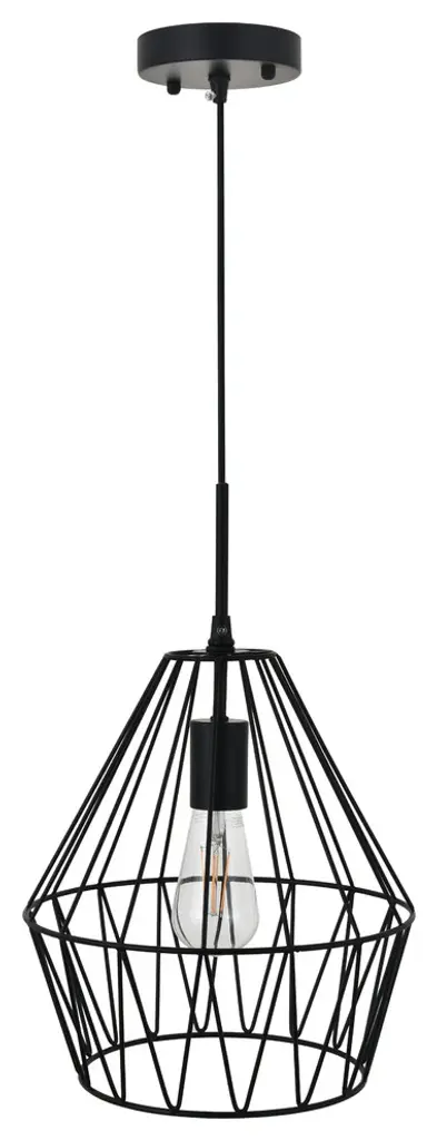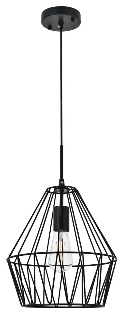 Light shines through the elegant black finish cage in this pendant. Its interesting design lends modern glamour and trendy style to any room. whether it shines in the foyer or illuminates a bedroom, its fun design will have you charmed.Hanging black finish pendant with a contemporary open geometric shadeRequires 1 E26 bulbs (bulbs not included)Open geometric black finish metal shadesuspended from a black finish adjustable cord cord length: 59"Minimum hanging height: 25"; Maximum hanging height: 78"assembly required: yes