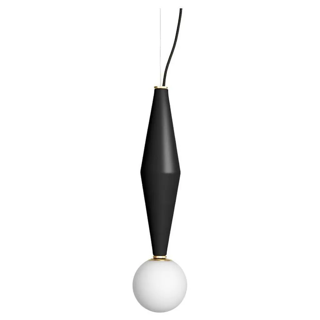 Black Gamma C lamp by Mason EditionsDimensions: 12 × 12 × 37 cmMaterials: aluminium and blown opal white glassColours: pink, burgundy, light grey, sage green, petrol green, black.All our lamps can be wired according to each country.Gamma is the third letter of the Greek alphabet and also the third brightest star in the constellation.It’s in fact an alphabet of three aluminium elements, that creates a range of six modular suspensions. The frosted glass spheres contain the luminous soul which, combined in different ways with the metal elements, give life to new solutions that look like constellations. Pendant light fixture with an elegant but bold silhouette. Hang it to the ceiling at different heights with other Gamma pendants to create a scenographic luminous composition. Available in pink, burgundy, sage green, petrol green, light grey and black.Mason Editions is an Italian company specialized in the production of design furniture, lighting solutions and accent pieces. Born from the lifelong passion for lighting and entrepreneurial spirit of Fabio and his partner Silvia, Mason Editions places itself halfway between fine art and exquisite craftsmanship. A collection of lighting, design objects and furnishing accessories, signed by artists Serena Confalonieri, Martina Bartoli and Matteo Fiorini, head of the creative direction. Mason Editions comes from the experience of an Italian lighting company placed in the Veneto region. This new brand of furniture elements was born from the meeting between the entrepreneur Fabio Mason and three international designers who designed the first collection for a sophisticated public. Therefore the collection wants to be eclectic and timeless. The material contrast and fresh design, with essential shapes, mark the mason editions collection. In conclusion, the elegant Italian sign highlights proposals suitable for all environments. Mason editions is a set of experiences, artisans, and productive know-how that creates a capable system.