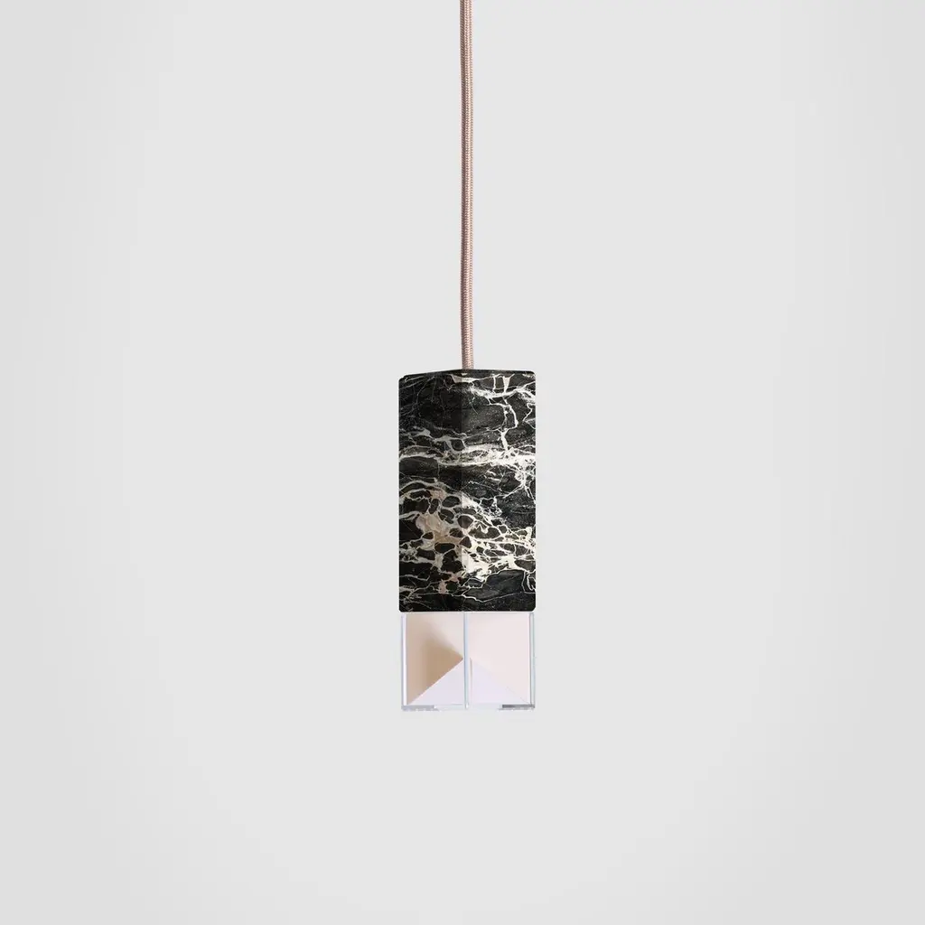 Lamp one color Edition by FormaminimaDimensions: 5 x 5 x H 17 cmMaterials: Lamp body in Marble Rosso CollemandinaUltra- thin anti-reflection crystal diffuserInside- diffuser Limoges biscuit-finish porcelain sheetsSatin brass ceiling rose H 5 x 5 x 5 cmLight source supplied per lamp:LED 1xG9 max 2.6W, 50-60Hz G9 connection320lm 2700K Rc 80 EU standard compliantVoltage: 220-240v (120v available upon request)Supplied accessories:Adjustable fabric cable: 2 x 0.75 Ø 6.2 mm L 2mMounting kit: screws UX Fischer screws (2x)Ø 6mm x 30mm, satin brass ceiling roseDecorative pendant lamp for indoor use.We chose to employ exclusively local materials, respecting, preserving and enhancing traditional techniques, such as marble-carving, crystal-glass grinding, Limoges porcelain mold-production. The Colour-Edition Chandelier shows handcrafted decorative hanging lamps realized through a selection of iconic italian marbles, inspired by the most outstanding artistic movements of our Territory. Thisobject represented our tribute to Edit Napoli 1st Edition ( June 2019).Rosso Collemandina, original of Villa Collemandina, part of the “Appennino Tosco-Emiliano” National Park, is appreciated for its rich and intense chromatic tones.Verde Alpi is extracted from the heart of Western Alpes at 1.800 metres of altitude, in Val D’Aosta region. Its dramatic contrasts recall iconic architectures, thanks to itsdistinctive character. Giallo Reale Rosato, belonging to the gentle landscape of Verona, is celebrated for its prestigious yet eclectic touch.Both The Single Suspension series as well as The Chandelier series are characterized by the same endless passion for simplicity and attention for details that best representus. The inspiration, as well as the genesis of the entire design process, that led to the creation of the collection, belongs to the world of Porcelain, to its surface andstructural characteristics. Therefore, our project was born from the exploration of two-dimensional geometries on one hand, and on the other one, from the design intentaimed at researching lightness and thinness, bringing them to unforeseen results. As a consequence, this was a path subject to curiosity, to research, to the story of how alight beam may transform the features of a marble surface becoming translucent, and a porcelain sheet turning as thin as an eggshell.Formaminima is an emerging brand within the Italian Design panorama, prone to exploring the concept of object itself, in the field of lighting and product designin its broadest sense. This exploration starts in the first instance from the tradition, from the artisan mastery and that making full of charm, care, and perseverance.Each project is in fact crafted in those same places where the know-how is handed down and kept for generations, exclusively in our territory. Carefully selected workshops, ateliers, and studios become our precious partners in the creation of every single piece, conceived and designed by us. Therefore, in this latter, multiple knowledge is merged, especially that linked to high-quality materials, production processes, and an innovative aesthetic. Thus to achievewhat for us represents a contemporary Design Sleek Poetry.We create value through the masterly realization of unique pieces, as well as minimizing the intermediation between the Design product and its audience. Hence our projects result in the outcome of a direct collaboration between our designers and the excellence of Italian craftsmanship, along with its valuable know-how. To this end, we believe that a slow design process, together with its time of thought andresearch, is essential for what we believe Good Design may be.So this latter, passing from the inspiration to the concrete realization of each of our design creation, arrives directly to the customer.