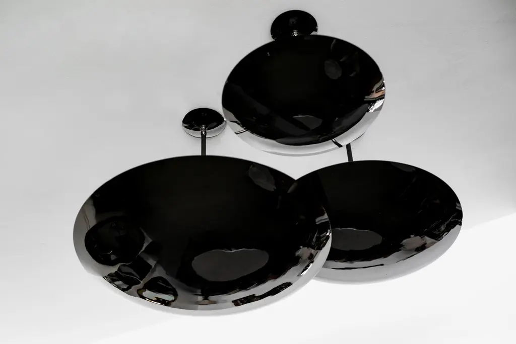 Beautiful 18" Blackened Nickel plated dome ceiling pendant produced by Orange.Available in multiple finishes and sizes - This listing is for the smallest 18" size. 18" - $4,50024" - $4,50030" - $5,50036" - $5,50048" - $7,50018 - 2 bulbs - medium base - 40 watts 24 - 2 bulbs - medium base - 40 watts 30 - 4 bulbs - medium base - 40 watts 36" - 4 bulbs - medium base - 40 watts 48" - 4 bulbs - medium base - 40 watts