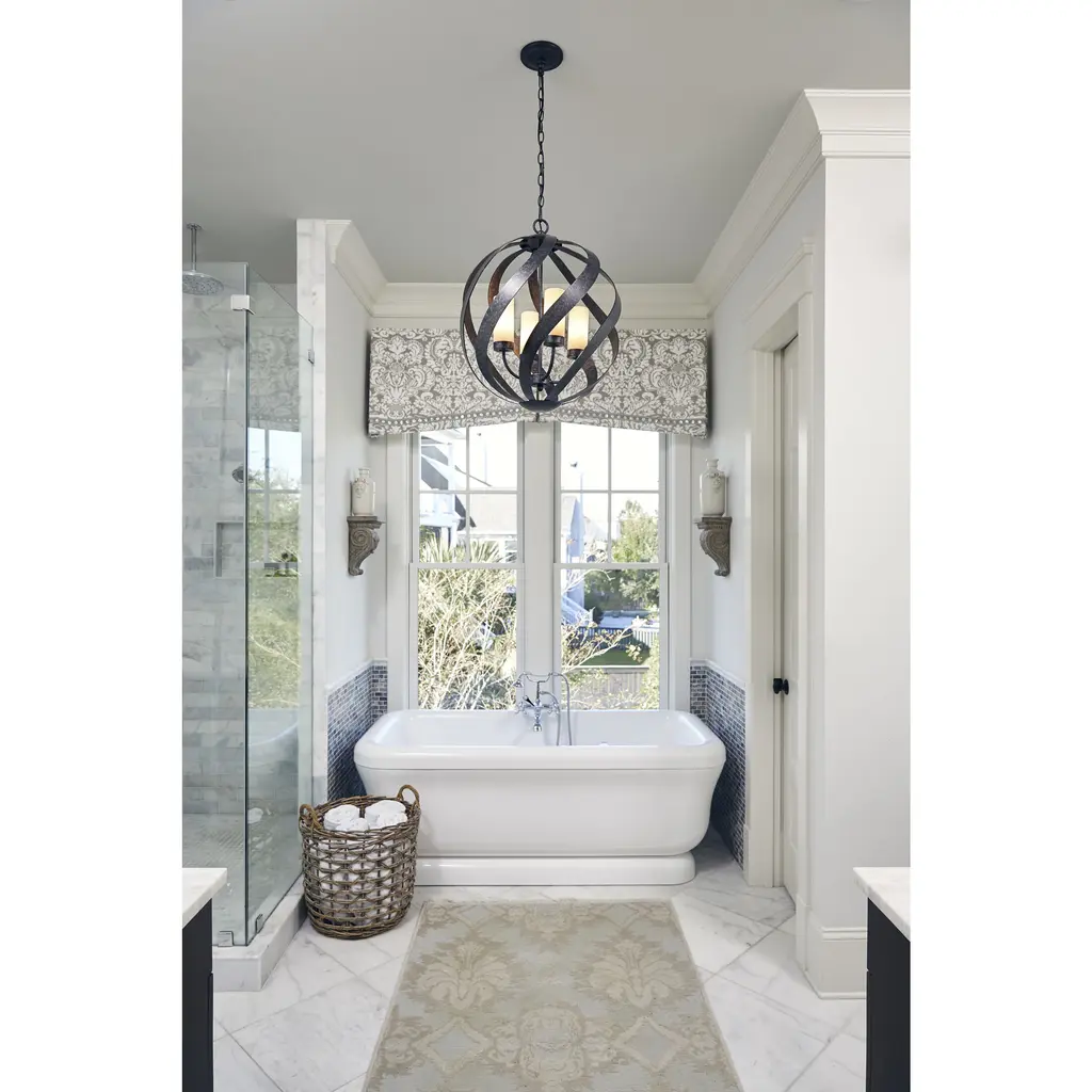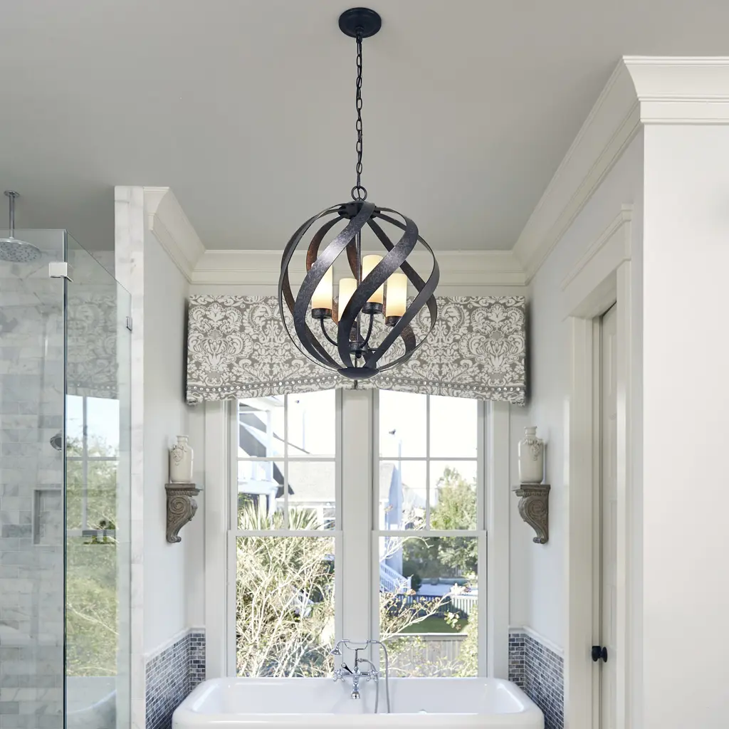 A spiral sensation, the Blacksmith's bold ironwork moves in soft curves along an orb-shaped silhouette. The old black finish includes accents of charcoal and dark silver for a sultry smokelike effect. The candles are fitted with cylindrical shades in frosted glass that soften the light of this stunning collection.