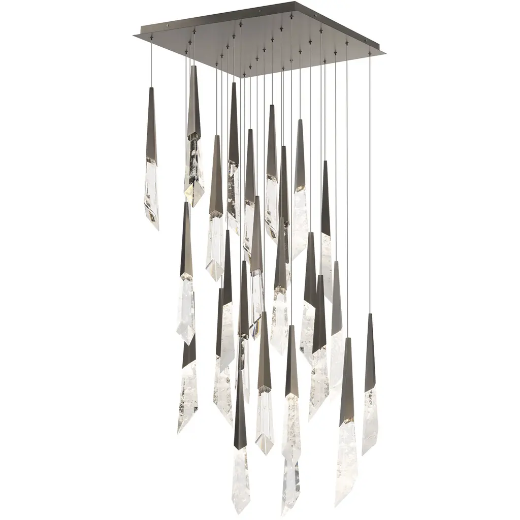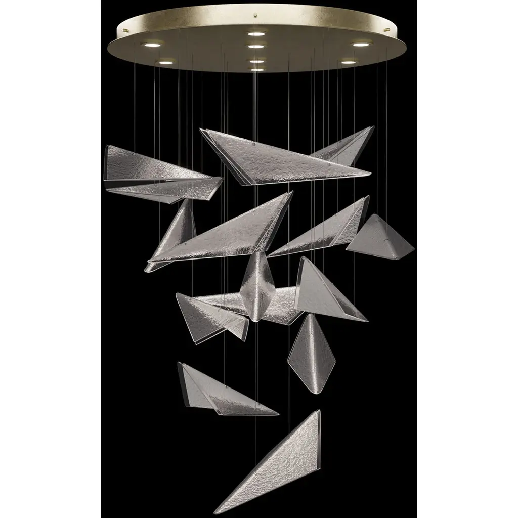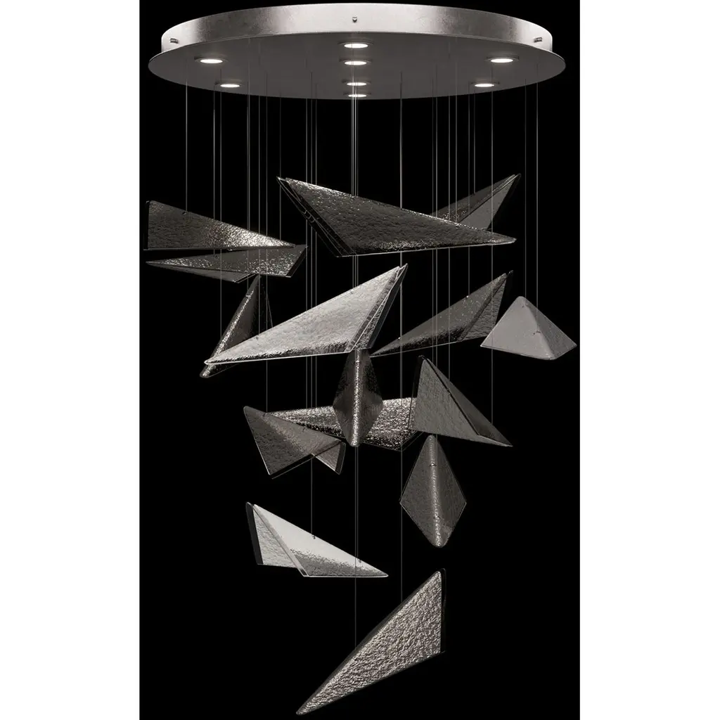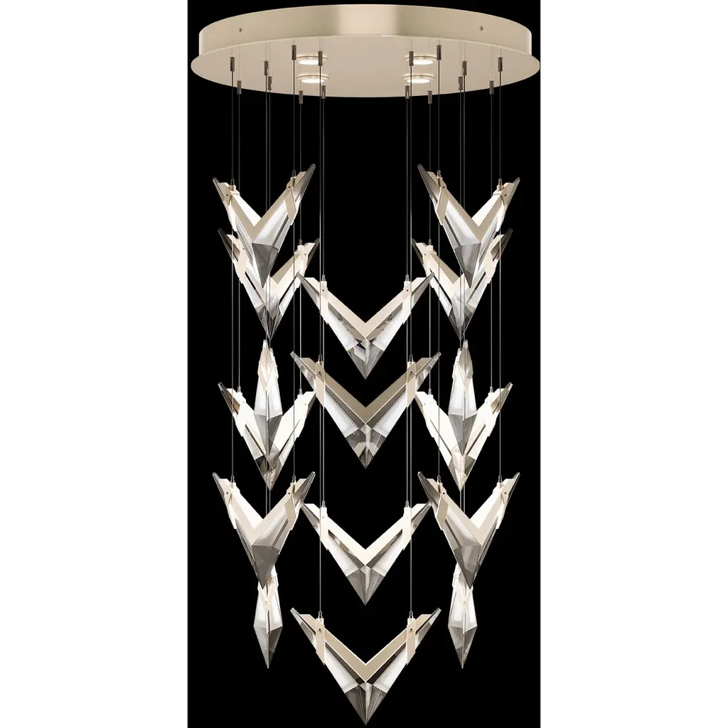 Inspired by the bold geometry of chevron shapes and the sleek lines of modern aircraft, Blade brings a sense of motion and precision to lighting design and merges sleek design with modern functionality. Pendant features cut crystal and integrated LEDs in Standard Black Iron or Champagne finish. Dark Walnut stained wood featured on select items adding warmth to the metal forms.