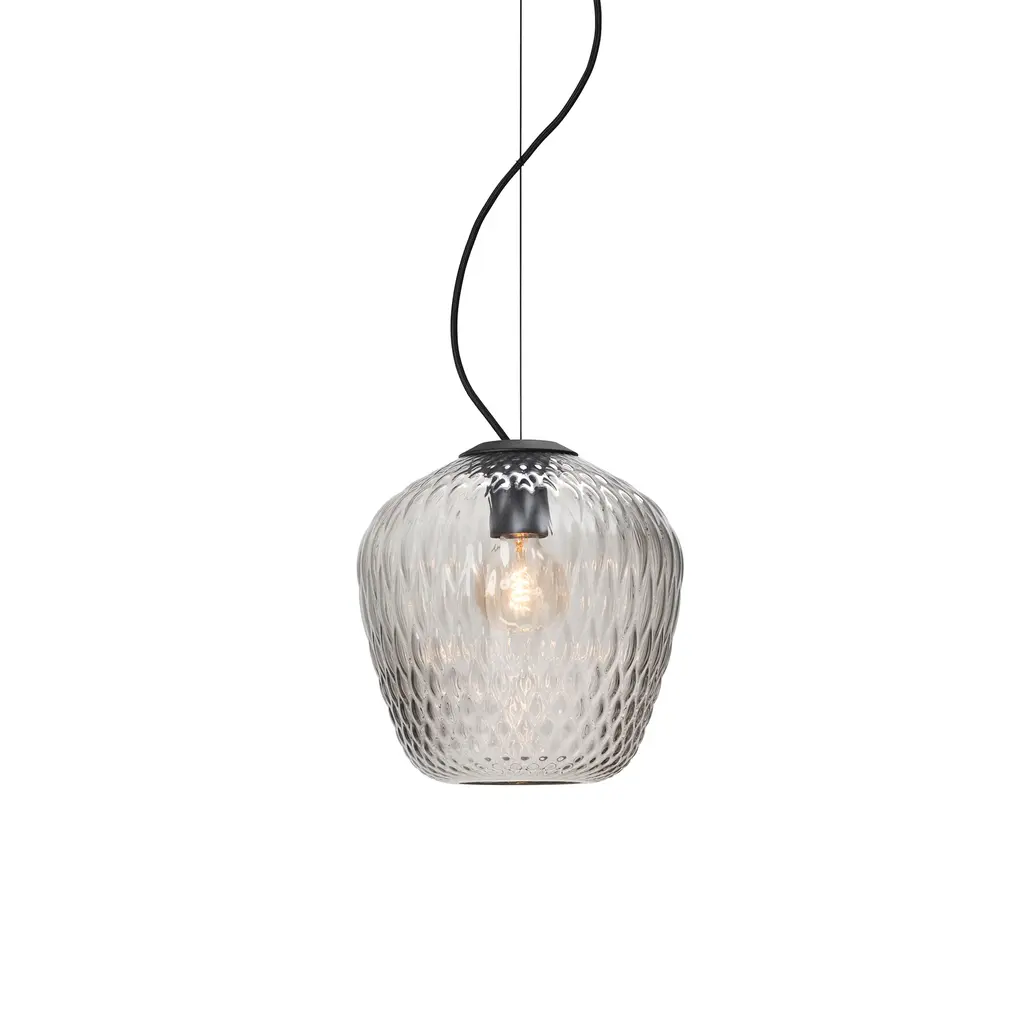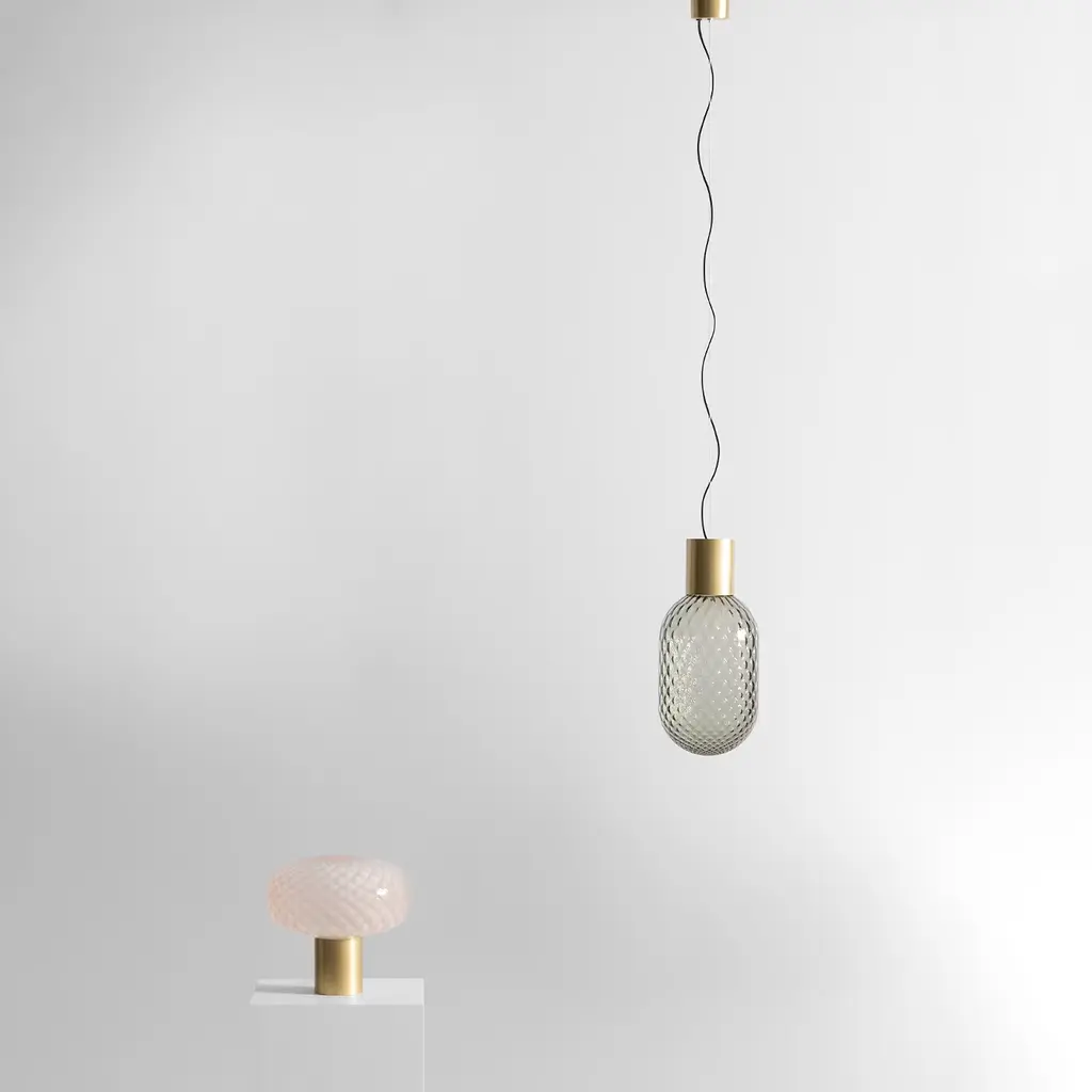 The Bloom collection of lamps is reminiscent of the precious nature of perfume bottles and diffusers of oriental essences. The type of glass gives rise to different light effects. The magical object comes alive as a single piece or in a combination of several versions. The collection includes pendant lamps, table lamps and wall lamps. The grey or pink glass, also available in a satin version, features a ‘balloton’ detail, a traditional Venetian technique with a special optical effect.