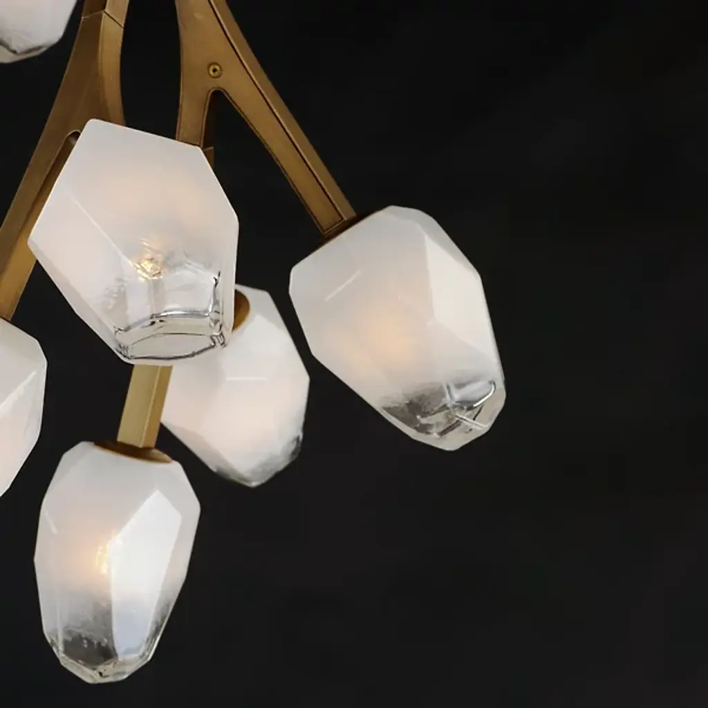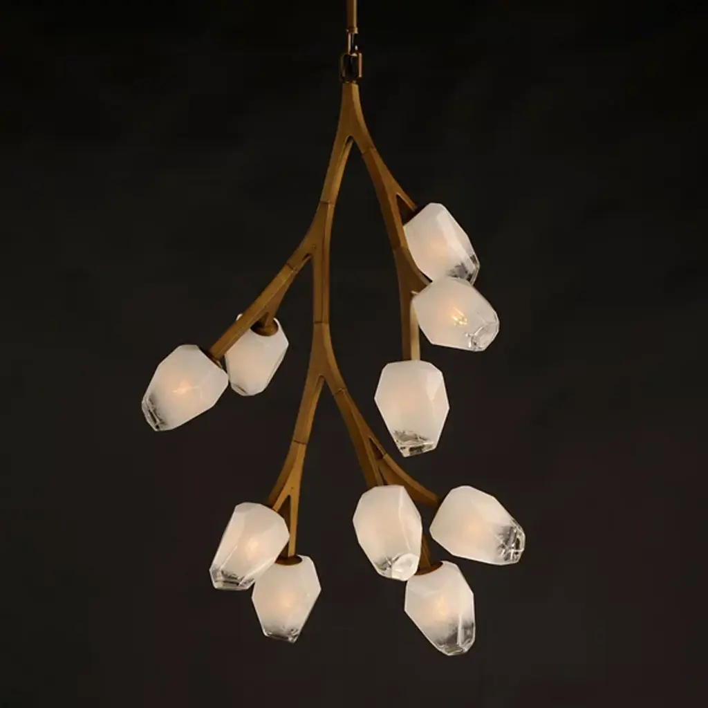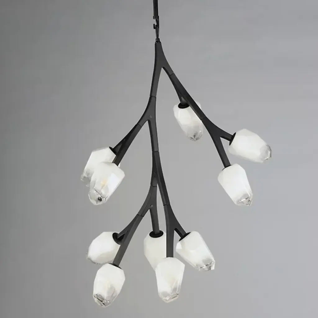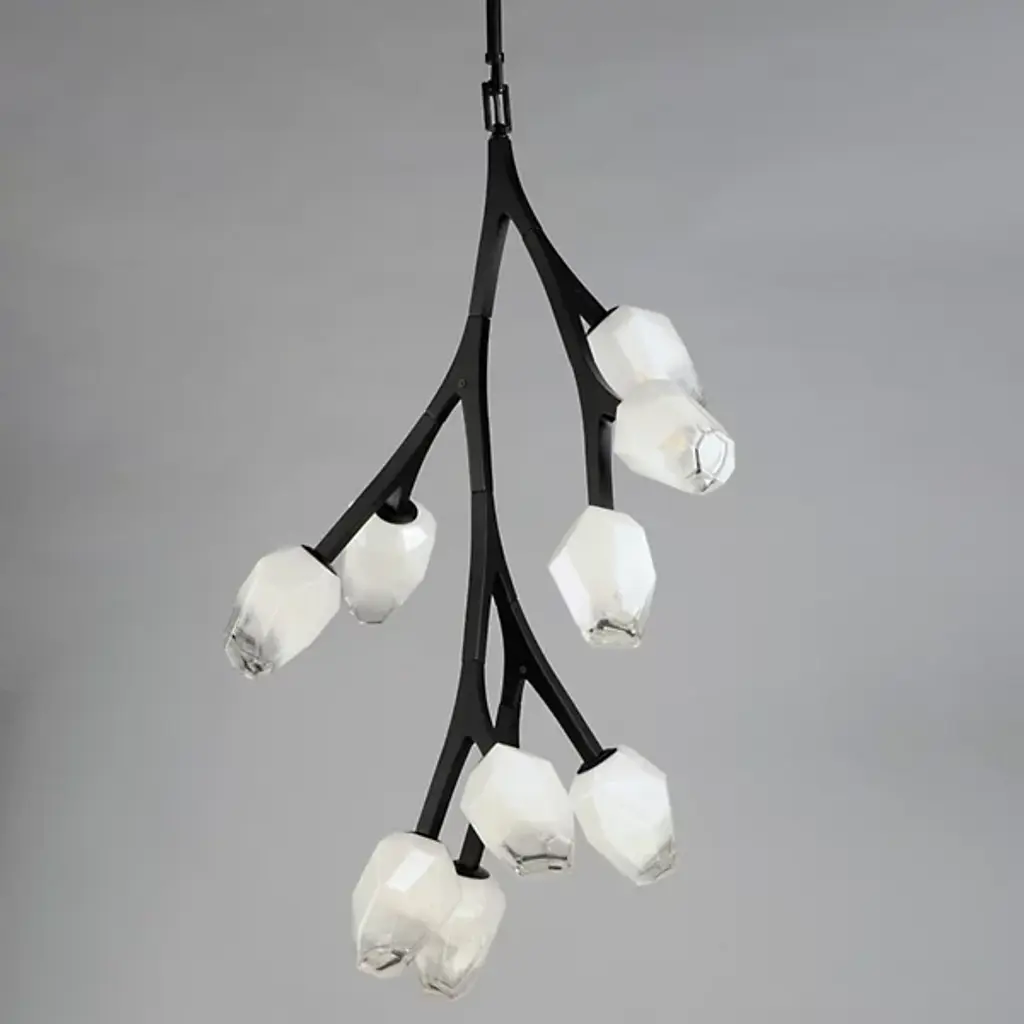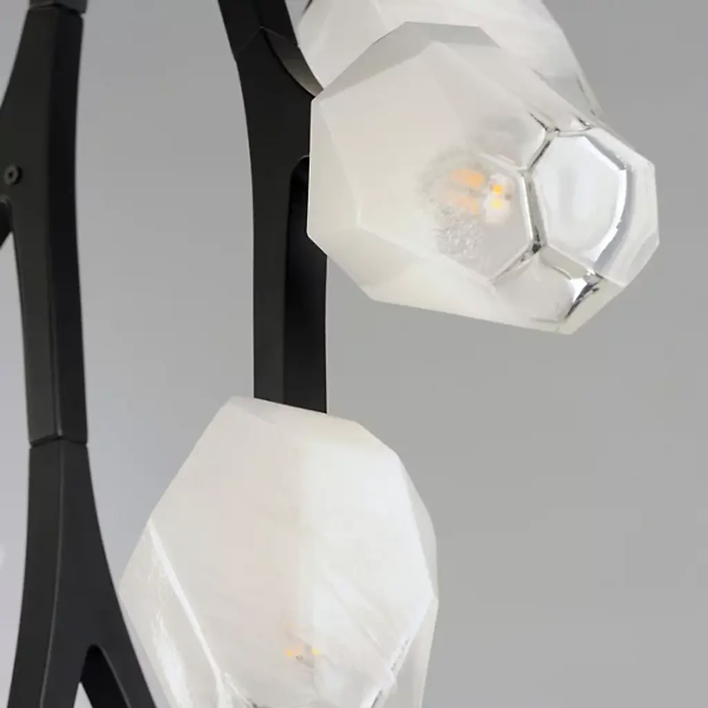 Add a stylish spray of frozen floral shapes to your inside spaces with the Blossom Multi-Light Pendant from ET2 Lighting. Inspired by nature and descending from a stepped, circular canopy via a slender stem attached via short links of chain, its lower structure is made from smooth metal arranged in a fluidly branching assembly. Each branch terminates in a small, strong LED lamp set inside a faceted shade of Morning Frost glass that is translucent to the sides and clear at the end, easily able to shed a mix of wide-reaching warmth and focused downlight without overpowering its surroundings.