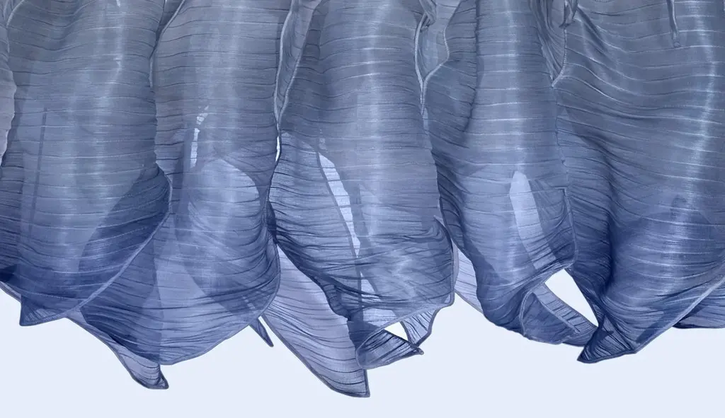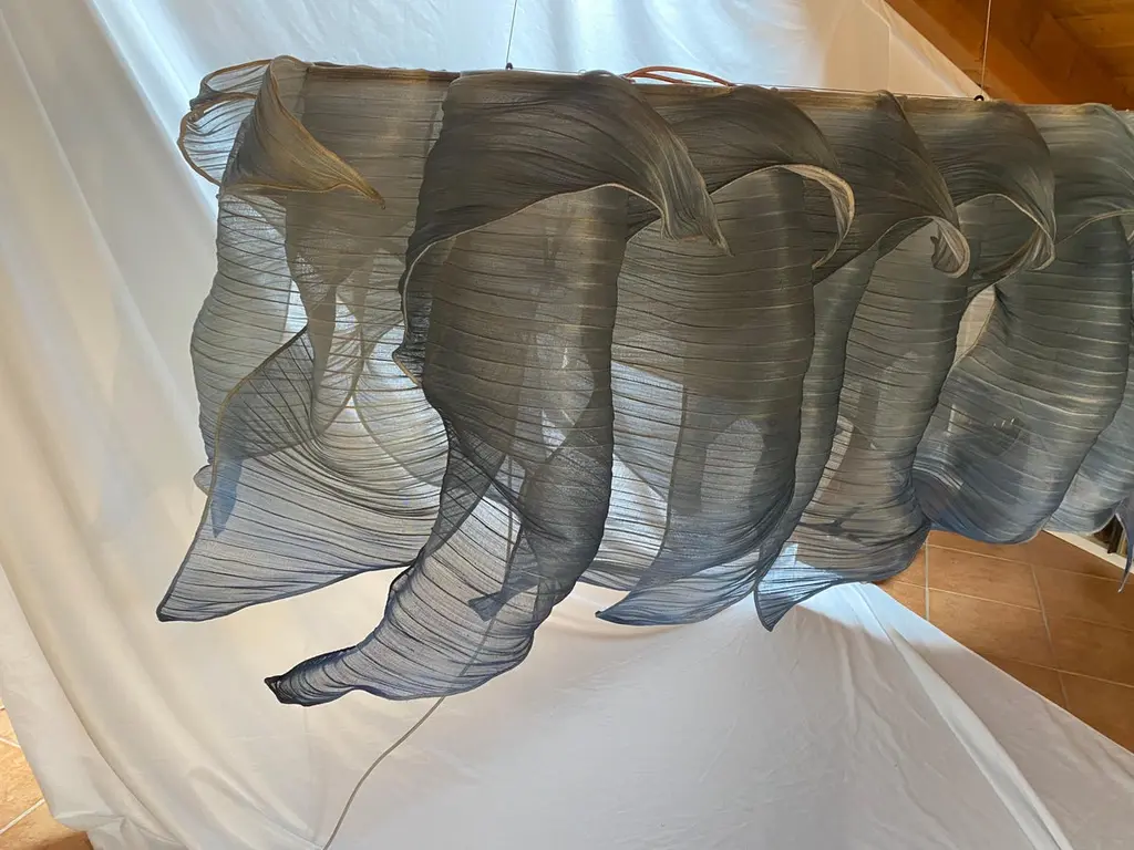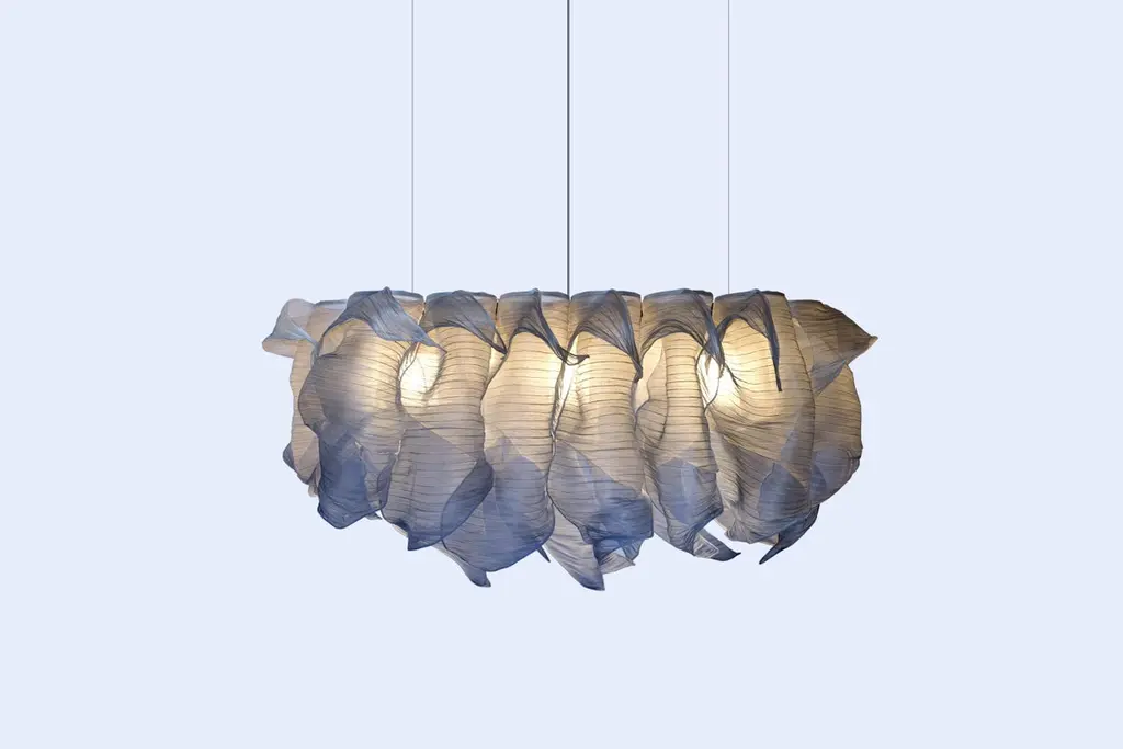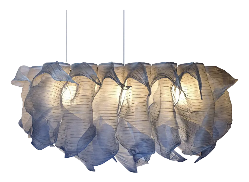 Blue Nebula Grande hand-painted pendant lamp by Mirei MonticelliDimensions: D 150 x W 50 x H 60 cmMaterials: Banaca fabricAlso available in hand-painted fabric.The lamp is made in banaca fabric and carefully constructed to create this intricate spiraling shape. The pliability of the constructed fabric lets it have a life on its own. They can also be reshaped to the owners liking.Mirei is a Milan-based multidisciplinary designer who started her career in her birth place, the Philippines. Working from her roots has exposed her to the world of traditional manufacturing and production of furniture, where everything is made by hand. This environment exposed her to the beautiful world of artisan crafts, but then gave her the yearning to explore state-of-the-art techniques that come from the western world – which led her to study at Politecnico di Milano with a Masters degree in Design and Engineering in 2017. In 2019, she founded Studiomirei. On the same year, she won the Salone Satellite special mention award for the Nebula lamp during the Salone del Mobile.