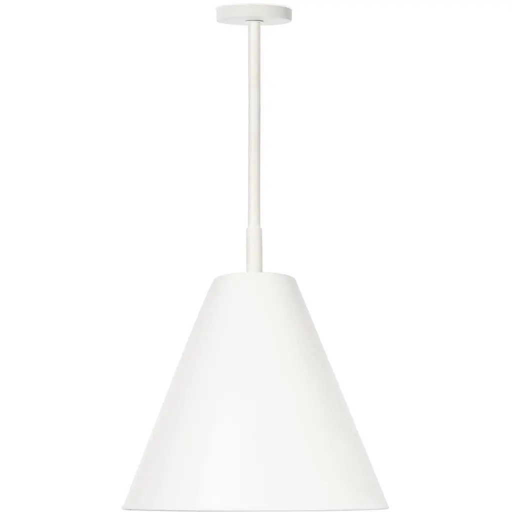 The Bluff Outdoor Pendant is a sleek, cone-shaped fixture with a powder-coated, satin finish both on the exterior and interior of the shade. The entirely metal fixture is suspended from a single pipe for a truly modern aesthetic. Add this fixture to your exterior living space as a unique, sculptural detail during the day and as a simply stunning luminary by night. Regina Andrew outdoor lighting pieces are constructed with the best quality materials to live amongst the elements while providing the signature, designer style that RAD customers know and love.