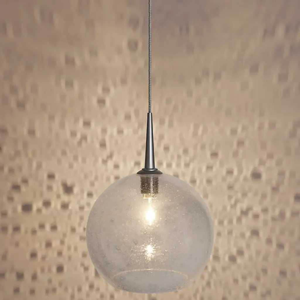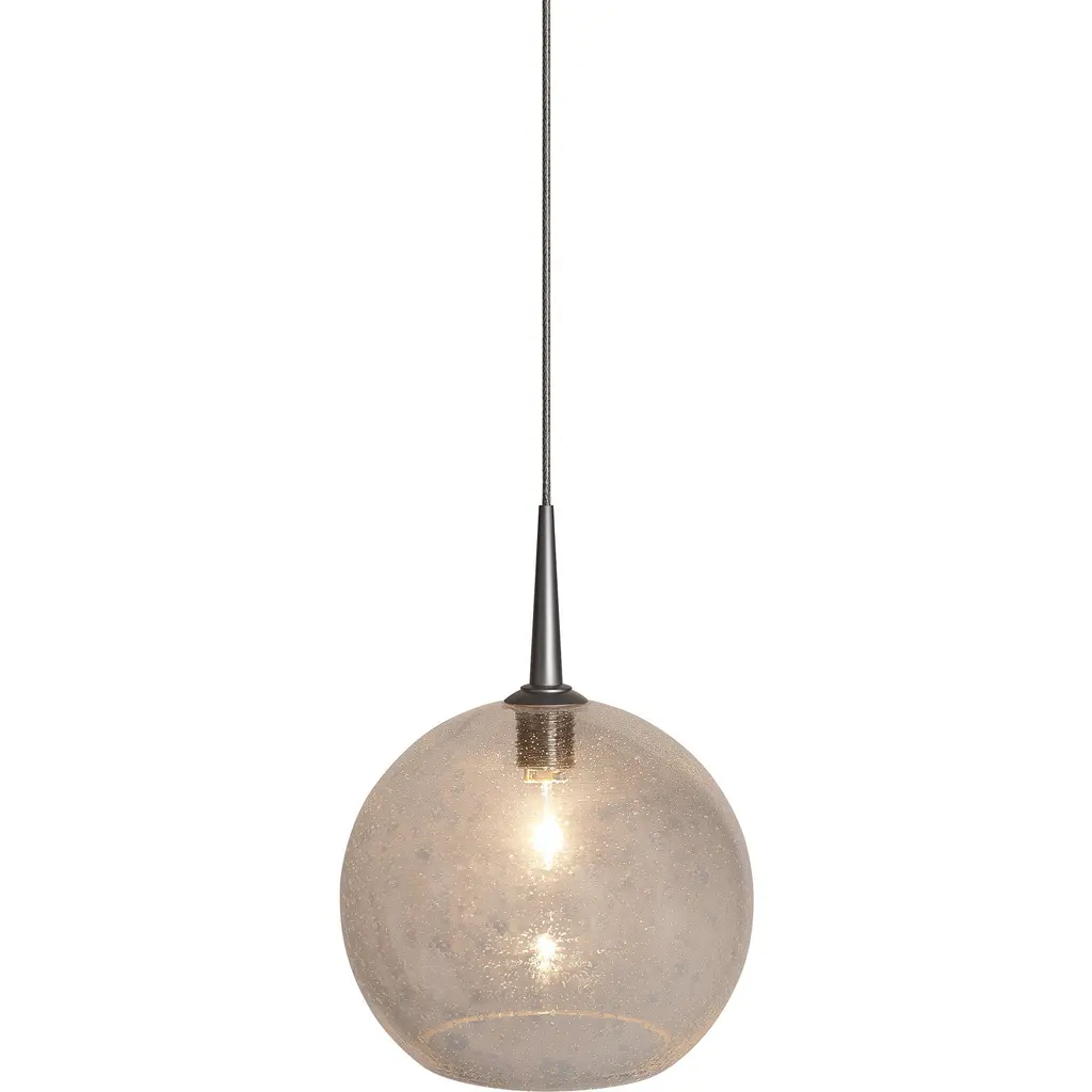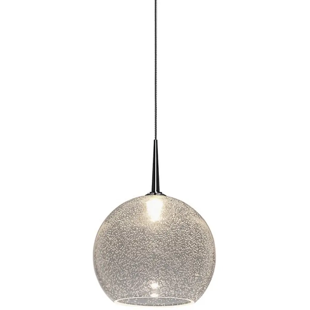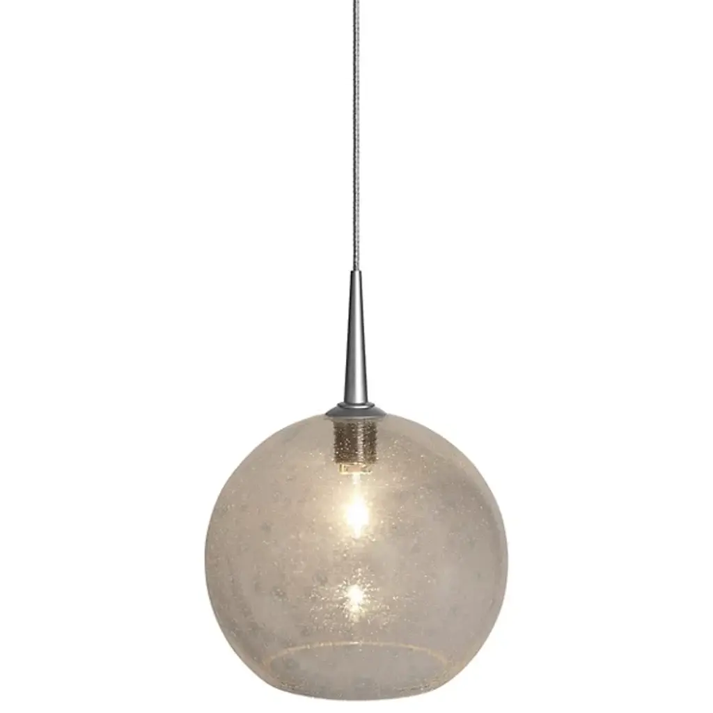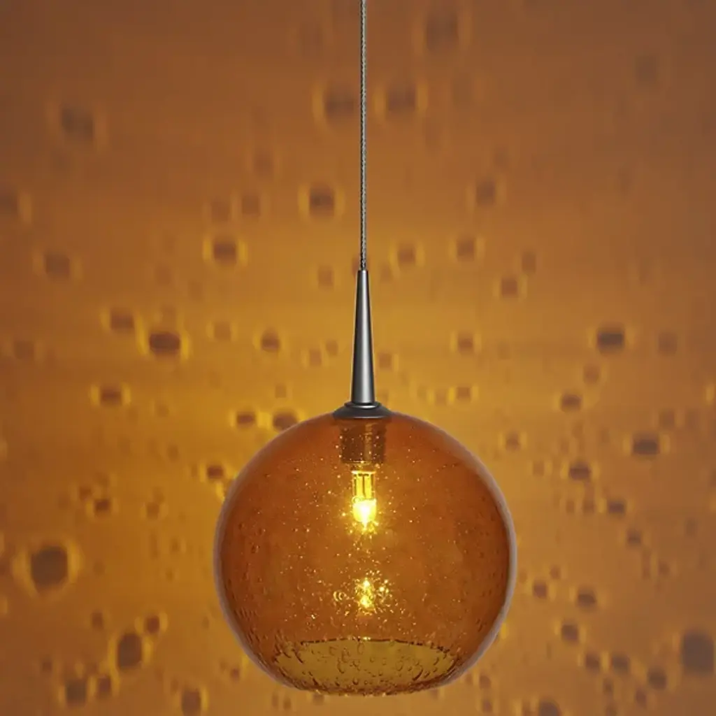 Sleek and sparkly with modern appeal. Tiny bubbles embedded in the handblown Artisan Glass shade of the Bobo 2 LED Mini Pendant by Bruck Lighting result in a stunning lighting effect that embodies the design philosophy of "less is more." From a distance, its subtleties aren't given away and its contemporary aesthetic makes it a great fit for modern kitchens, hallways, foyers and living rooms. The Metal base is tapered and especially slim to bring more attention to the orb-like shade and its bubbly texture. When mounted in a series above a mini bar, dining table or kitchen island, its minimalist design lends an effortlessly stylish air about this fixture.