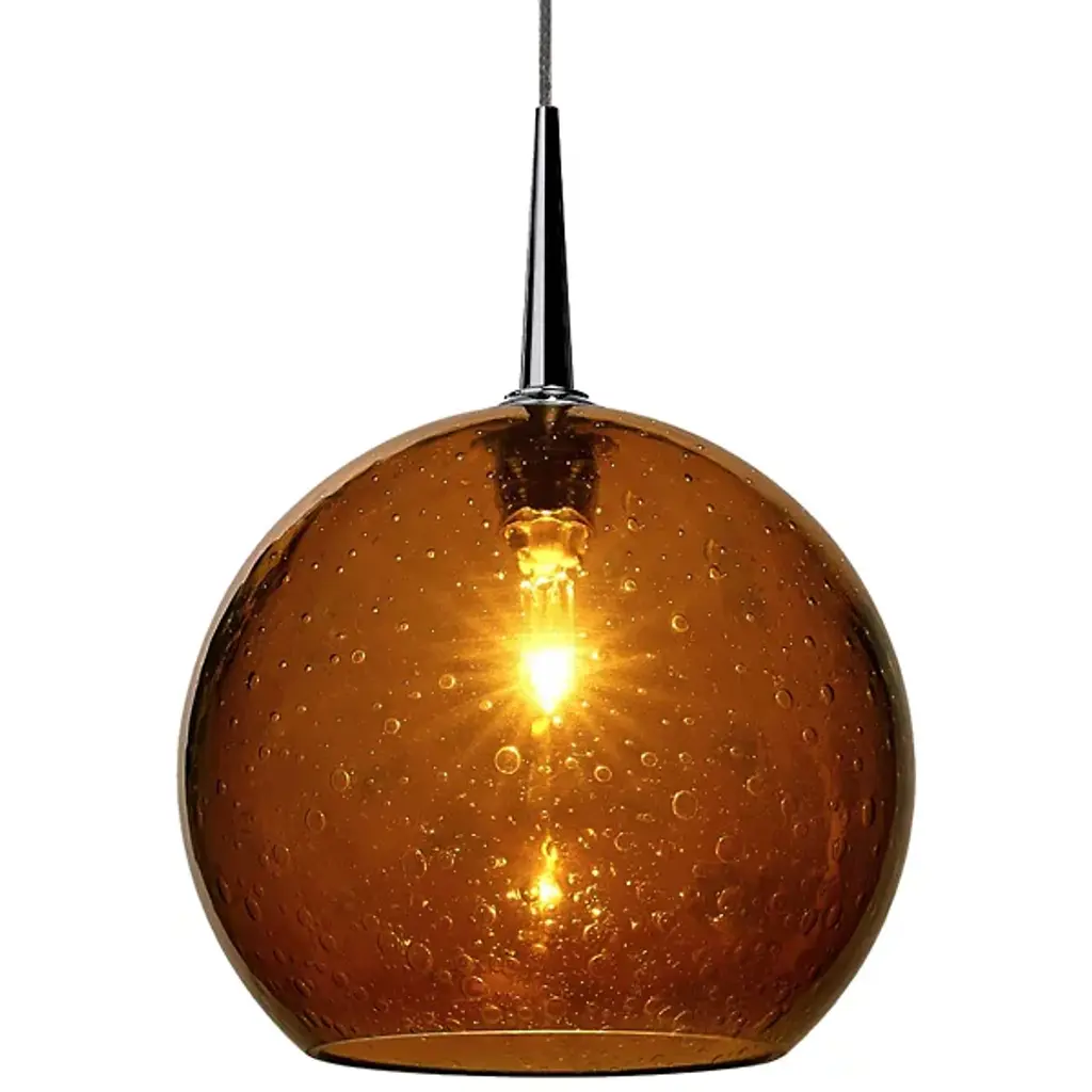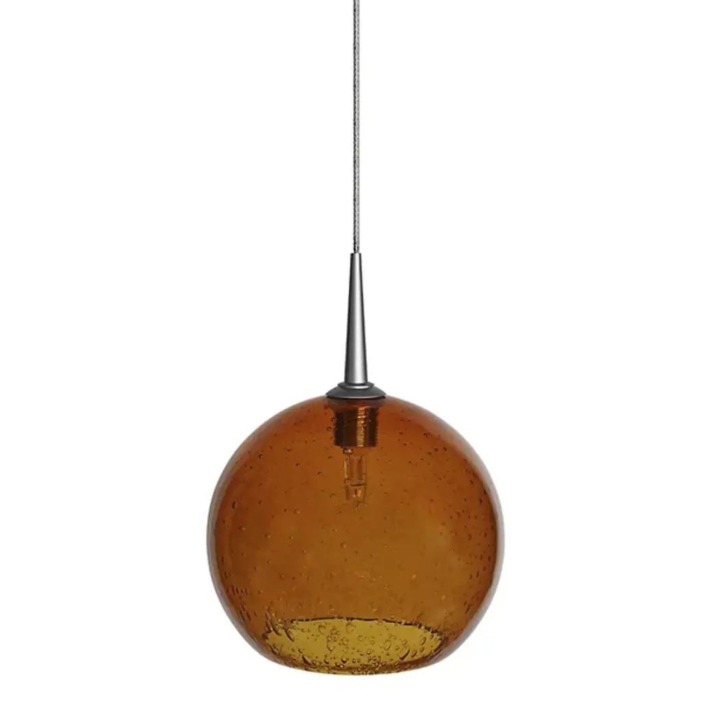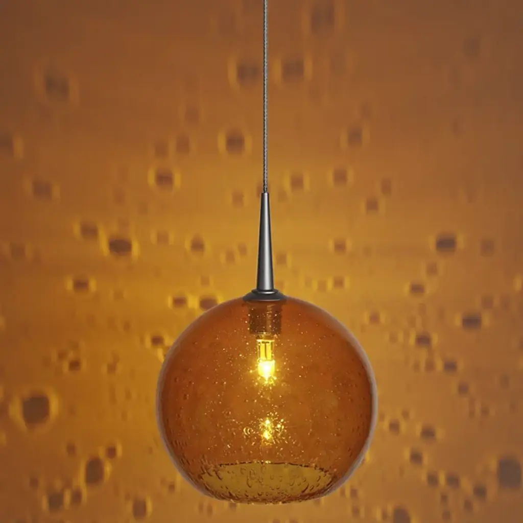An effervescent globe of hand-blown artisan glass gives the Bruck Lighting Bobo II Mini Pendant a light, airy feel. Spotted with hundreds of bubbles in all manner of size and shape, the translucent shade creates a scattered pattern on its surroundings. Sidle up beneath one and experience its fizzy nature, which is enhanced when hung in groups.