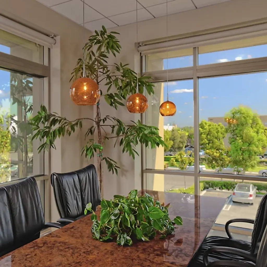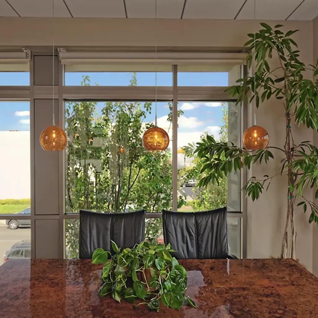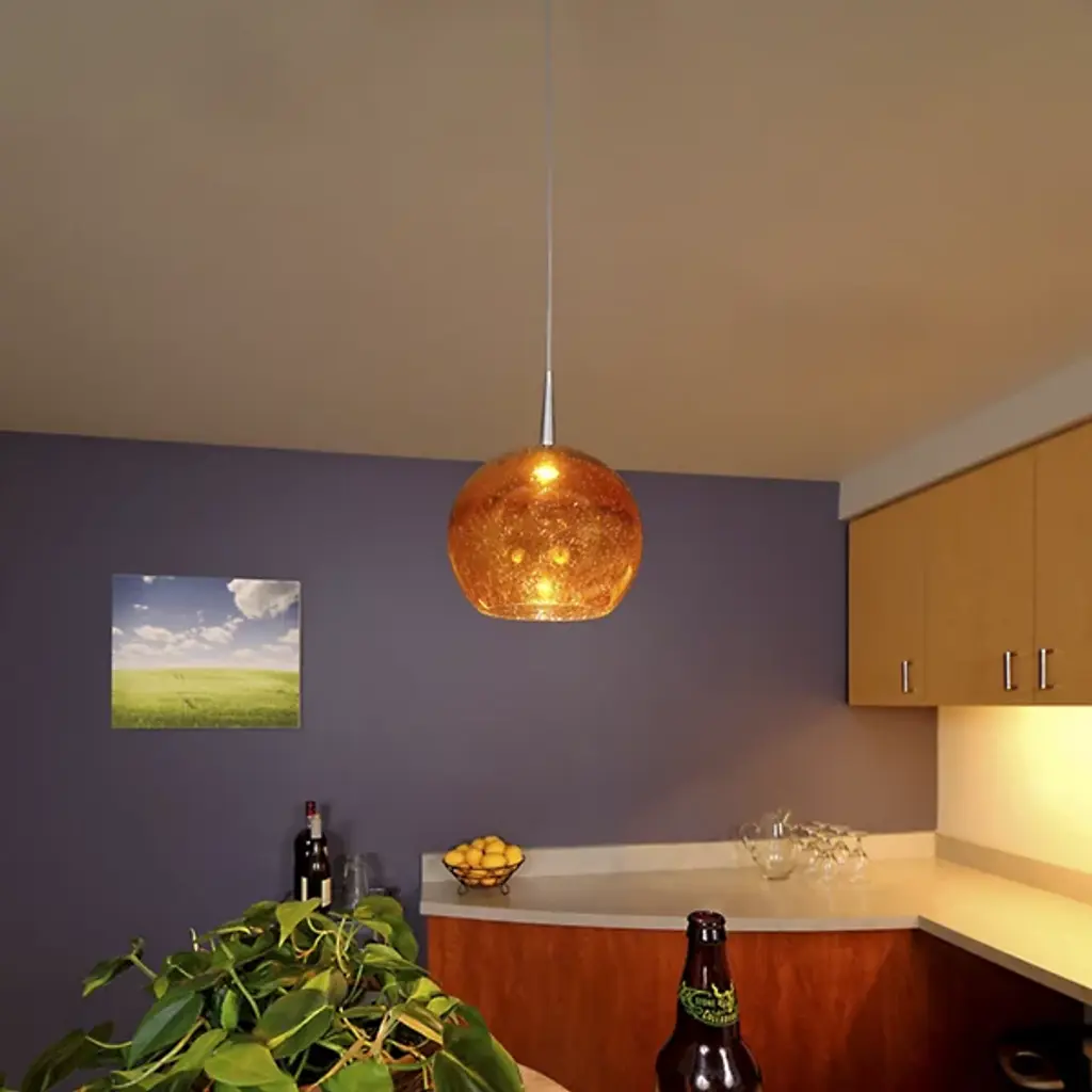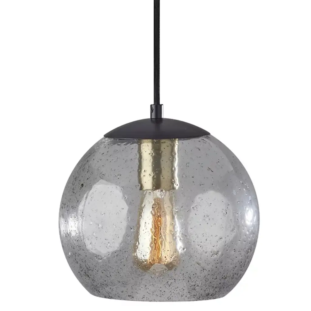 An effervescent globe of hand-blown artisan glass gives the Bruck Lighting Bobo II Mini Pendant a light, airy feel. Spotted with hundreds of bubbles in all manner of size and shape, the translucent shade creates a scattered pattern on its surroundings. Sidle up beneath one and experience its fizzy nature, which is enhanced when hung in groups.