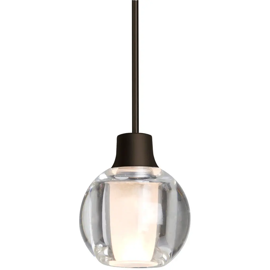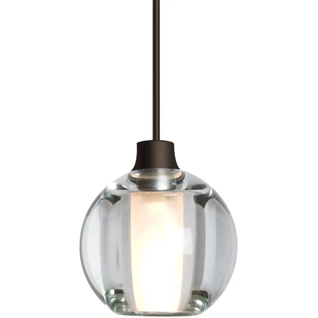 The Boca LED Mini Pendant is comprised of an appealing globe-shaped clear solid glass, accented by an interesting inner frosted tube to diffuse the light source. The splash of concealed LED illumination through the solid glass makes the Boca 3 a stunning display of light refractions. The 12V cord pendant fixture is equipped with a 10' braided coaxial cord with teflon jacket and a low profile flat monopoint canopy. These stylish and functional luminaries are offered in a beautiful Black finish.