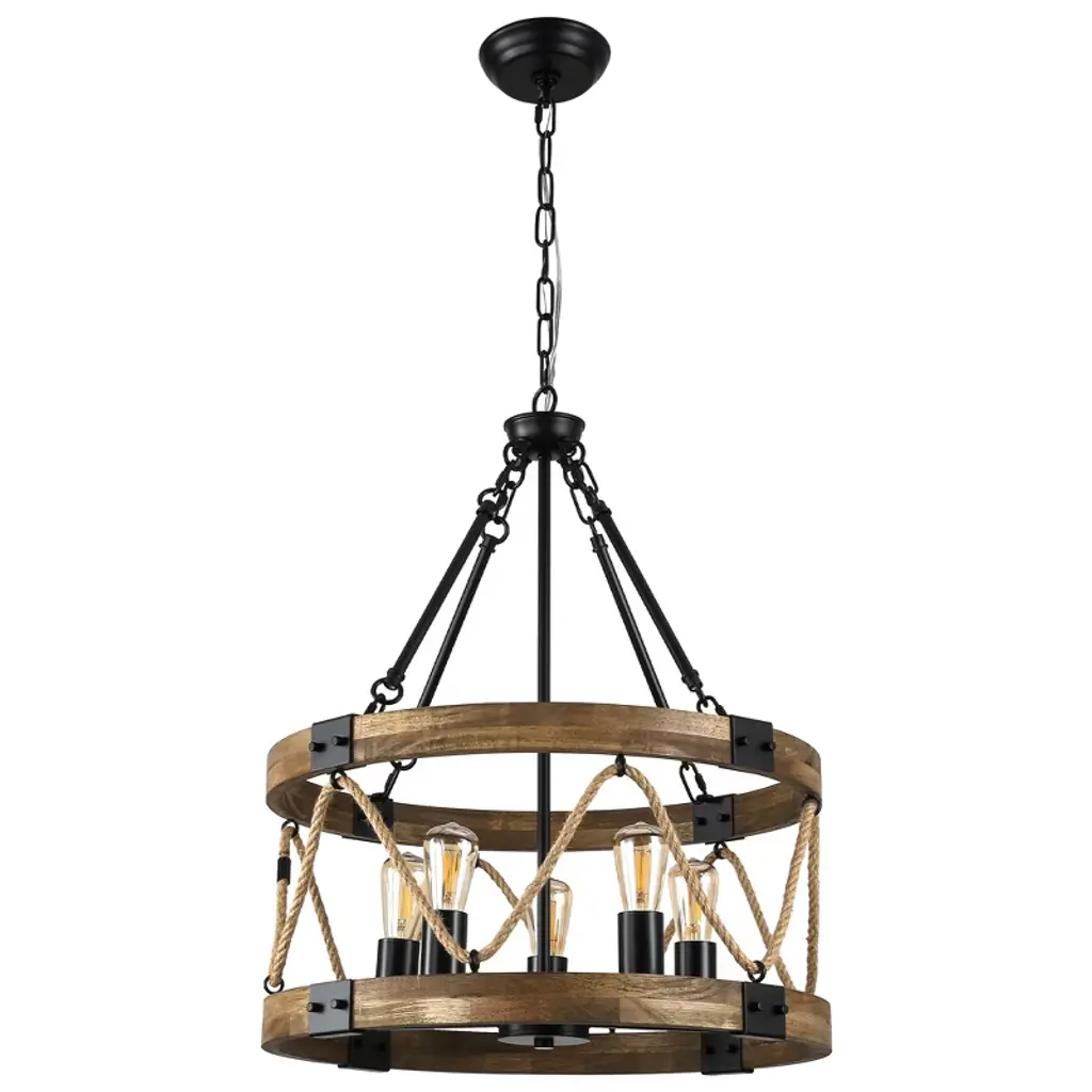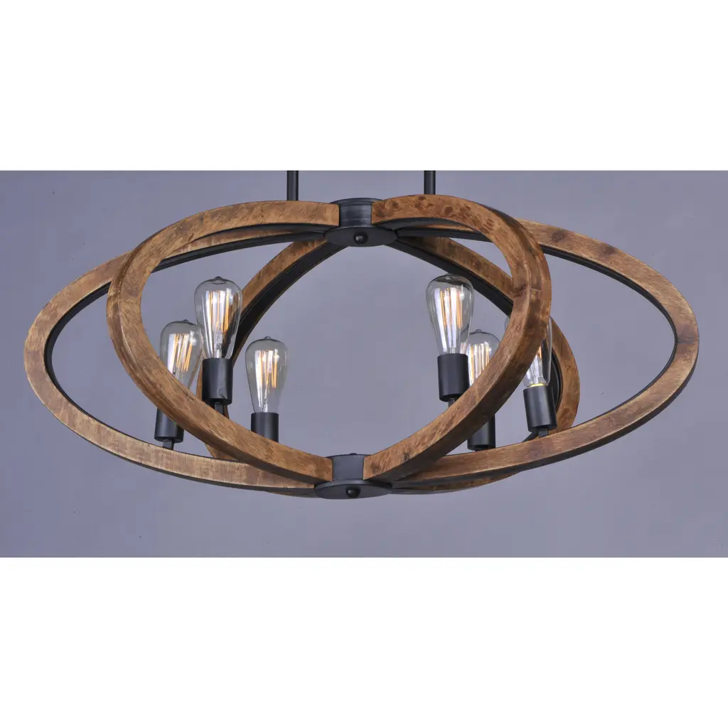Rings of Ash wood are distressed and then finished In Antique Pecan for that old world feel. Metal accents finished in Anthracite provide a forged iron appearance that complements this rustic design.